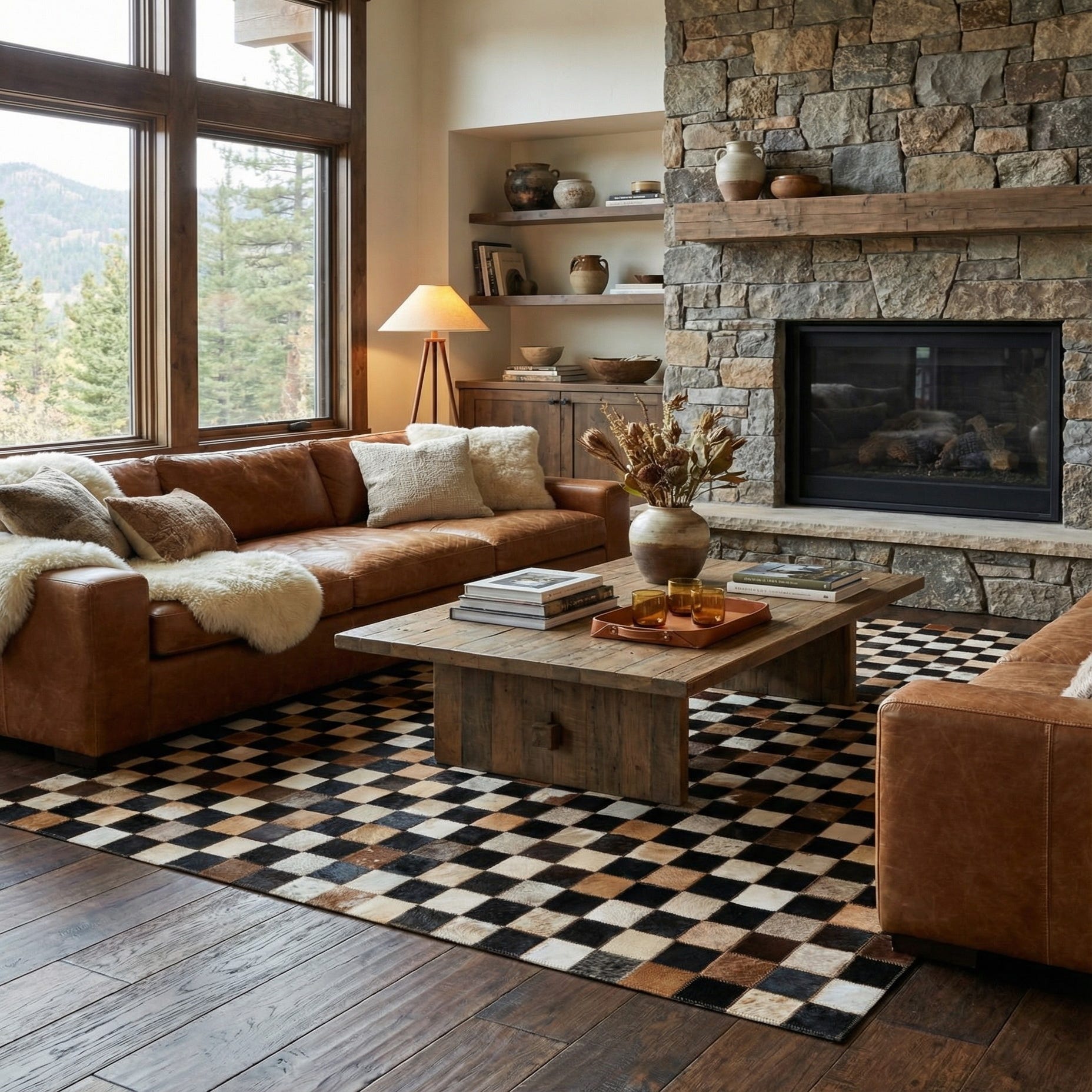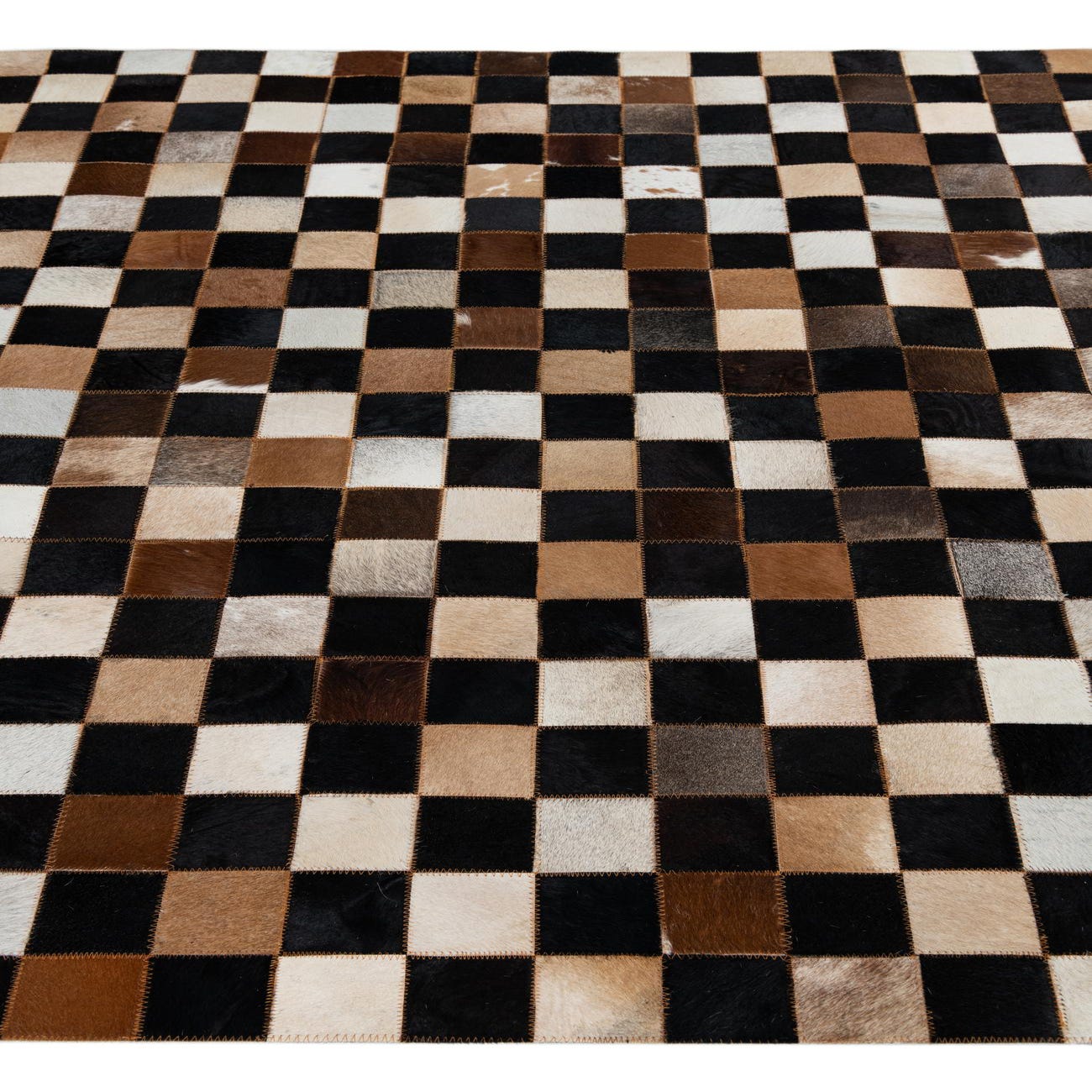 A 5x8 rectangular Cowhide Leather rug featuring a modern checkered pattern in multi-colored patches of black, brown, and white.