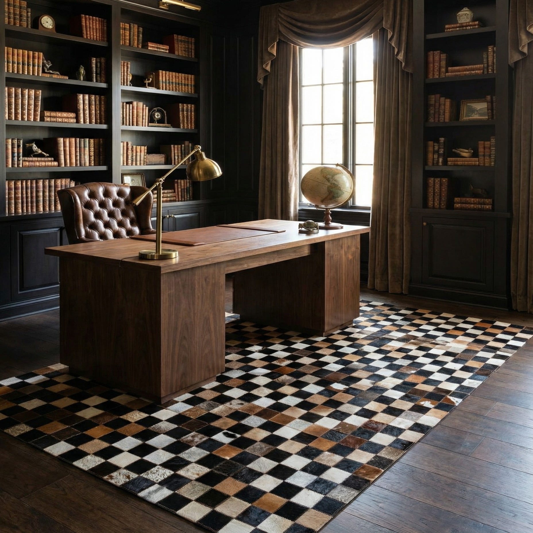 A 5x8 rectangular Cowhide Leather rug featuring a modern checkerboard pattern in black, white, and various shades of brown.