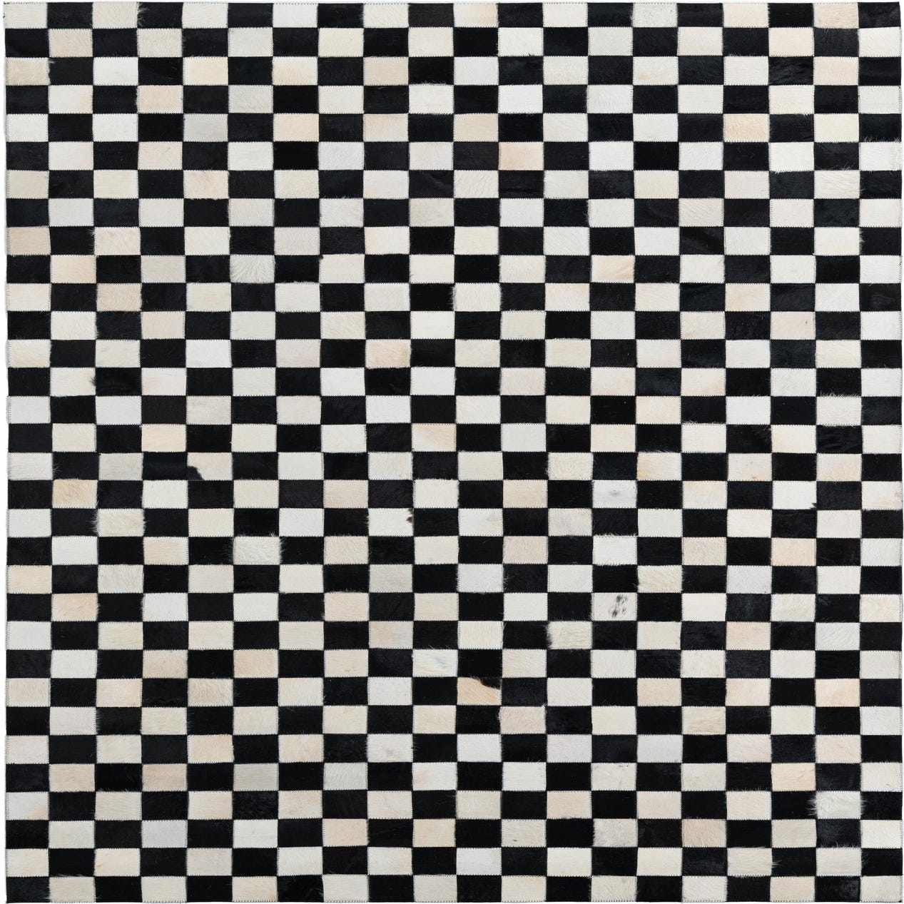 A 5x8 rectangular Cowhide Leather rug featuring a bold, modern checkerboard pattern in black and off-white squares.