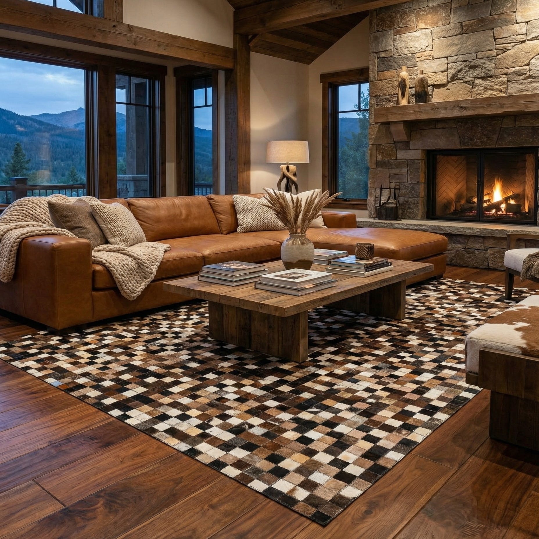 The rug's stylish geometric pattern makes it a fitting choice for multiple interior design scenarios, particularly complementing contemporary, modern, or eclectic decor. It would serve as a bold statement piece in a minimalist setting or blend harmoniously with the warm, earthy tones of a rustic interior. The natural variation in the cowhide pieces ensures that each rug is unique, offering individual character to your living space.