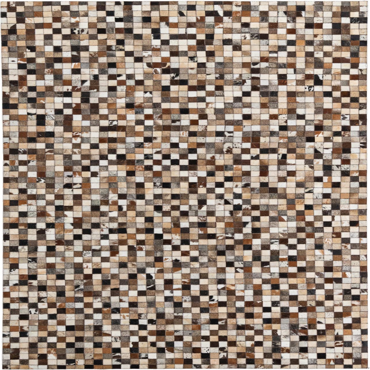 A 5x8 rectangular Cowhide Leather rug featuring a modern, abstract patchwork of multi-colored squares.
