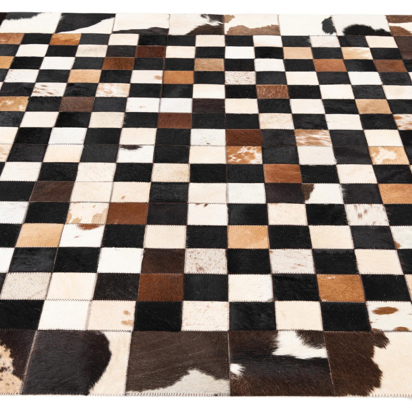 A rectangular 5x8 multi-colored modern cowhide and leather rug featuring a checkerboard pattern with brown, black, and white squares.