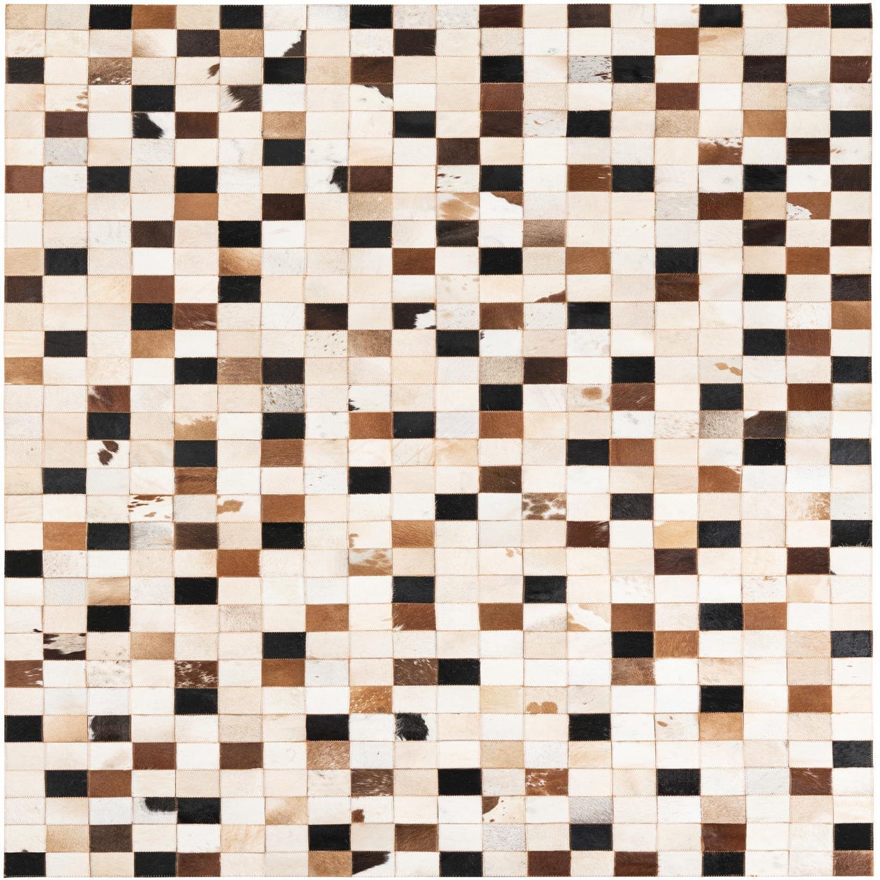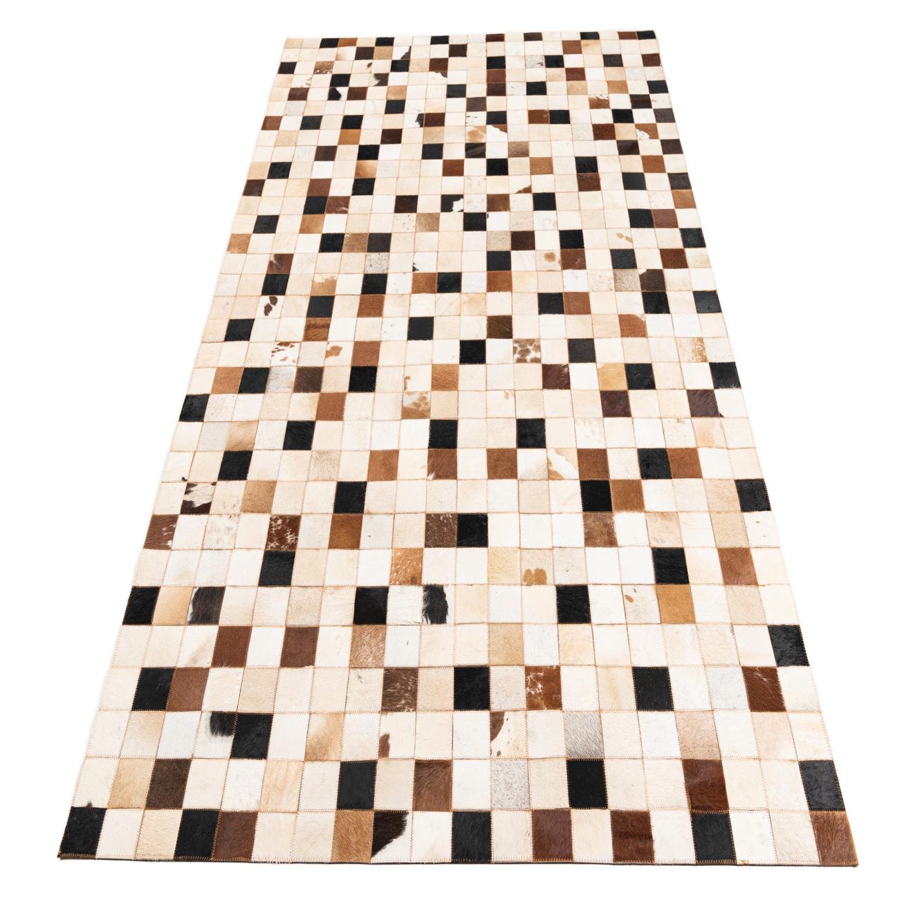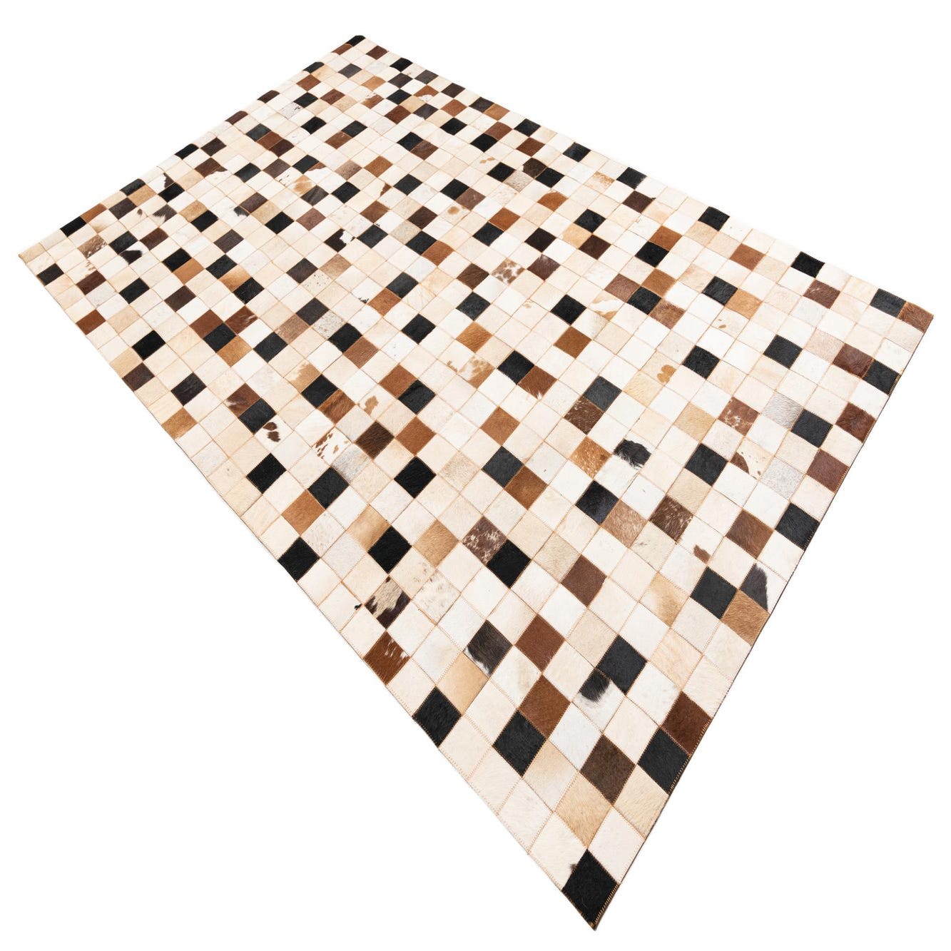 A 5x8 rectangular Cowhide Leather rug featuring a modern patchwork design with multi-colored squares in shades of white, brown, and black.