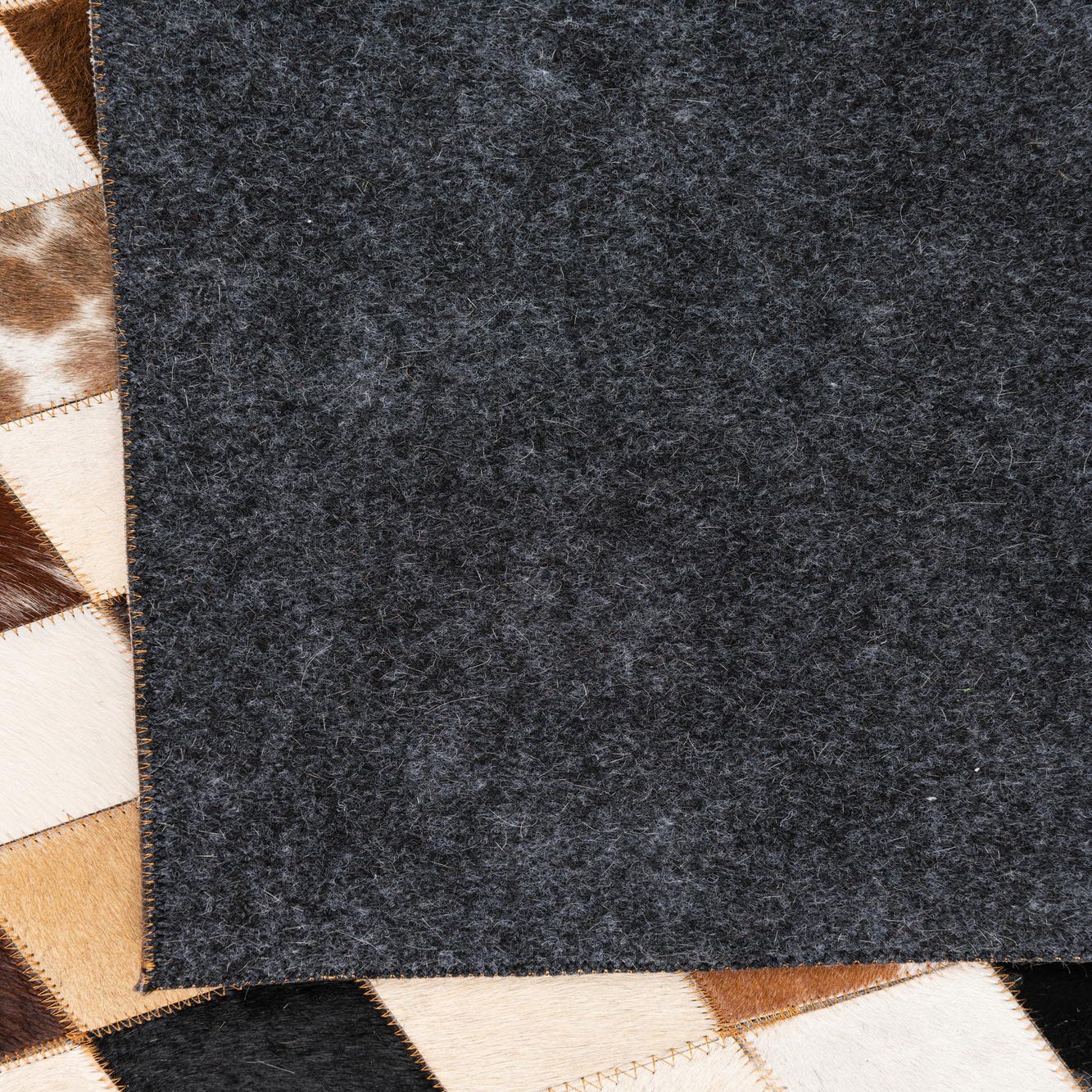 The tactile quality of the cowhide and leather materials used in this rug provides a luxurious feel underfoot, while the craftsmanship ensures durability. This rug is ideally suited for interiors that celebrate natural materials and textures, such as rustic, farmhouse, or modern industrial spaces. Its earthy colors and striking pattern make it a versatile addition, elevating the aesthetic of any room, be it a living area, home office, or an eclectic loft space. Its design is conducive to pairing with both understated and bold furnishings, allowing it to serve as a focal point or a complementary element within various decor styles.