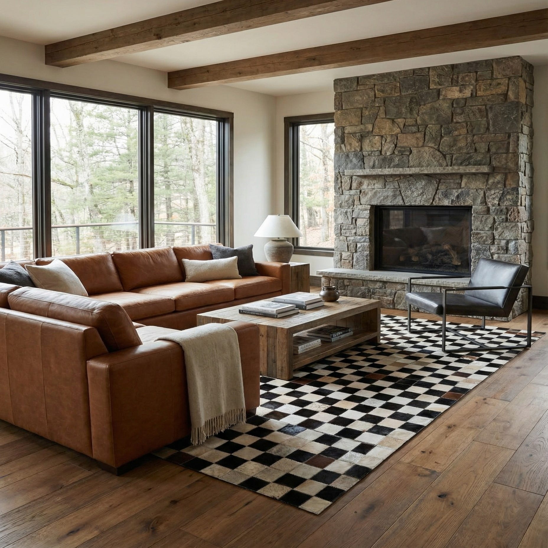 The versatile color palette and dynamic geometric pattern make this rug suitable for a variety of interior design scenarios. It would complement a modern or contemporary space with its clean lines and would equally enhance a rustic or industrial setting due to the natural textures of the cowhide. This rug can serve as a statement piece in a minimalist design, adding warmth and richness, or it can integrate well into a more eclectic decor, where its distinct pattern can harmonize with a mix of styles and furnishings.