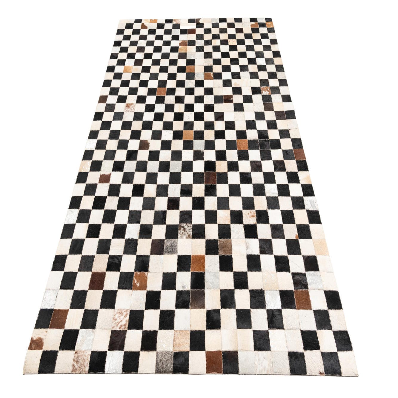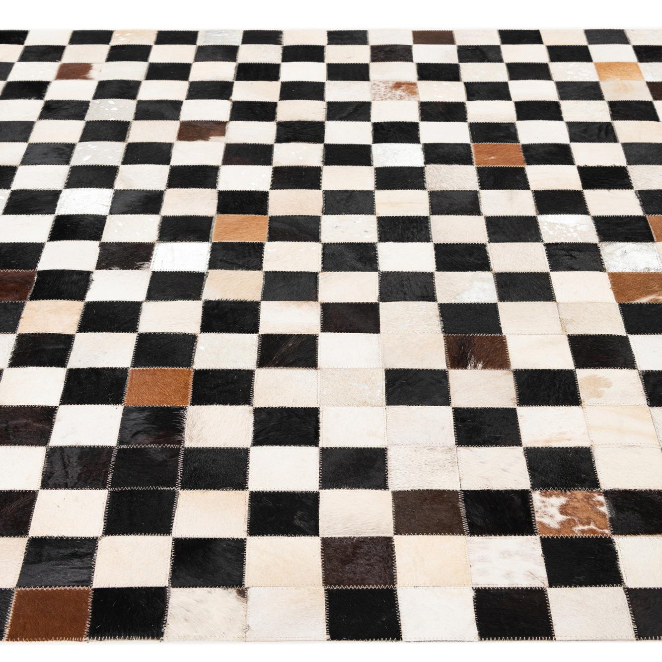A 5x8 rectangular Cowhide Leather rug featuring a modern checkerboard pattern in black, white, and various brown tones.