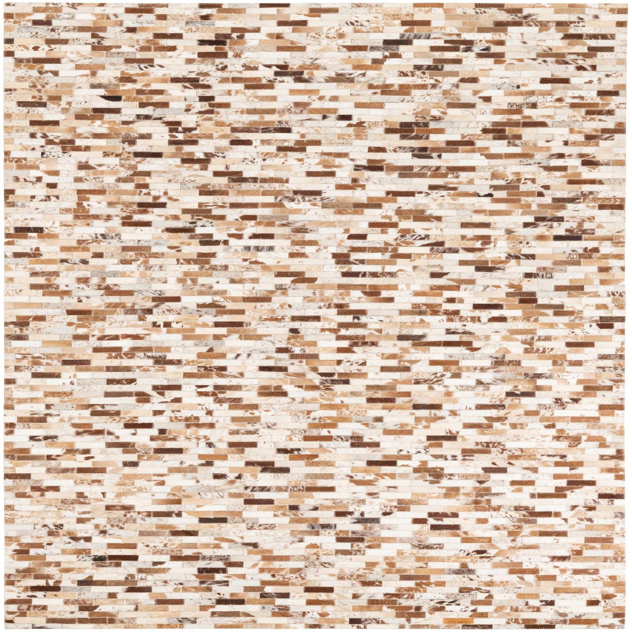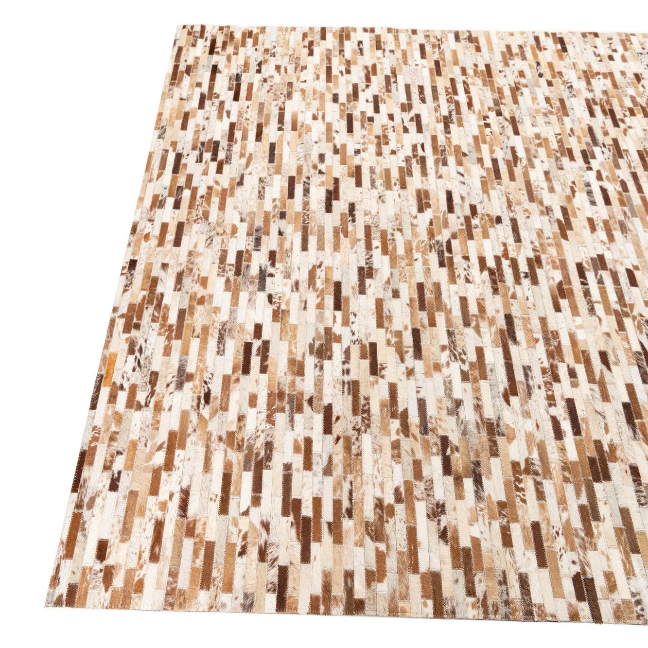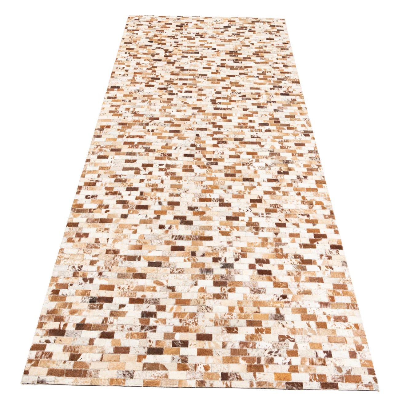 This piece would integrate seamlessly into interiors hinting at rustic elegance or serve as an accent to contemporary spaces that embrace natural textures and understated sophistication. It would be equally at home in minimalist decors to add warmth and interest or within eclectic settings where its varied tones can complement a mix of furnishings and accessories. The natural durability of leather makes this rug appropriate for both private and semi-formal areas of the home or office.