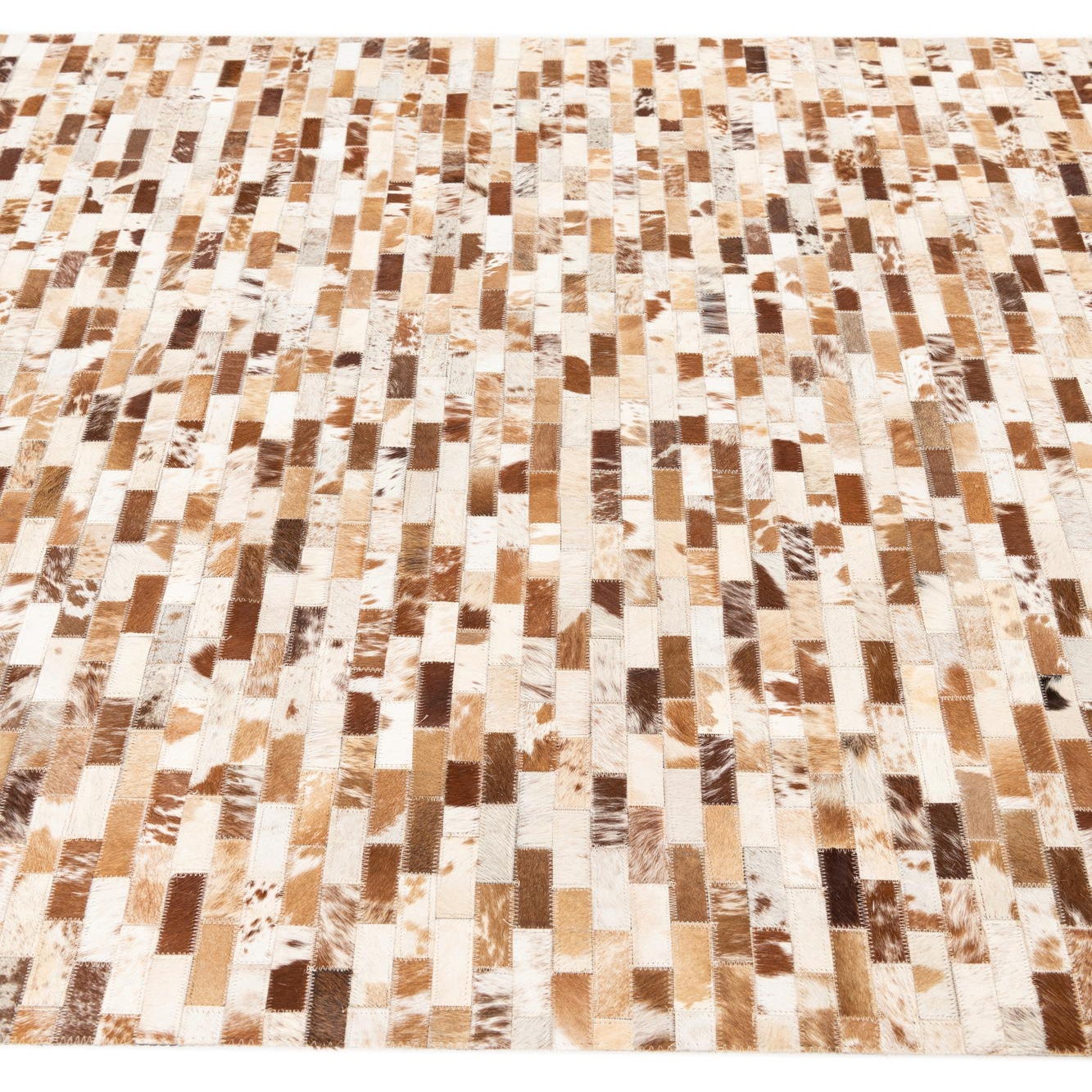 This Cowhide Leather rug from the Cowhide Leather collection offers a distinctive and modern patchwork design, handcrafted from genuine cowhide and leather materials. The rug size is an adaptable 5x8, making it a versatile choice for many spaces. The rug's pattern features an array of natural hues including beige, black, brown, light brown, and multi-color segments that create an eclectic and dynamic visual texture.