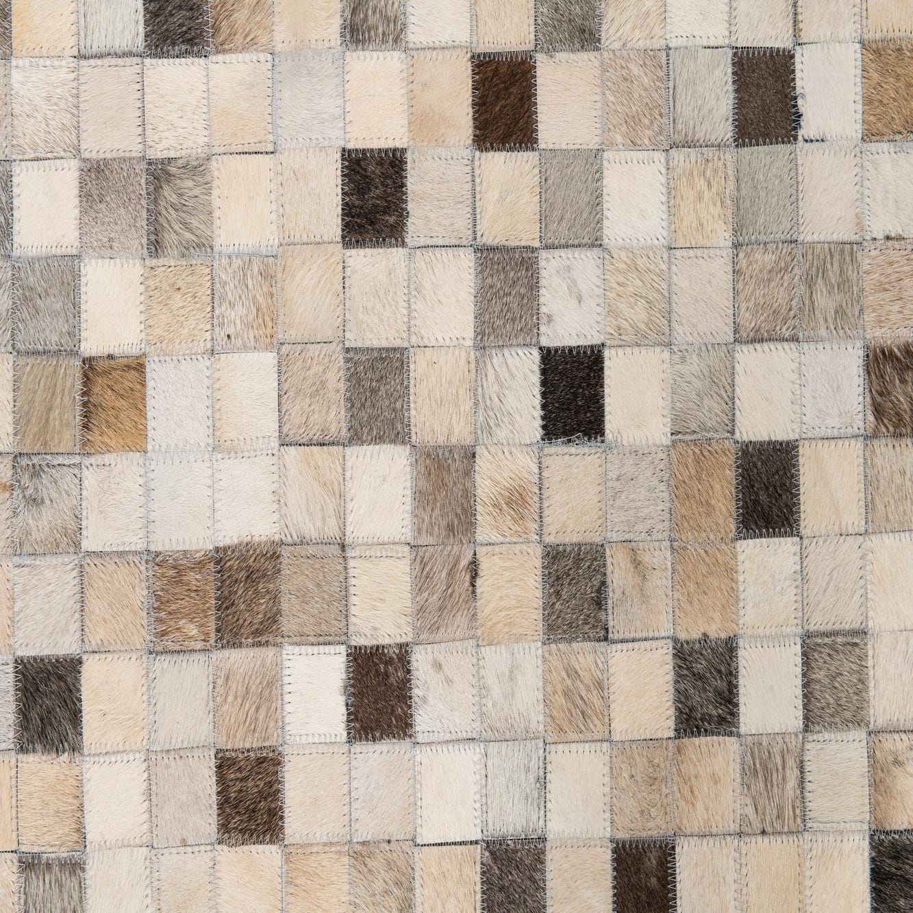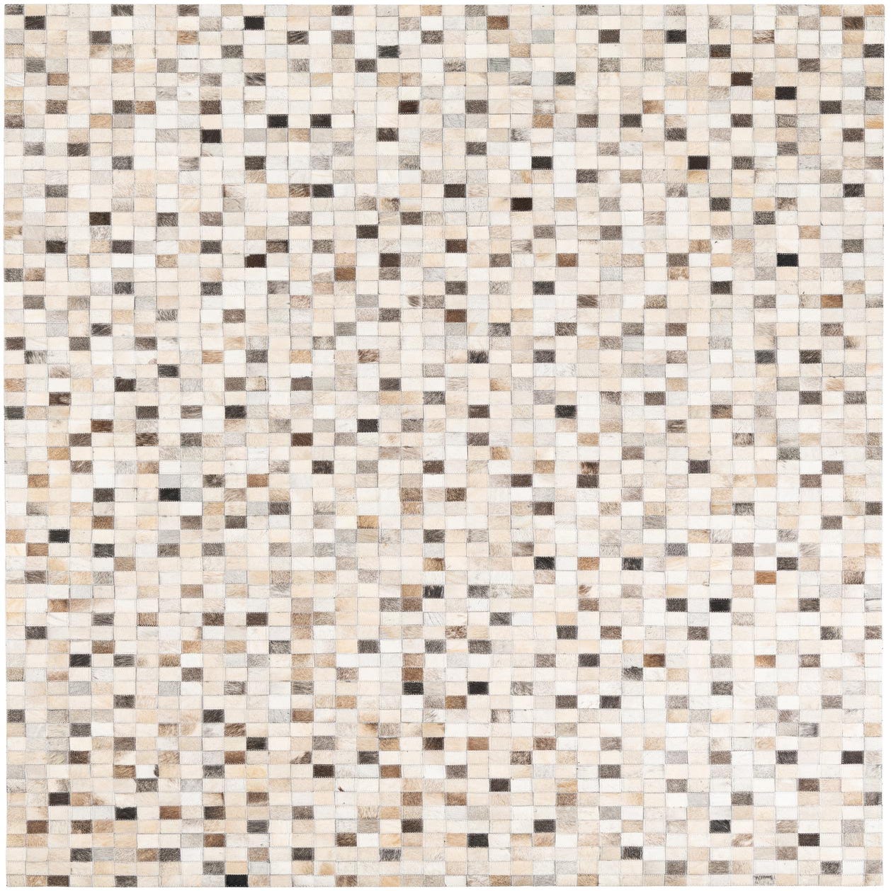 The Cowhide Leather collection 5x8 rug is a testament to handcrafted quality and natural allure. This piece's design showcases a myriad of small squares in varying shades of beige, black, brown, gray, and ivory, assembled in a mosaic-like pattern that exudes an organic and contemporary aesthetic. The natural textures of cowhide and leather lend a unique tactile experience, with each segment contributing to a collage of neutral tones set against a multi-colored background.