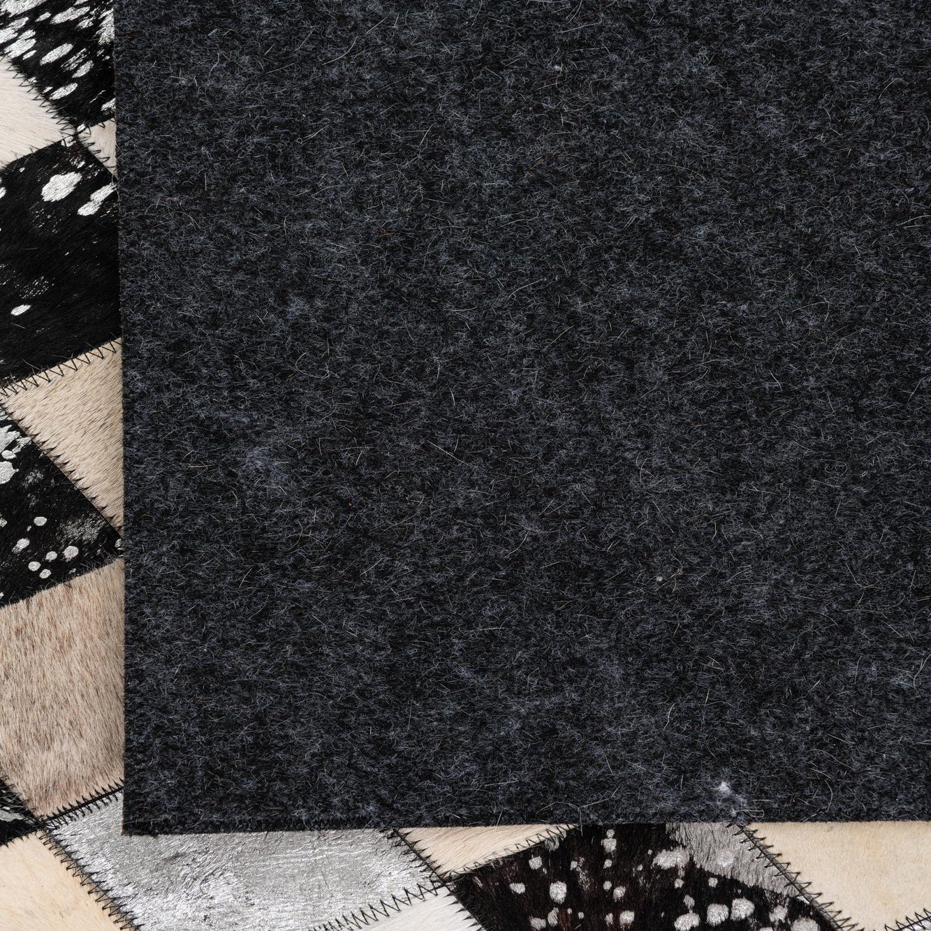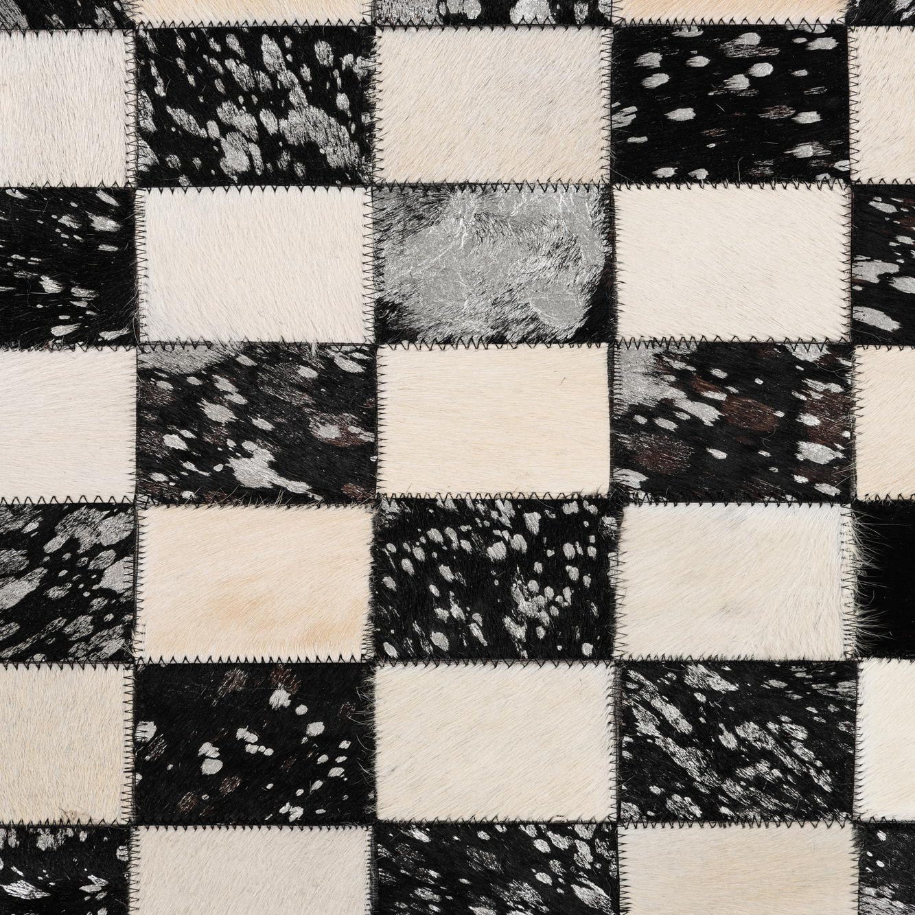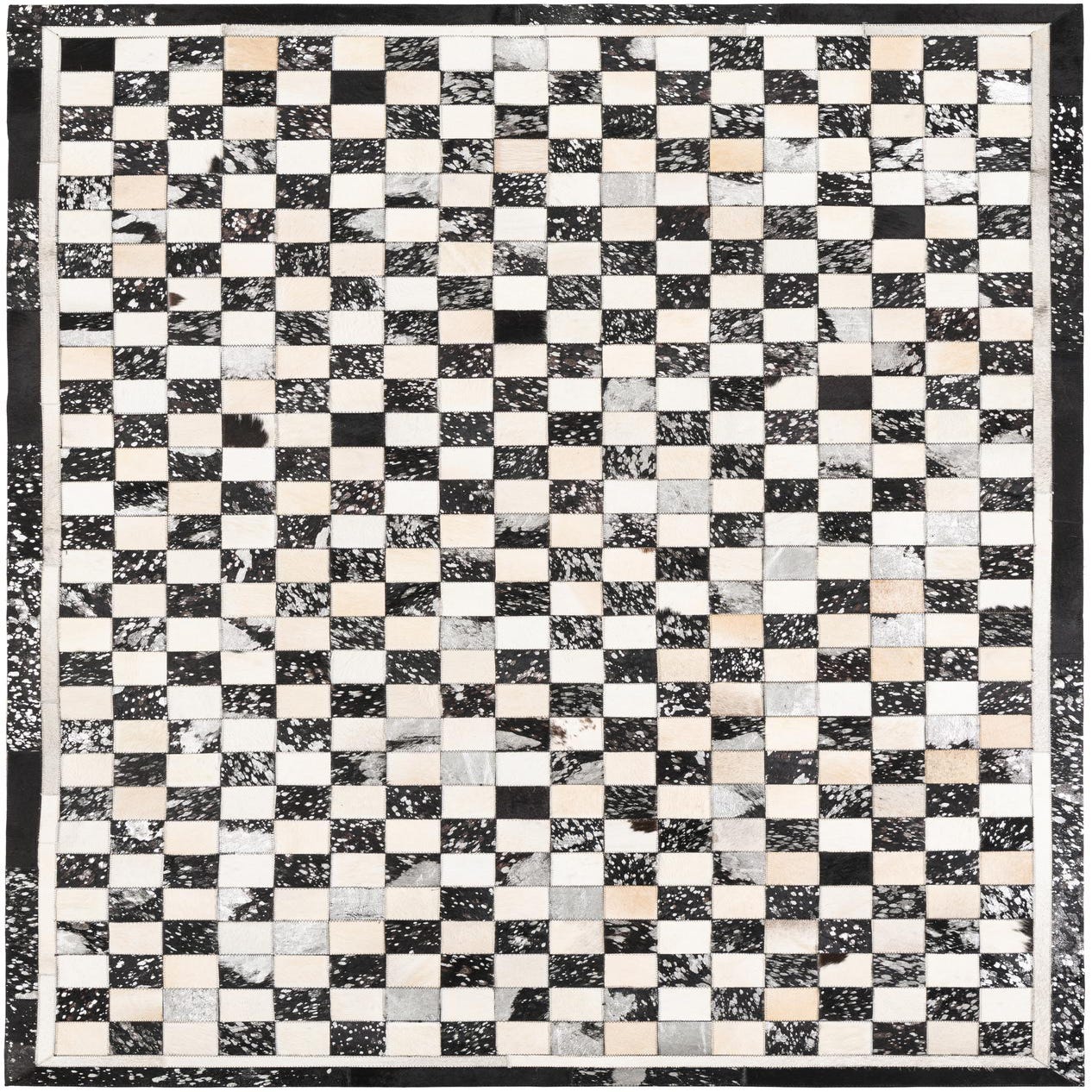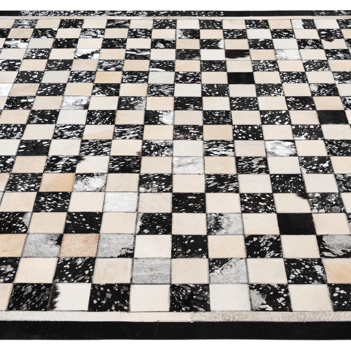 A 5x8 rectangular Cowhide & Leather rug featuring a modern checkered pattern in black, white, and speckled multi-colored squares.