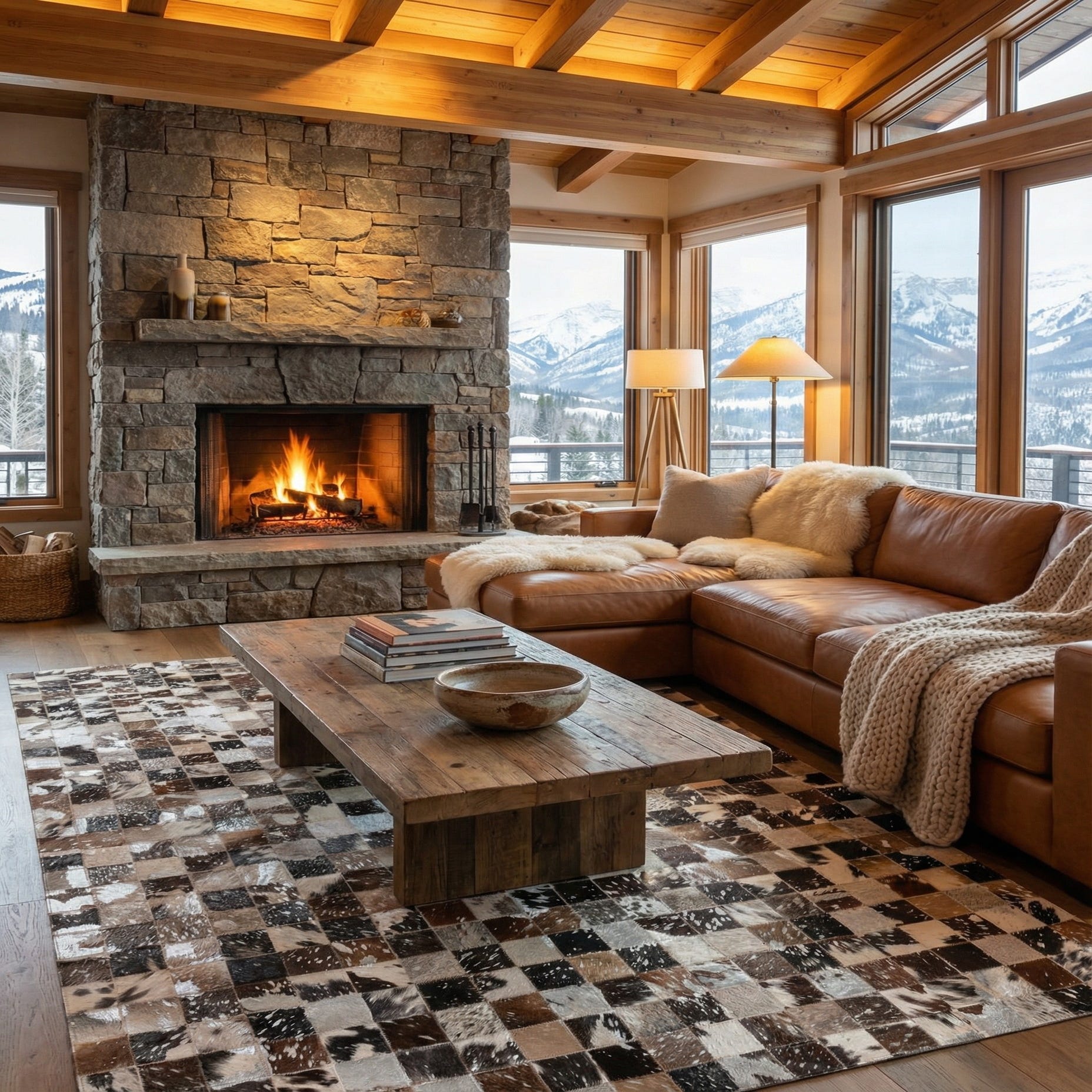 The checkerboard pattern lends a contemporary touch, making it suitable for an array of interior designs from minimalist and industrial to rustic and eclectic. Its hand-crafted construction delivers a tactile experience, with each square showcasing the inherent variations in texture and color that genuine cowhide presents.
