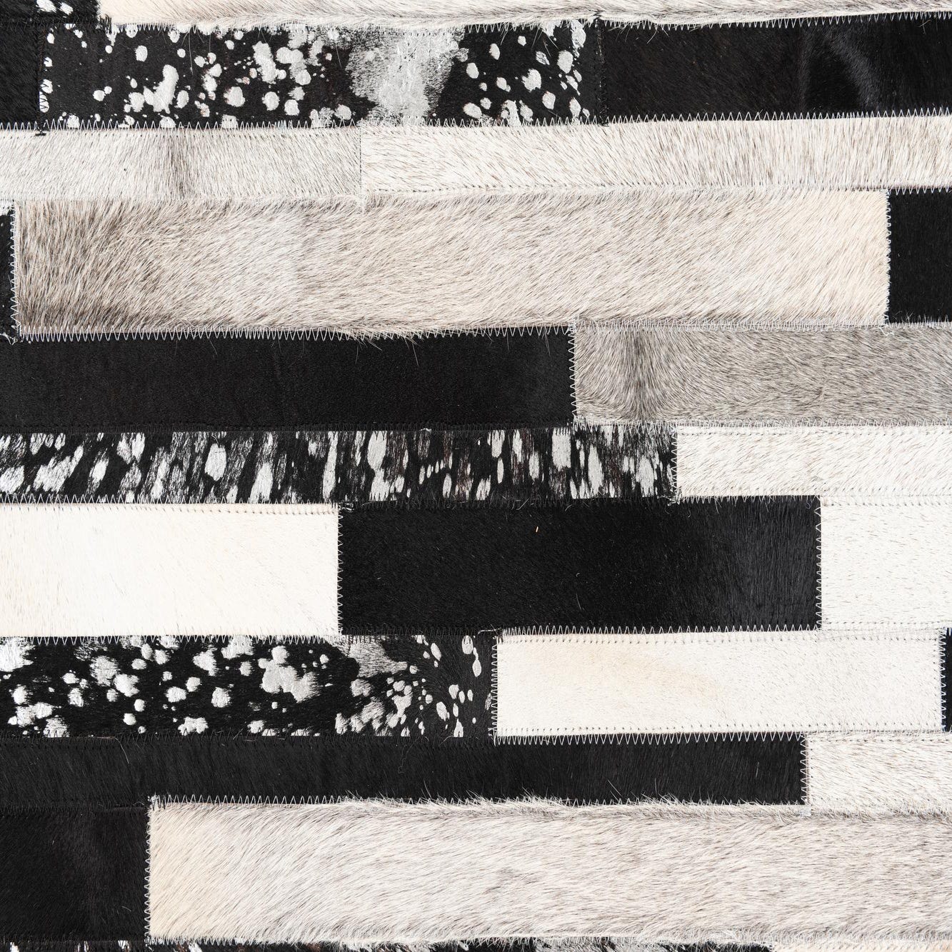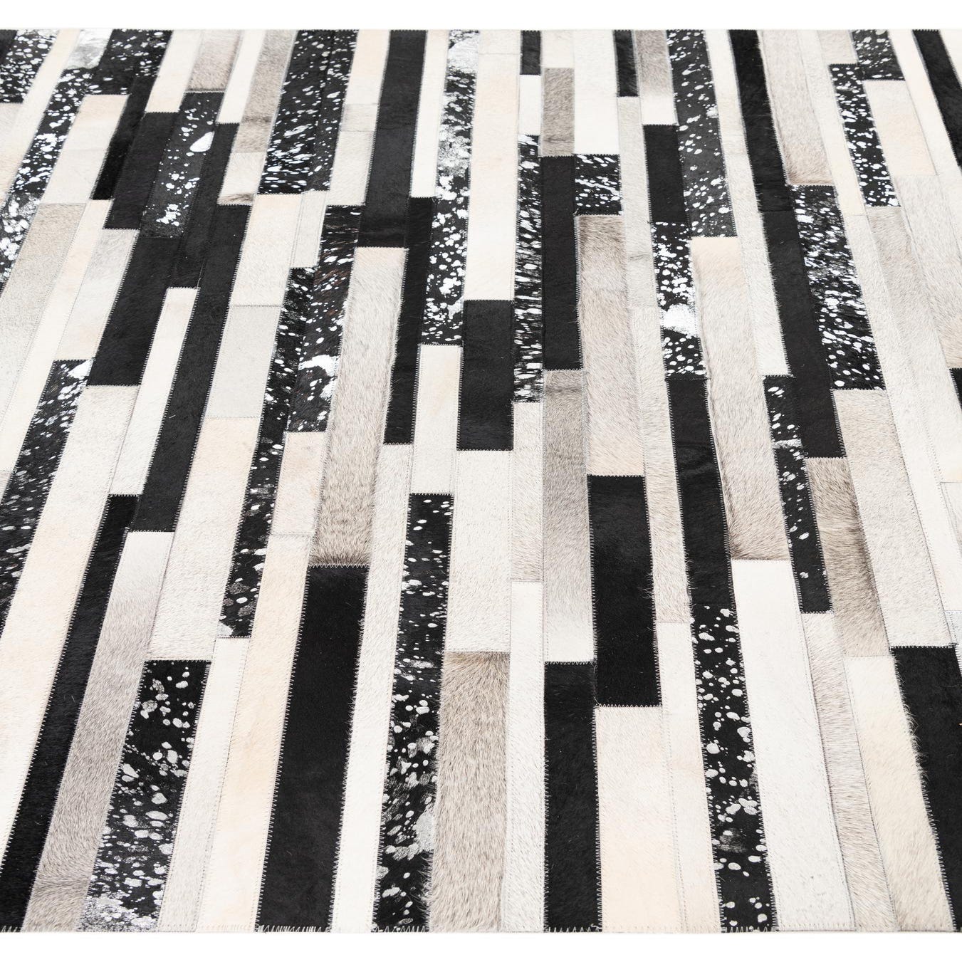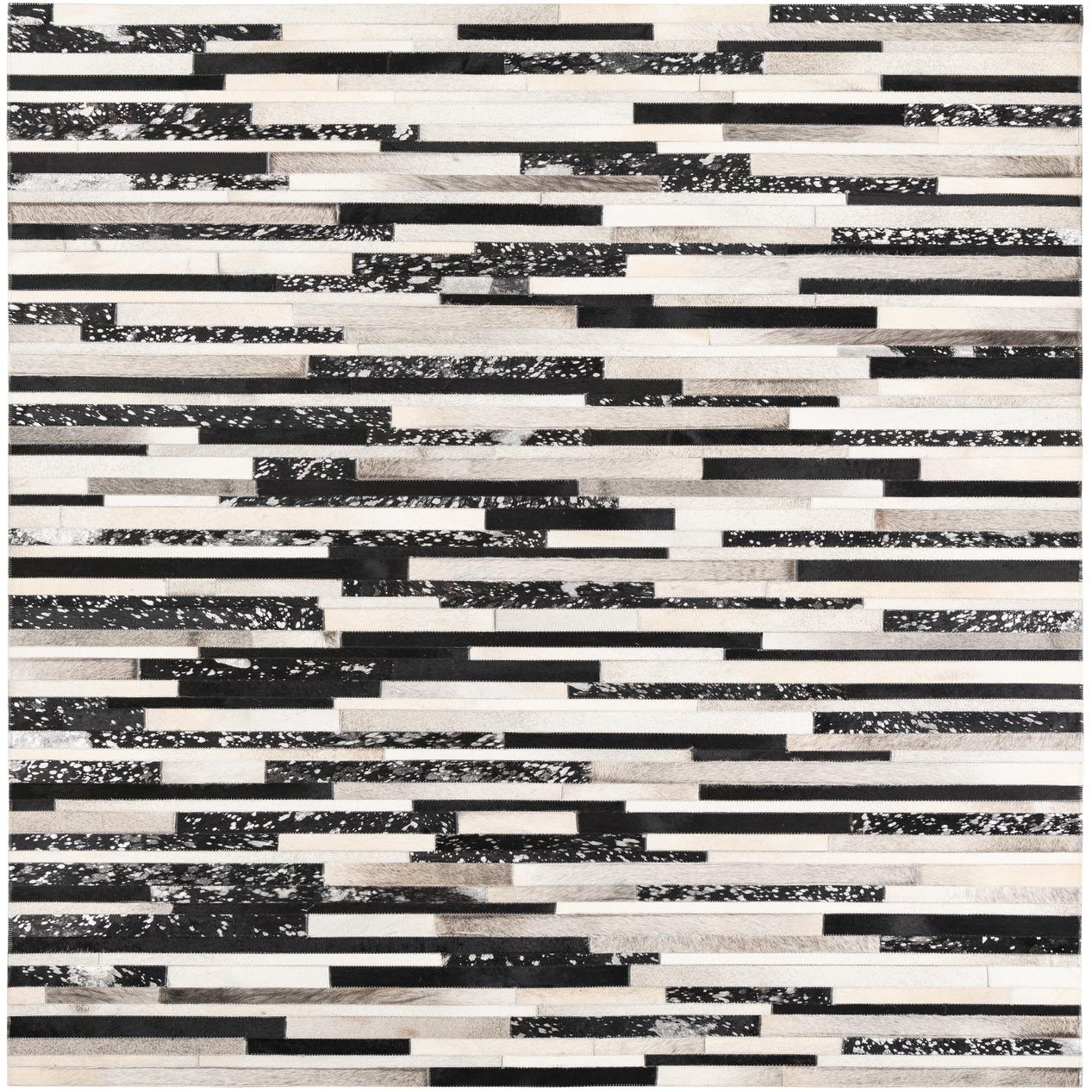 A rectangular 5x8 modern cowhide rug featuring a stripe pattern with black, white, and gray leather patches.