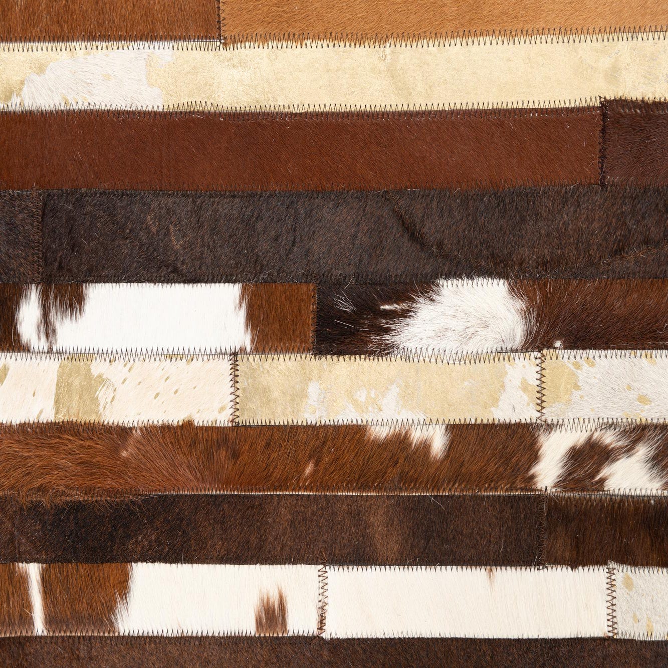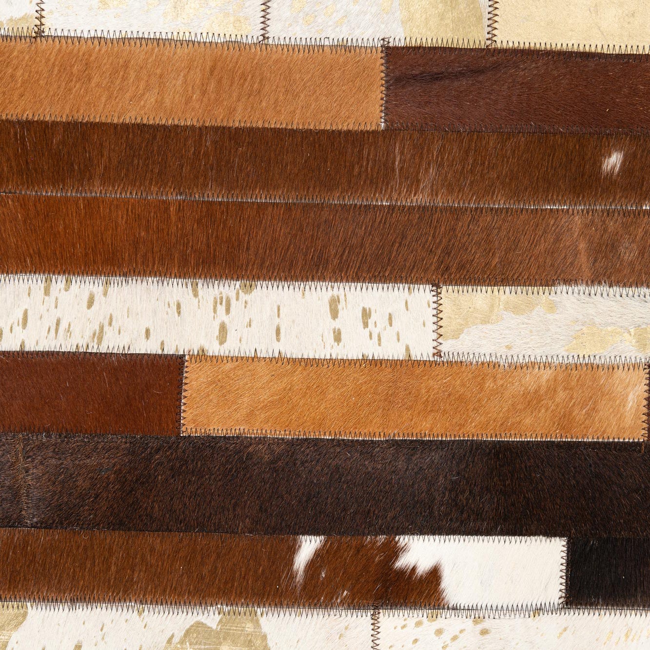 A 5x8 rectangular Cowhide Leather rug featuring a modern stripe pattern in multi-colored brown, white, and tan patches.