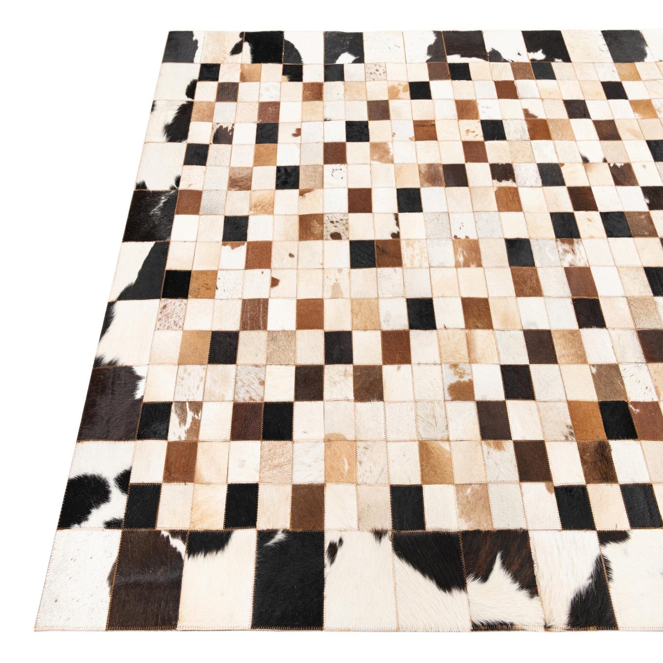 A tightly stitched checkerboard of small cowhide squares creates a graphic, mosaic surface in a multi background. Each patch alternates tones of beige, cream, light brown, brown, ivory and black, with natural spotting and subtle color variations that give the pattern depth without overwhelming the room. The hair-on-hide surface has a soft, slightly tactile nap and the visible stitching between tiles adds a gentle, handworked texture across the rug.