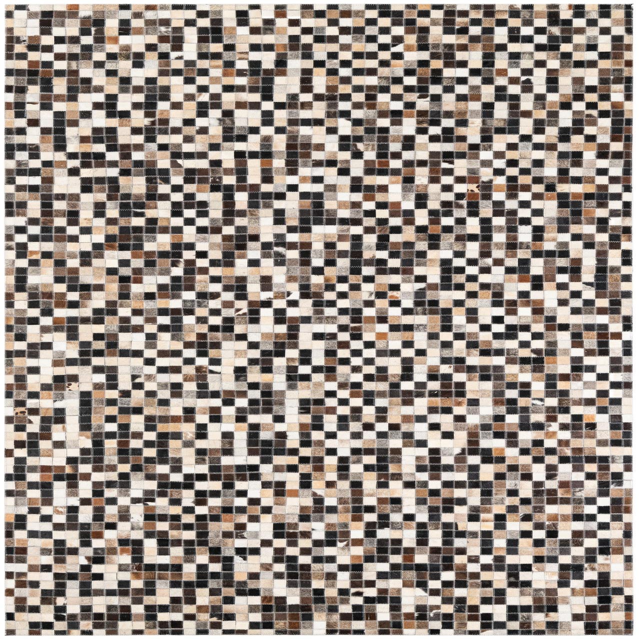 A 5x8 rectangular Cowhide Leather rug featuring a modern, abstract mosaic pattern of multi-colored squares in black, brown, and cream tones.