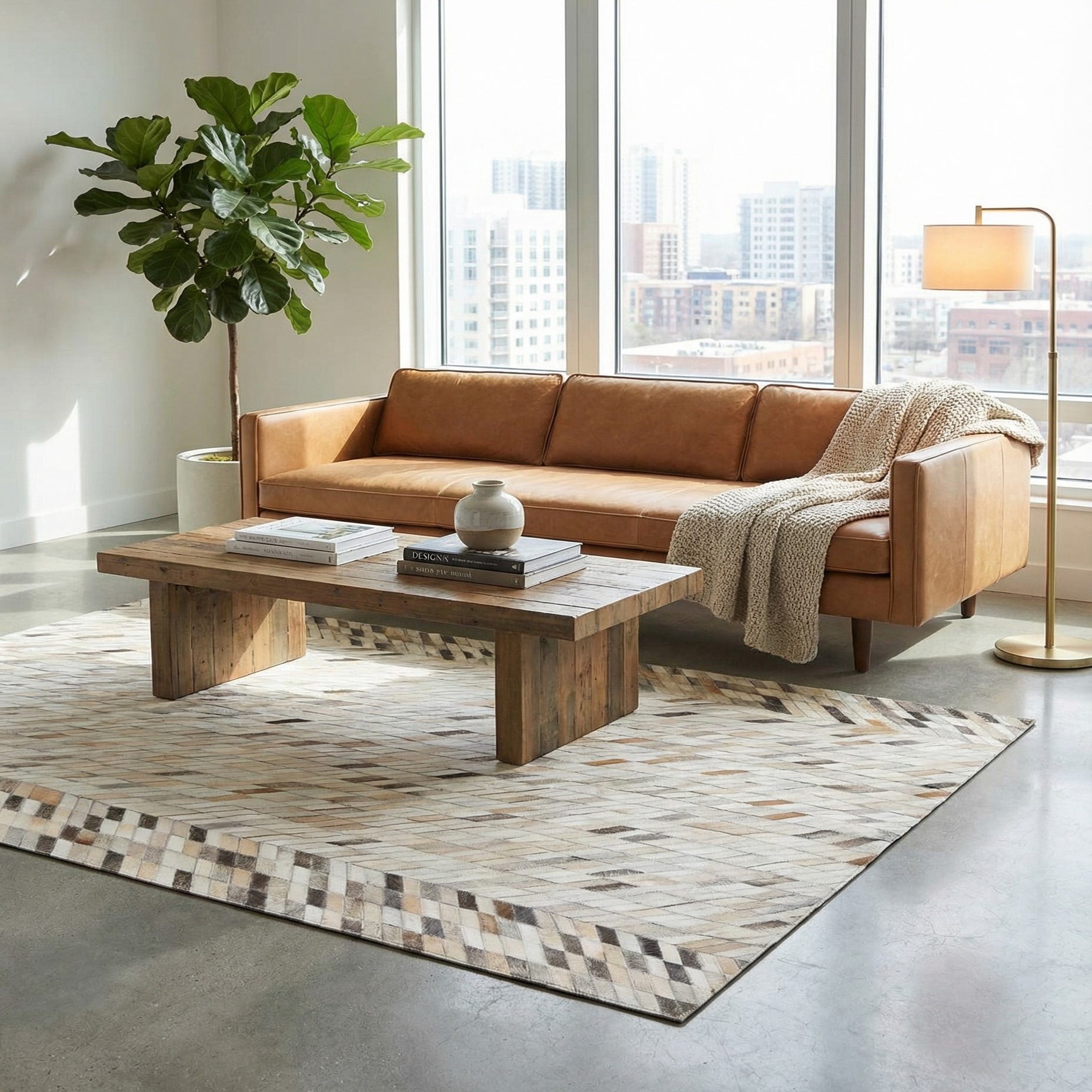A 5x8 rectangular Cowhide Leather rug featuring a modern abstract pattern of multi-colored diamond-shaped patches in shades of white, beige, brown, and grey.