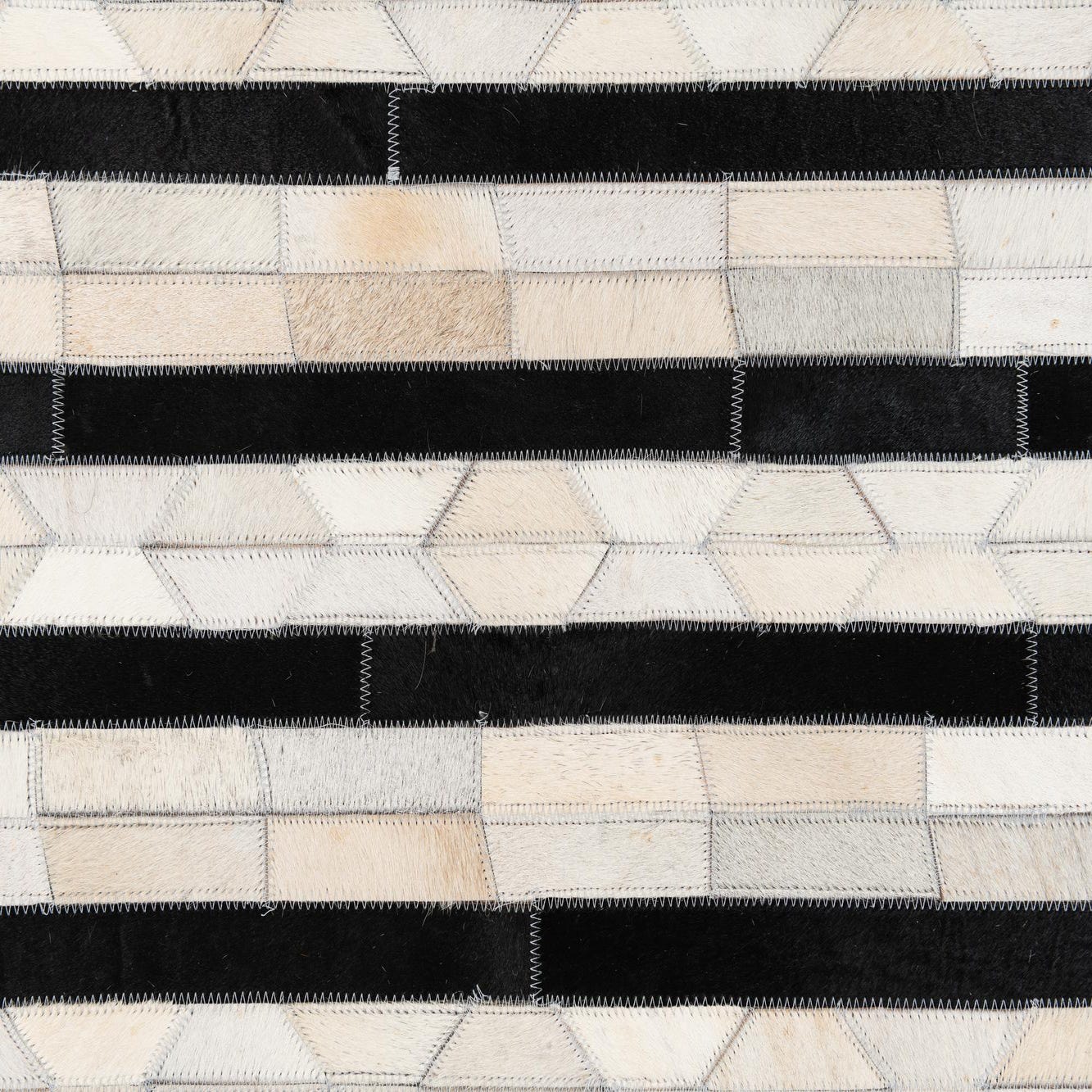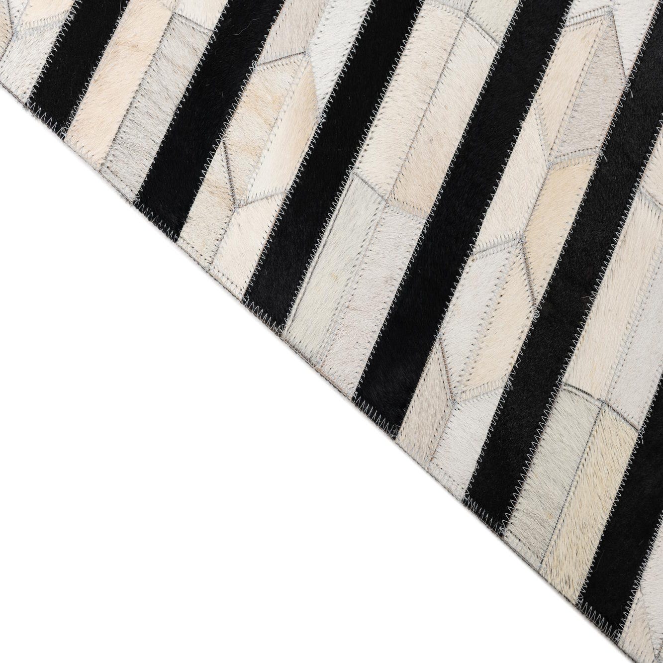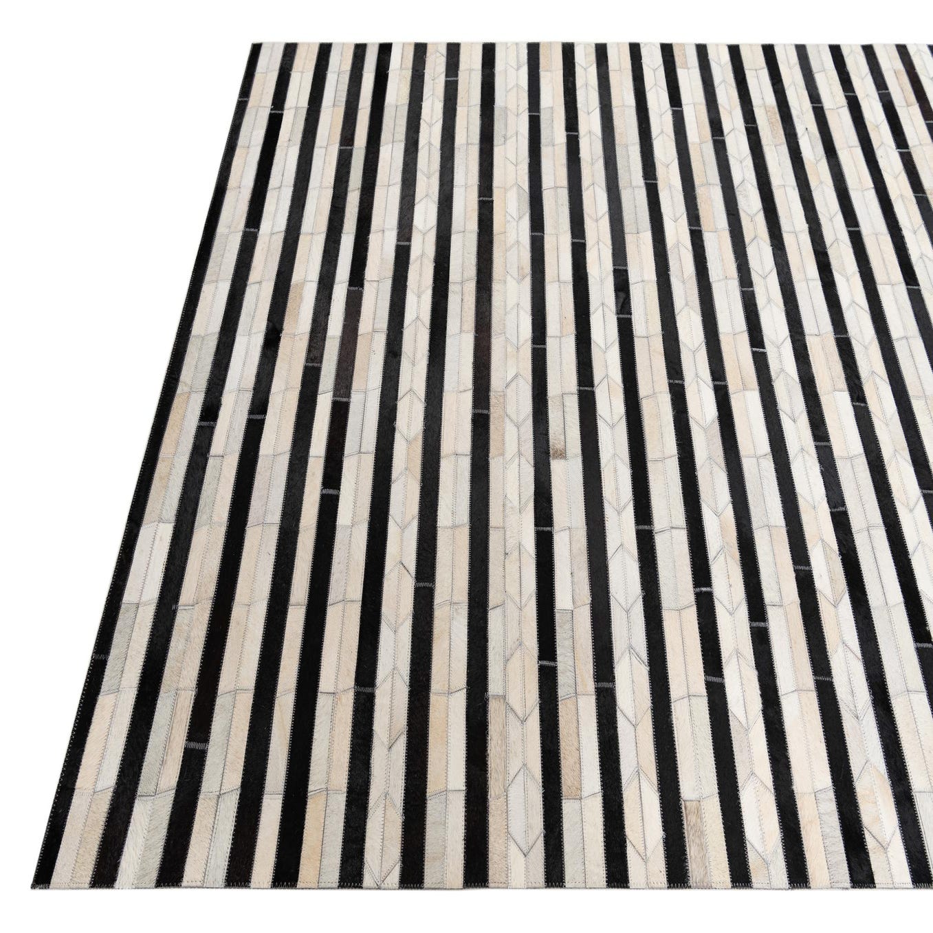 A rectangular 5x8 Cowhide Leather rug featuring a modern abstract pattern of alternating black and off-white horizontal stripes.