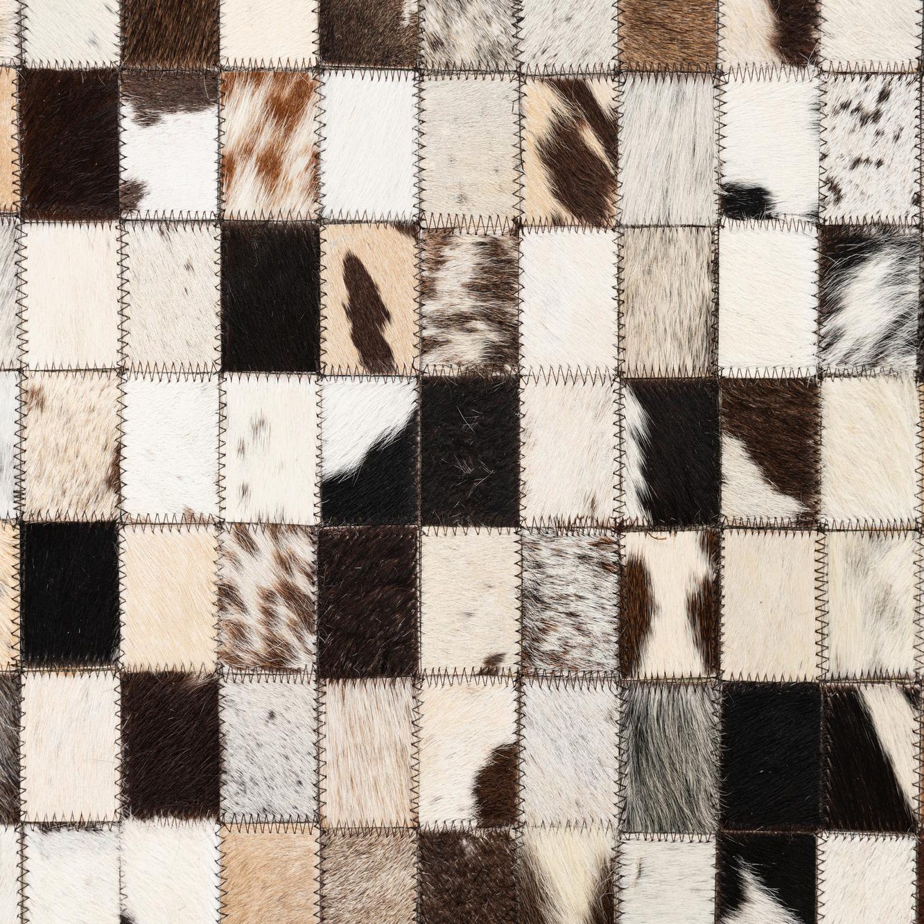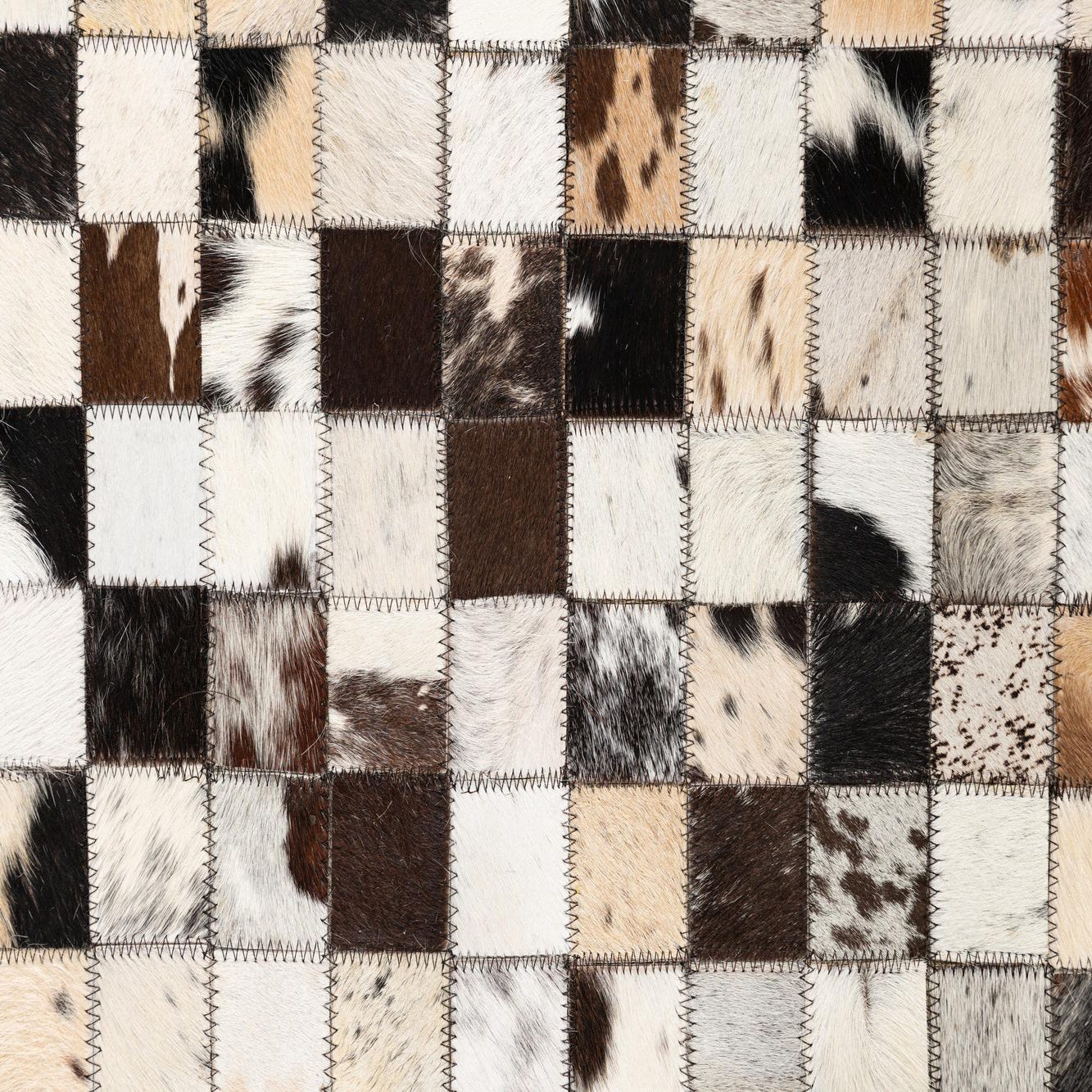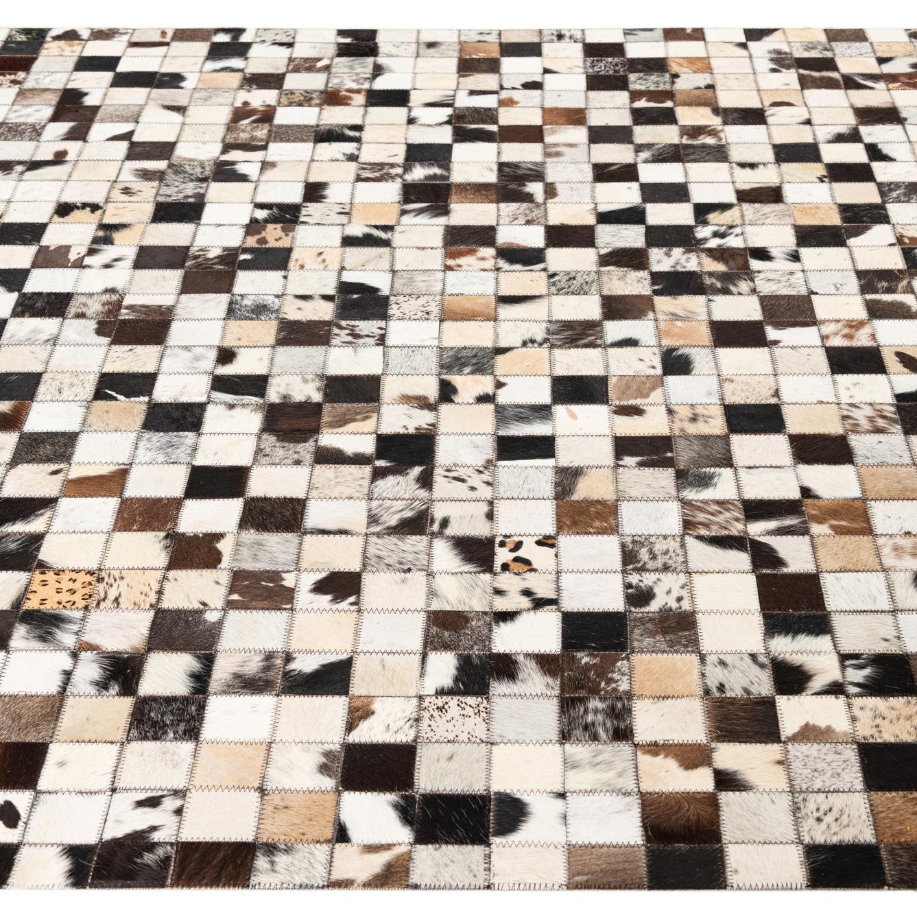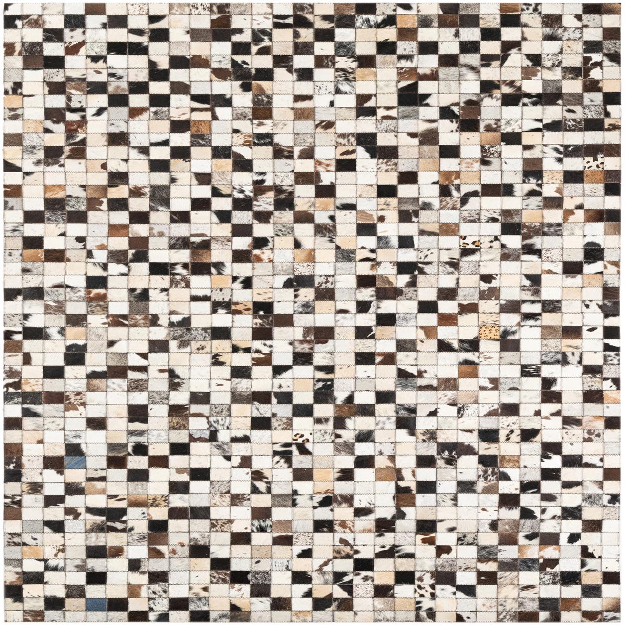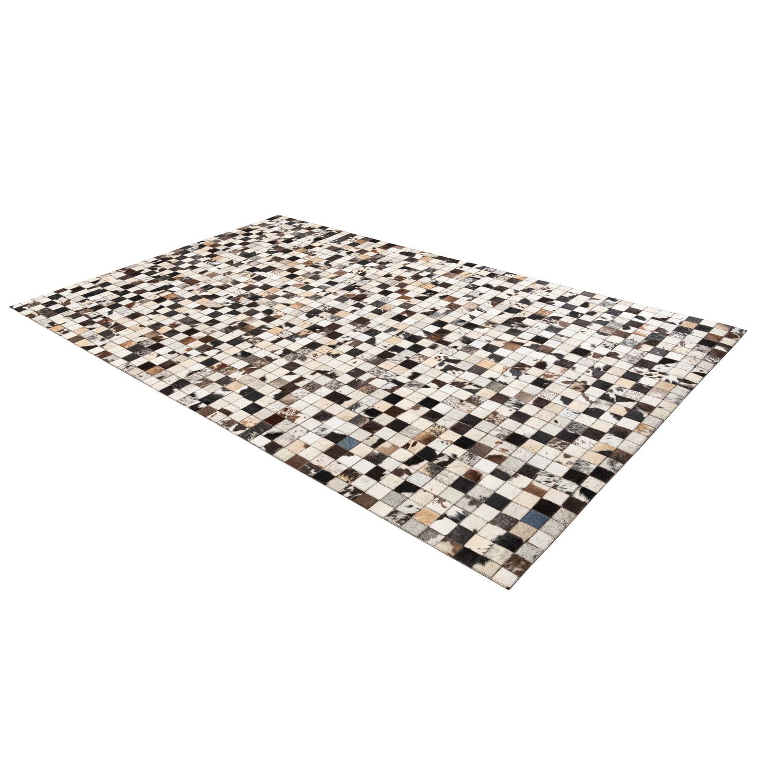 A 5x8 rectangular Cowhide Leather rug featuring a modern, abstract checkerboard pattern in multi-colored natural cowhide patches.
