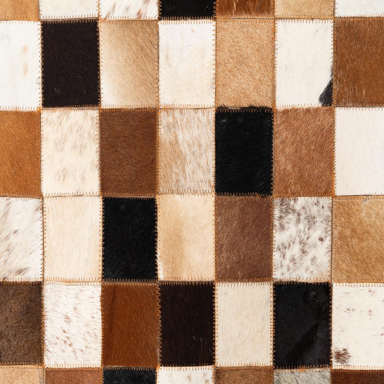 A 5x8 rectangular Cowhide Leather rug featuring a modern checkered pattern in various shades of brown, black, and white.