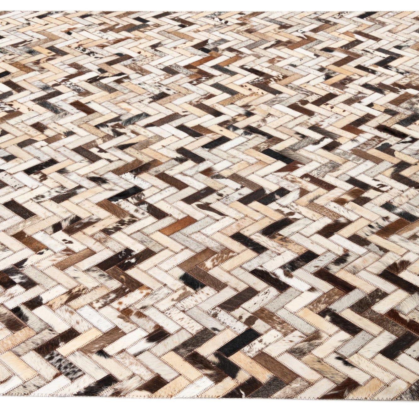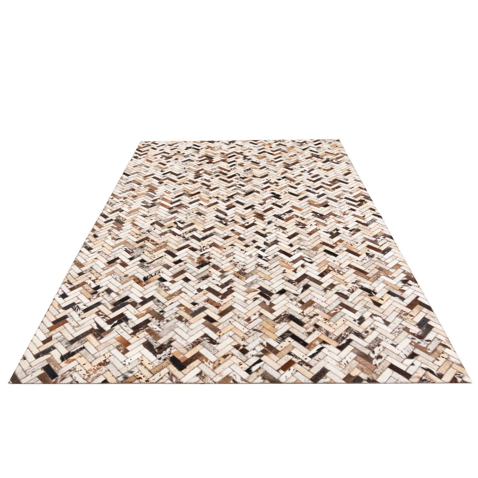 A rectangular 5x8 multi-colored cowhide and leather rug with a modern herringbone pattern, suitable for a living room.
