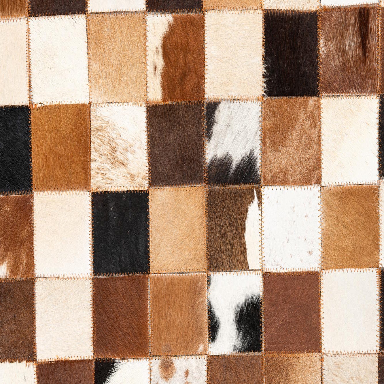 A tight checkerboard patchwork of small square panels creates a graphic, orderly pattern with a natural twist: each square shows its own hide variation, from solid creams and ivories to warm light browns, richer browns and deep black accents. The background reads multi-tone, so the overall effect is lively but grounded, with occasional speckled and bi?color patches that add character across the surface. Hand made of cowhide and leather, the rug has a hair?on?hide texture that feels soft underfoot while the subtle stitching between panels gives a faint, tactile grid.