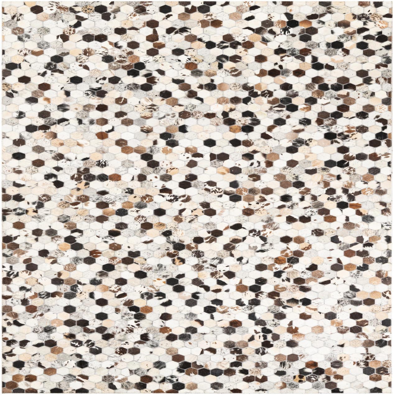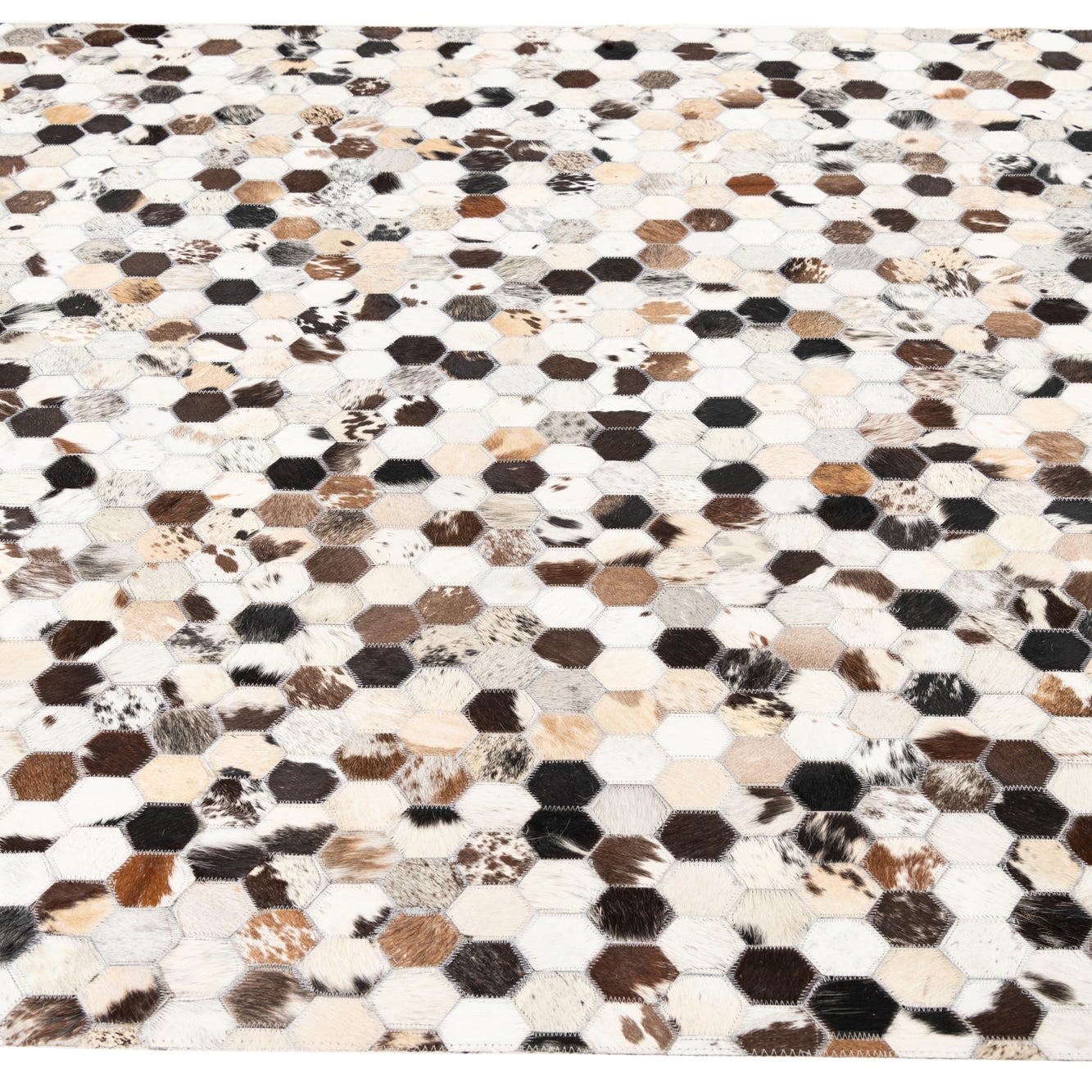 Handmade from cowhide and leather, this rug is assembled from a dense field of small hexagonal patches arranged in a honeycomb mosaic. The multi background weaves cream, ivory, beige, light brown, brown, gray and black into a lively yet balanced surface where speckled and solid hides alternate for subtle contrast. The hair-on-hide finish feels soft underfoot with a low pile and a natural sheen; faint stitching lines trace the hexagon edges, adding a tailored, geometric definition to the overall texture.
