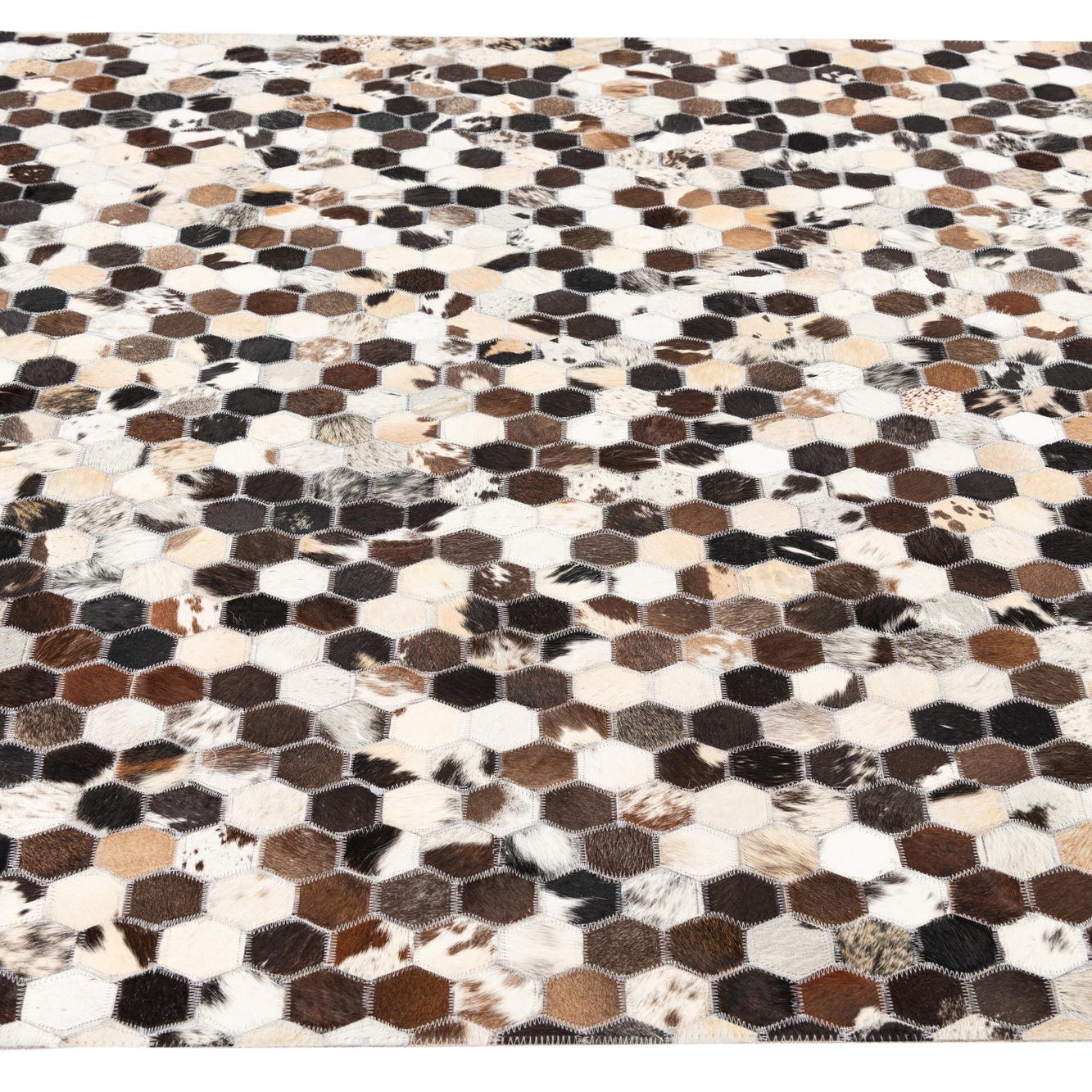 A 5x8 rectangular Cowhide Leather rug featuring a modern, abstract hexagonal pattern in multi-colored natural tones.