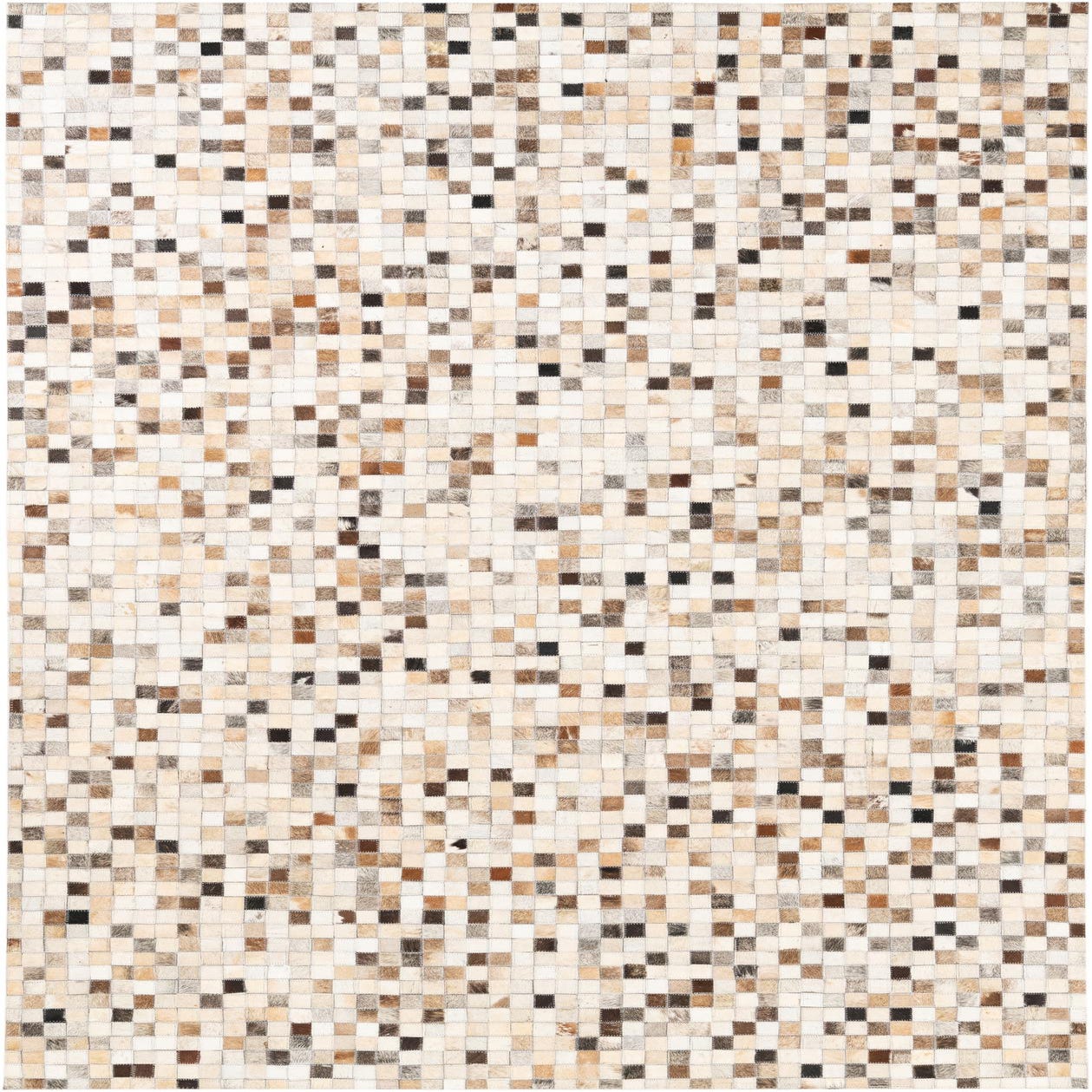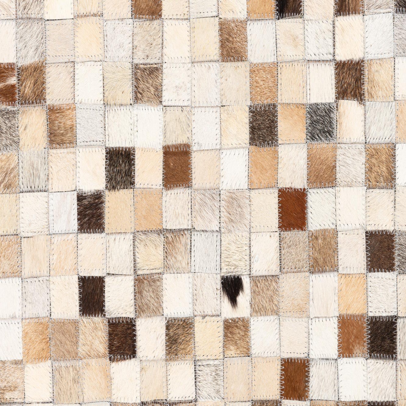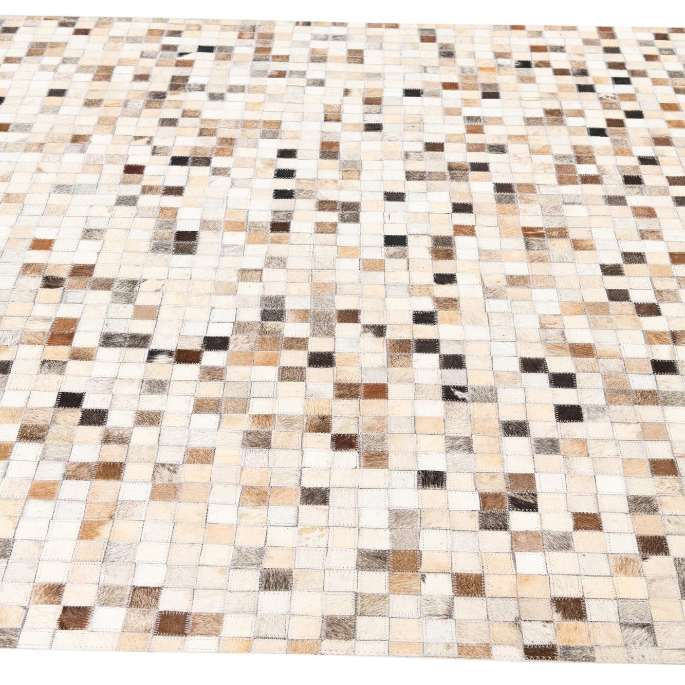 A 5x8 rectangular Cowhide Leather rug featuring a modern, abstract pattern of multi-colored square patches in natural brown, beige, and black tones.