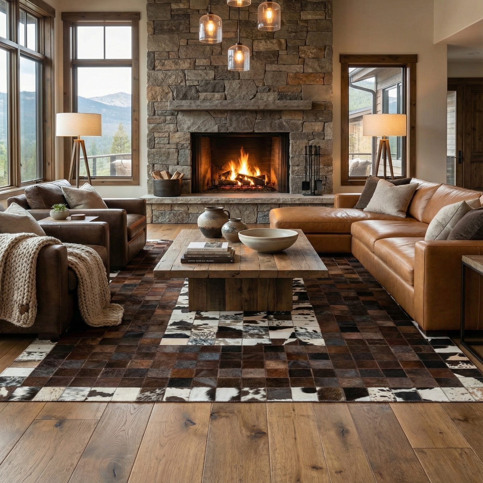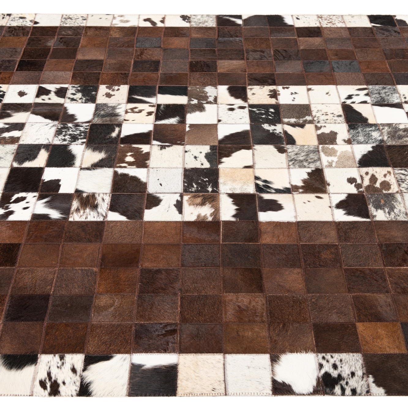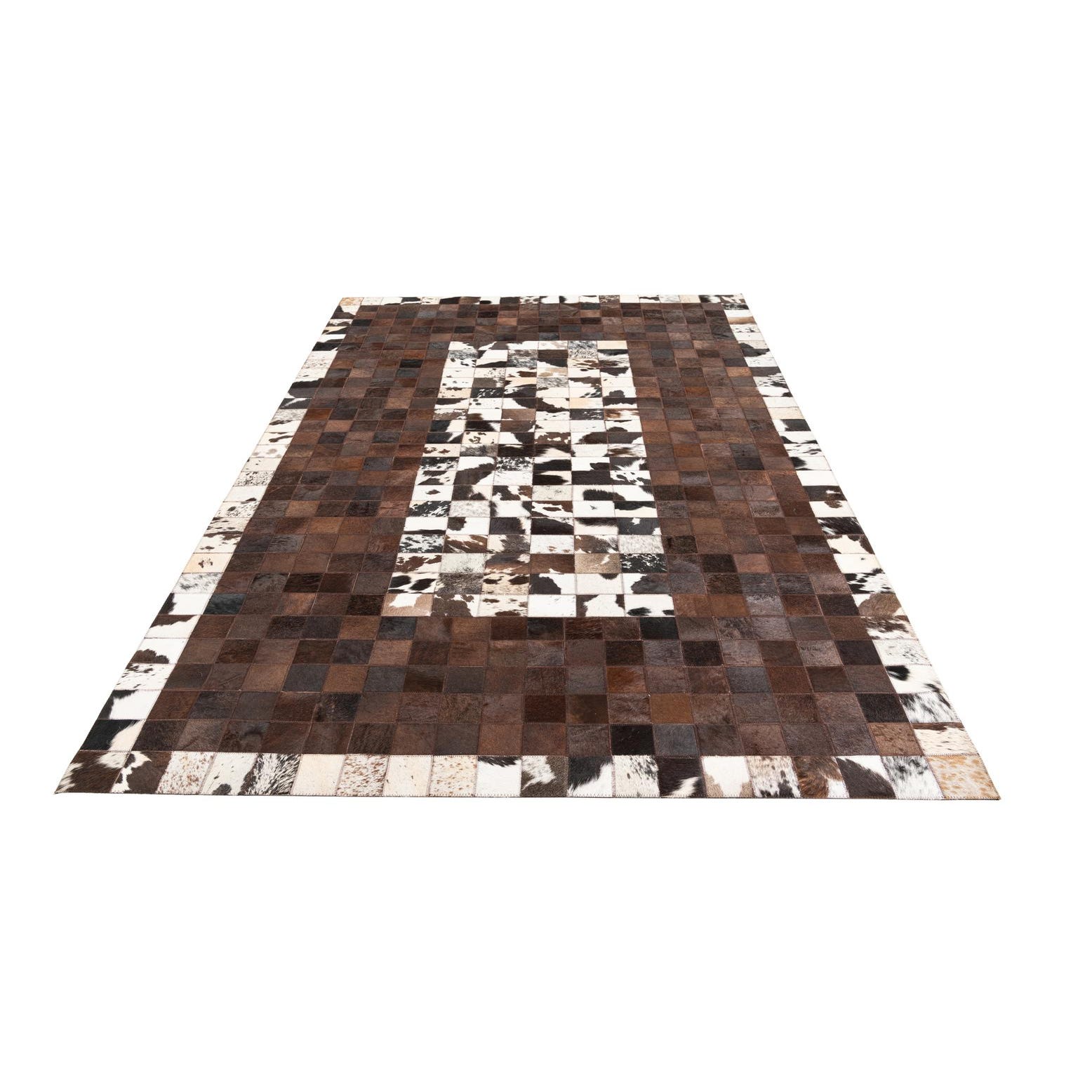 A 5x8 rectangular rug made from multi-colored cowhide and leather patches, featuring a modern, abstract checkerboard pattern of brown and white squares.