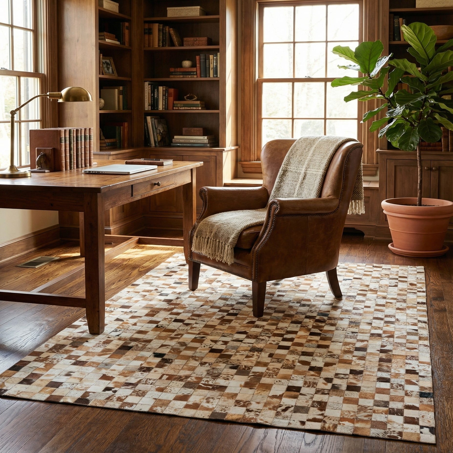 A 5x8 rectangular Cowhide Leather rug featuring a modern, abstract patchwork of multi-colored squares in various natural brown, tan, and white tones.