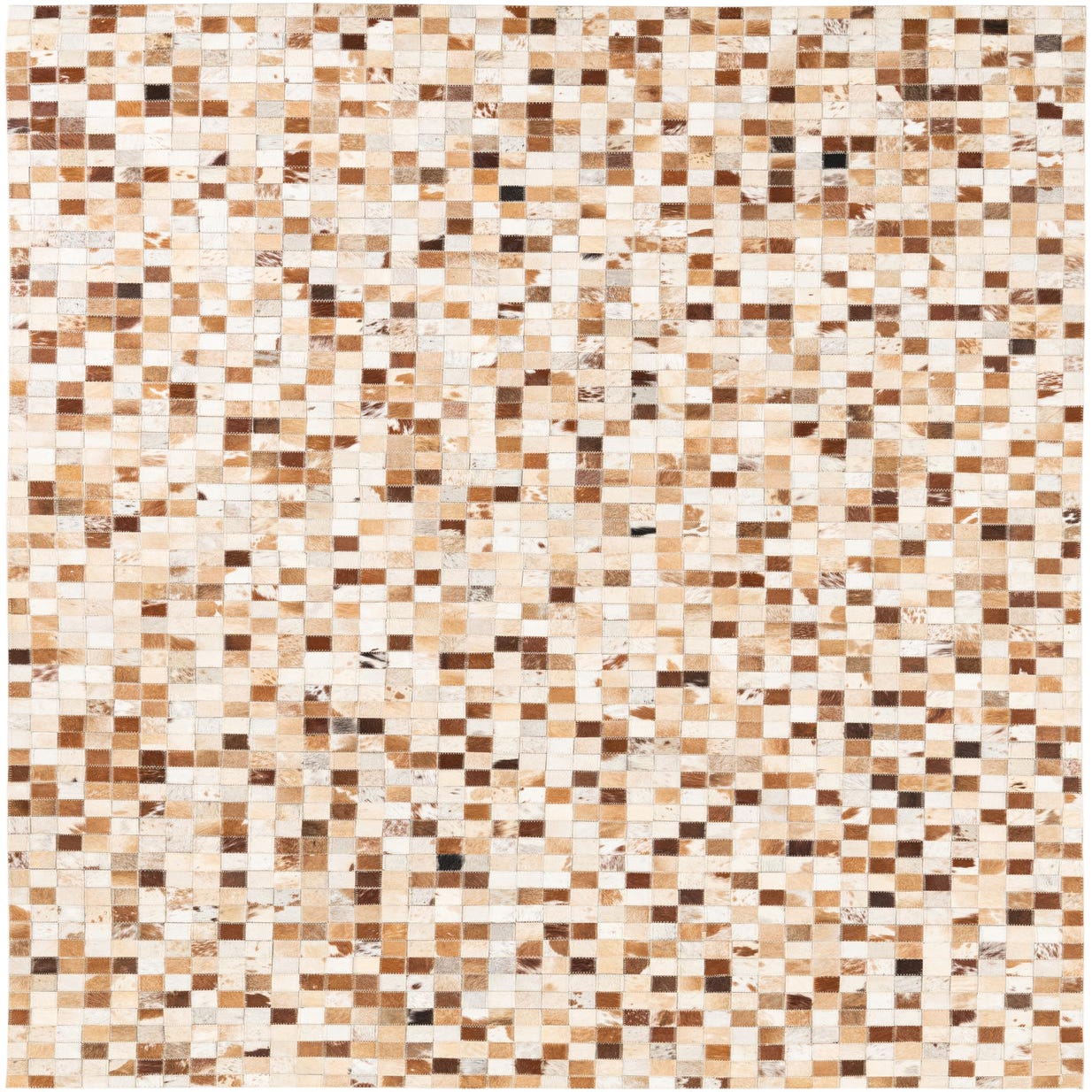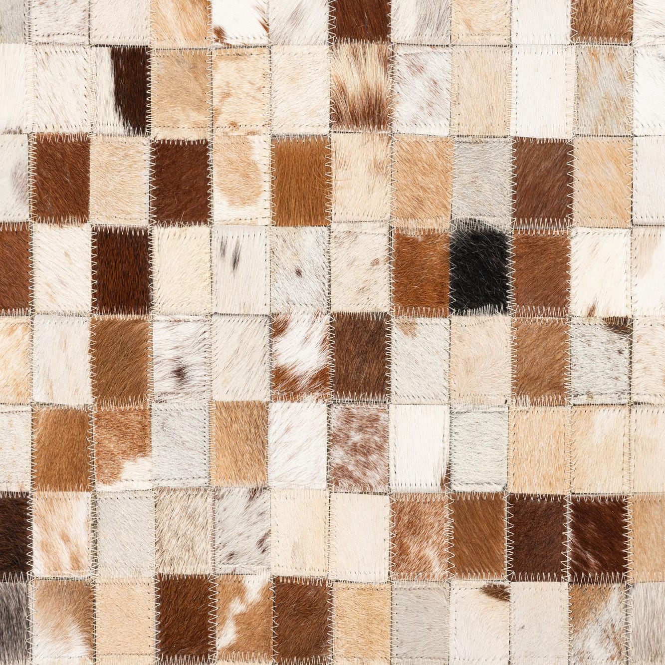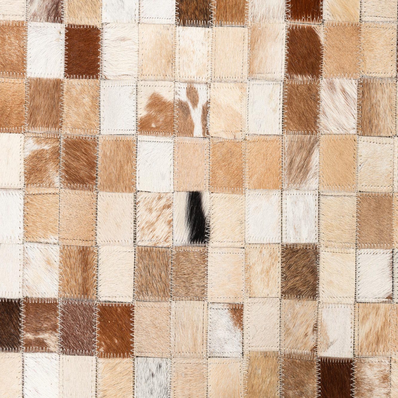 A 5x8 rectangular Cowhide Leather rug featuring a modern, abstract patchwork of multi-colored squares in various natural brown, beige, and cream tones.