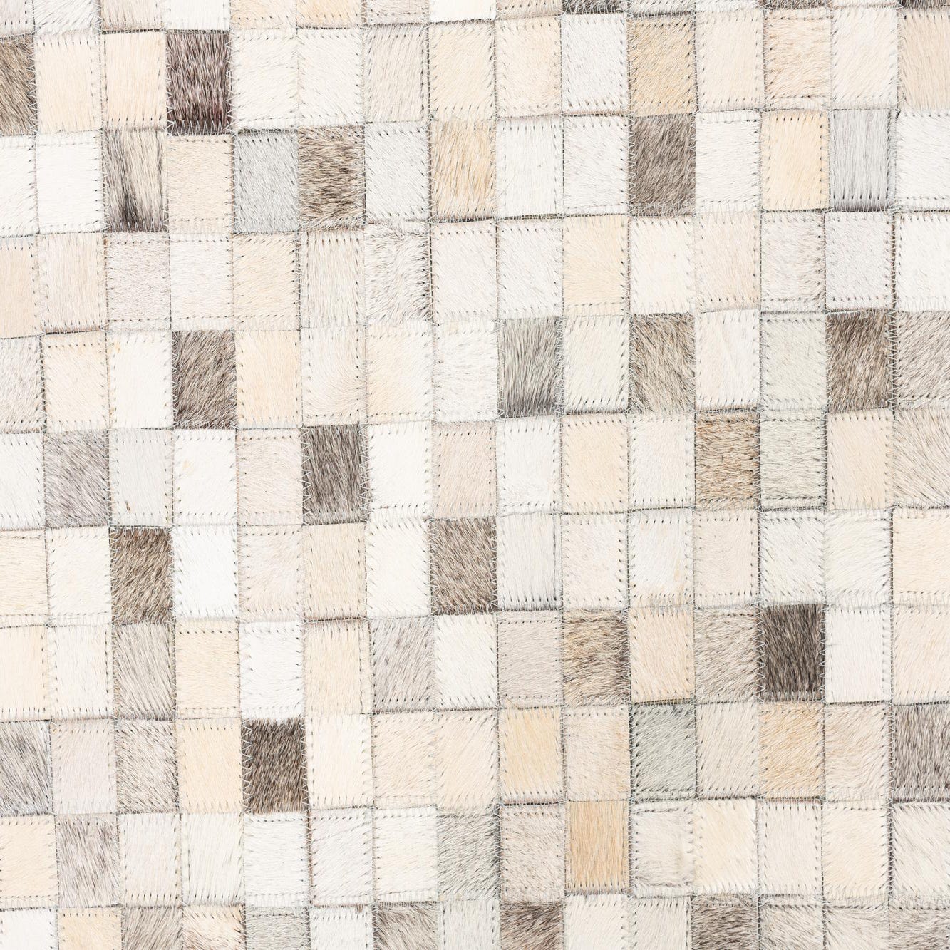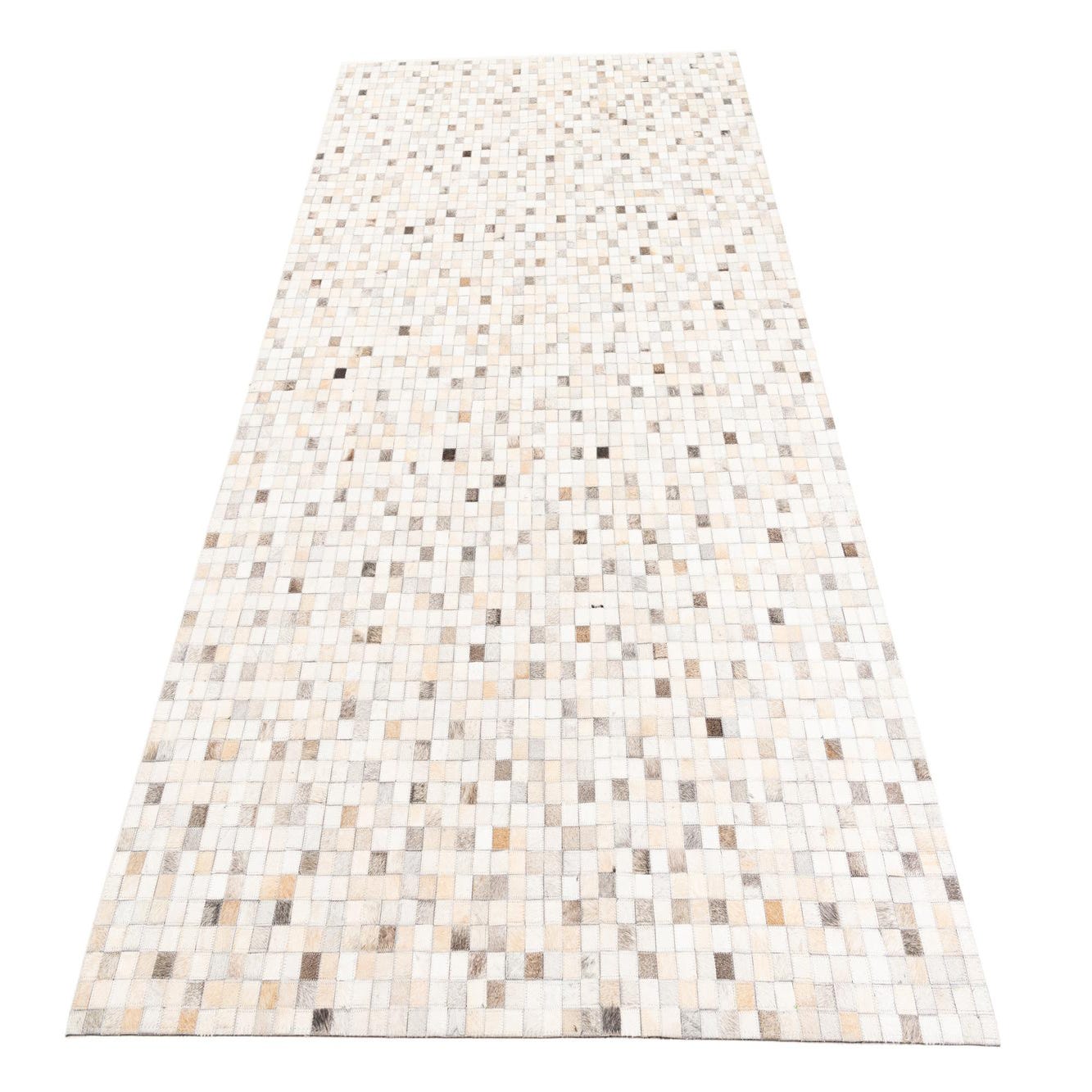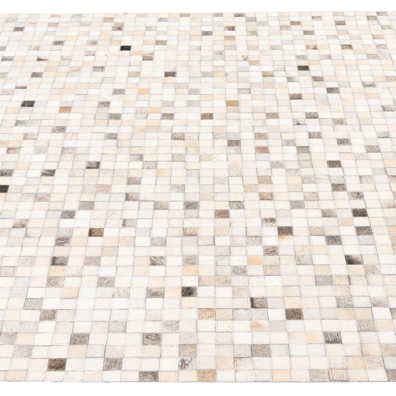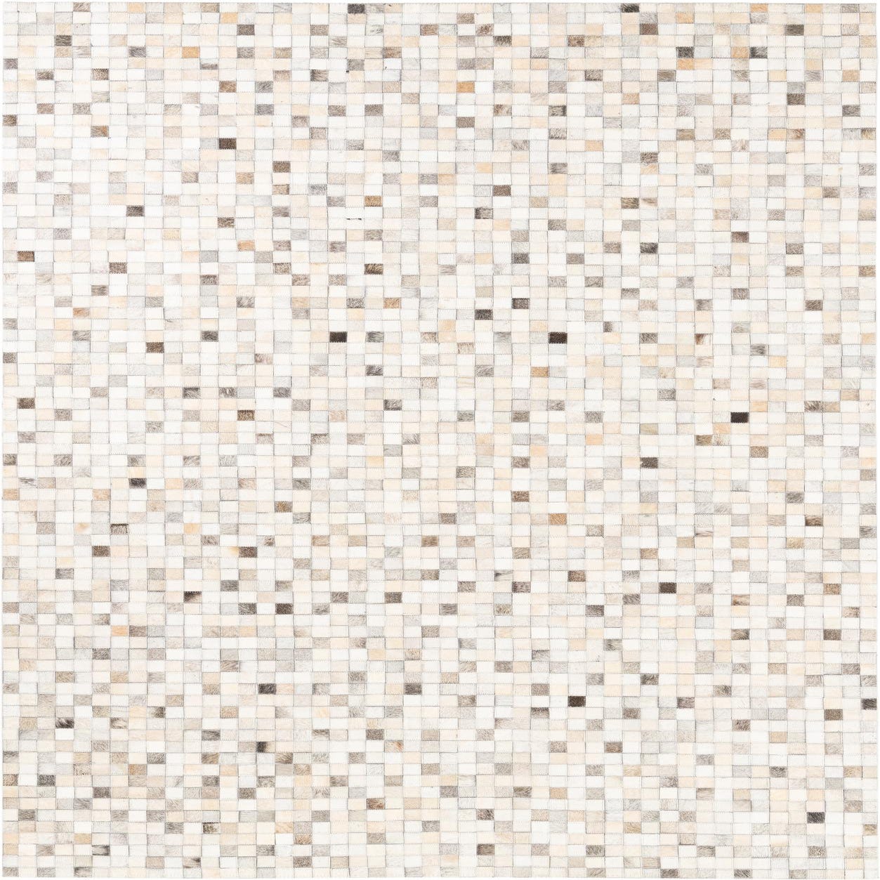 A rectangular 5x8 modern cowhide rug with a mosaic pattern of multi-colored natural leather squares in various shades of white, cream, brown, and grey.