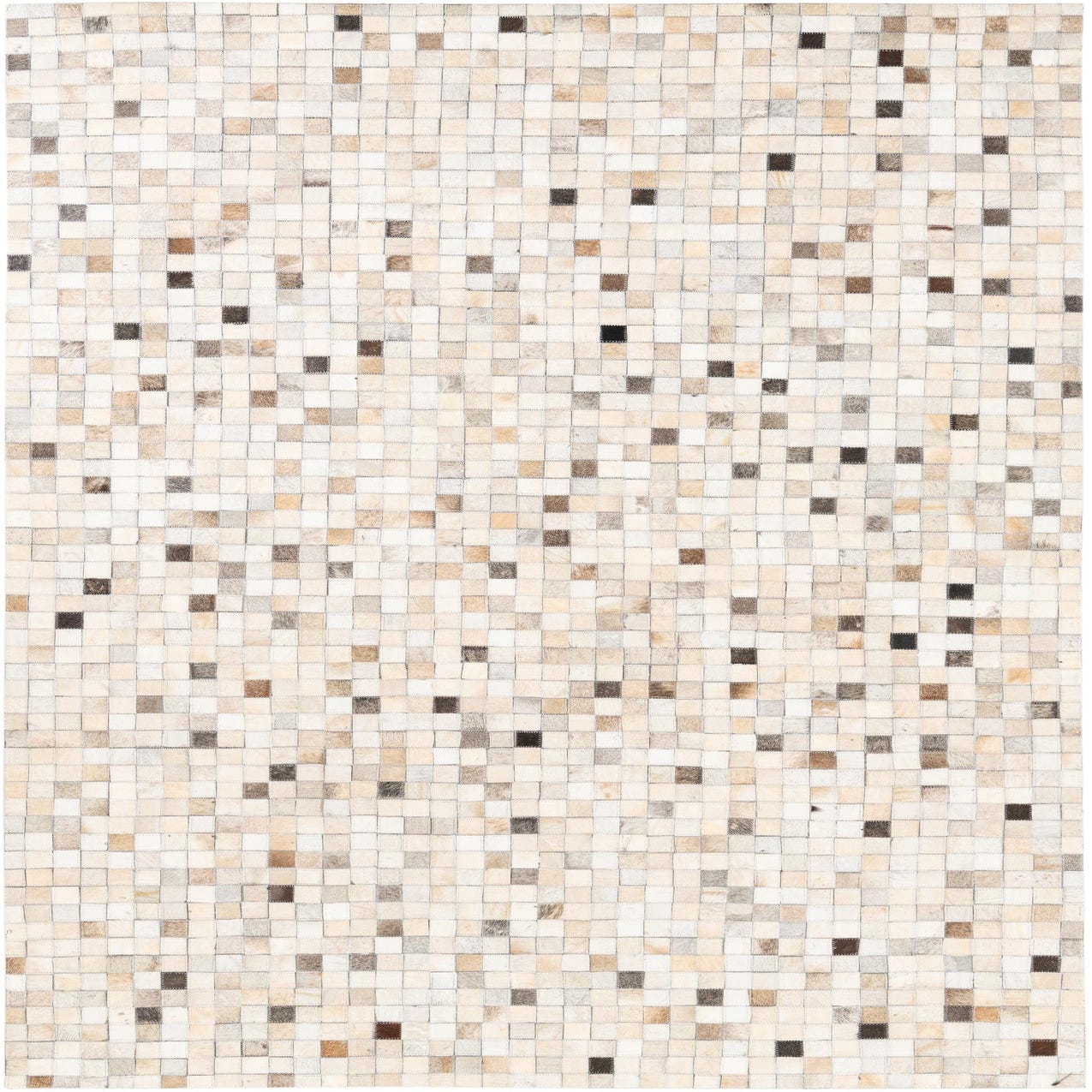 A rectangular 5x8 modern cowhide rug with a mosaic pattern of multi-colored squares in varying shades of brown, beige, and white.