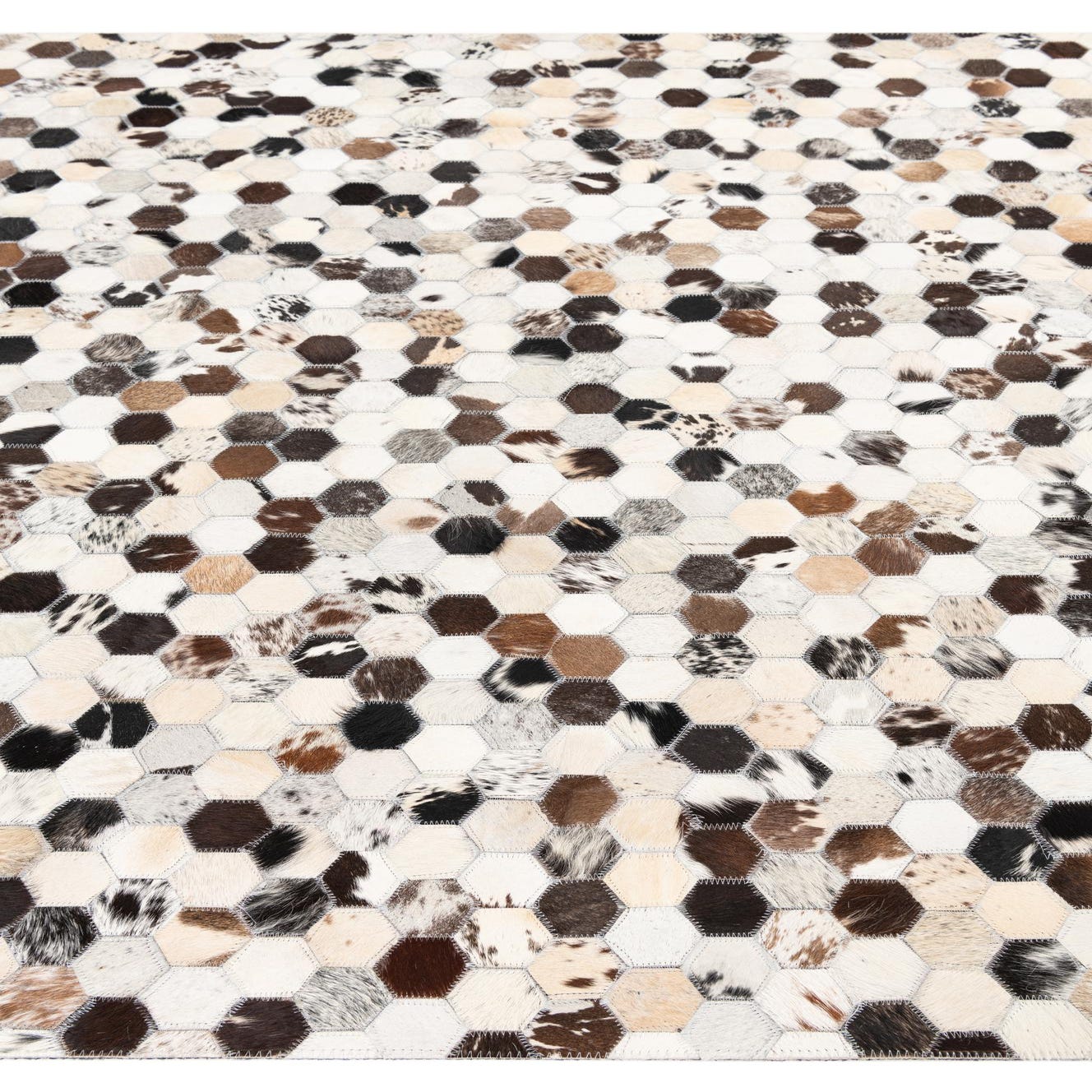 A 5x8 rectangular Cowhide Leather rug featuring a modern, abstract pattern of multi-colored hexagonal patches.