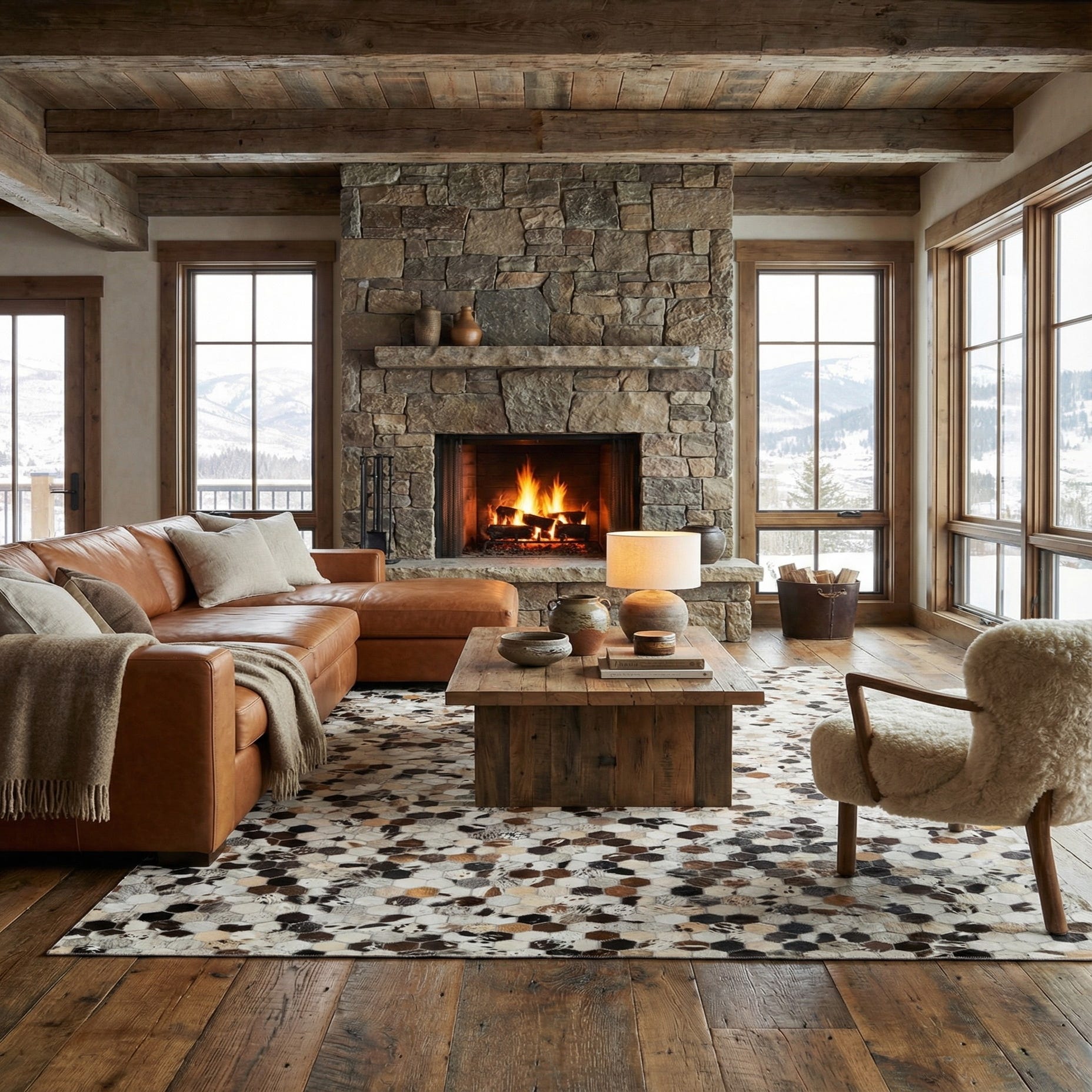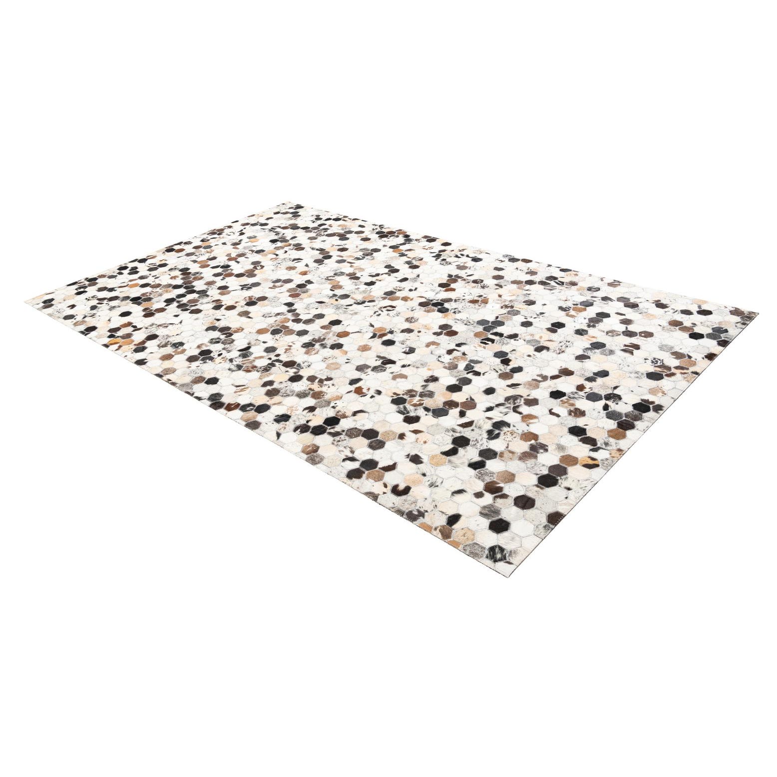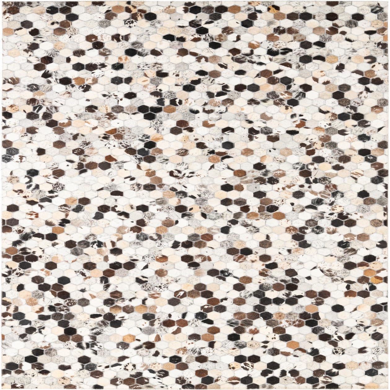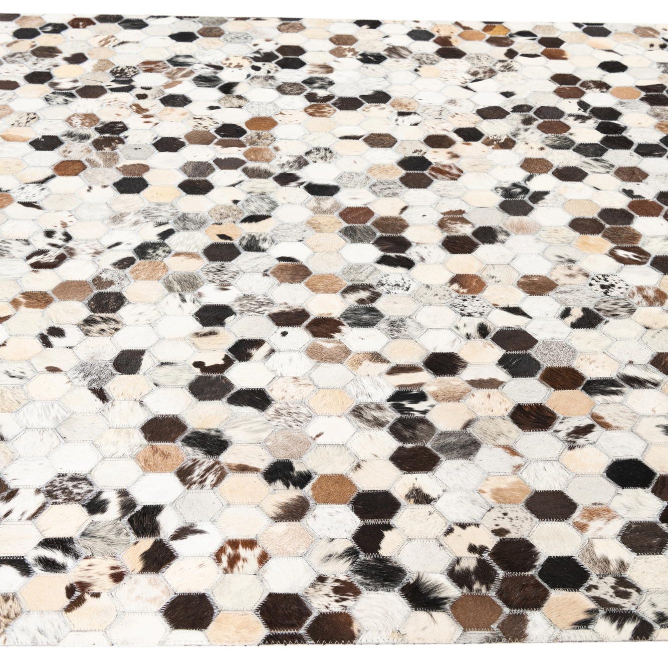 A 5x8 rectangular Cowhide Leather rug featuring a modern, abstract pattern of multi-colored hexagonal patches in varying shades of brown, black, and white.