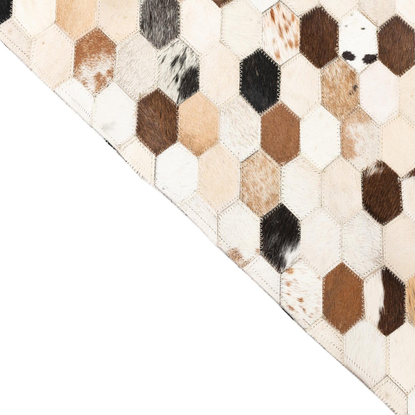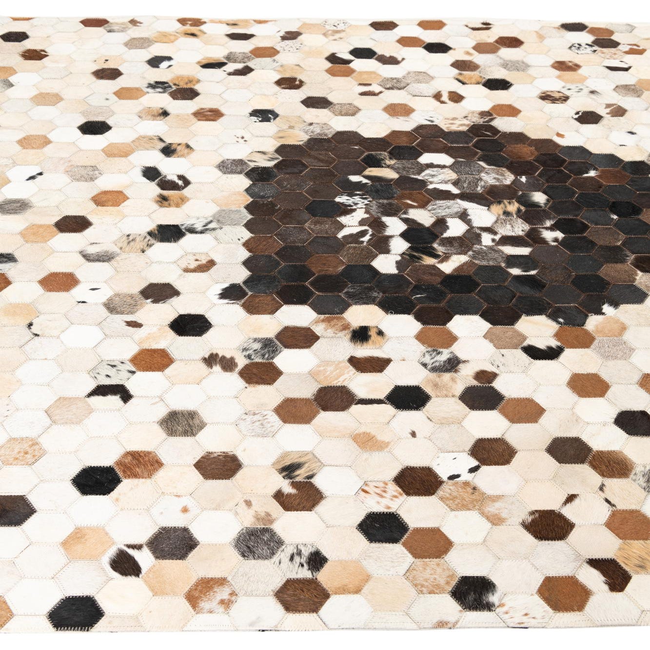 A 5x8 rectangular cowhide and leather rug featuring a modern, abstract hexagonal pattern in multi-colored natural tones.