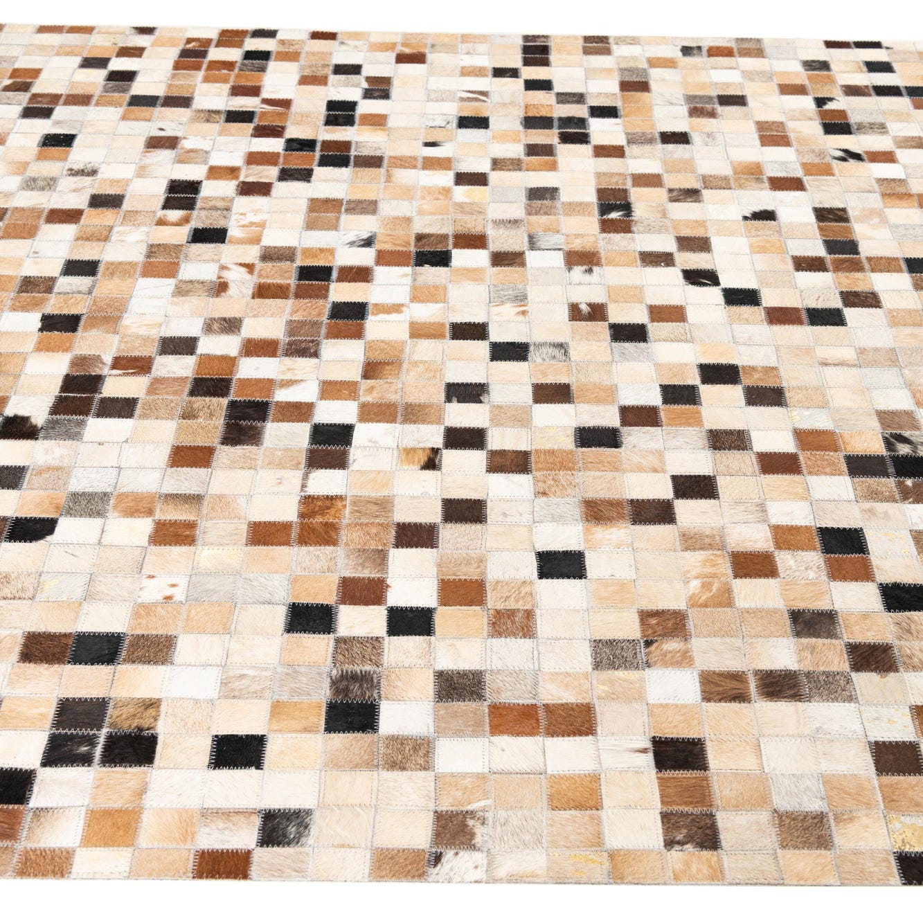 A 5x8 rectangular Cowhide Leather rug featuring a modern patchwork of multi-colored squares in various natural brown, black, and cream tones.