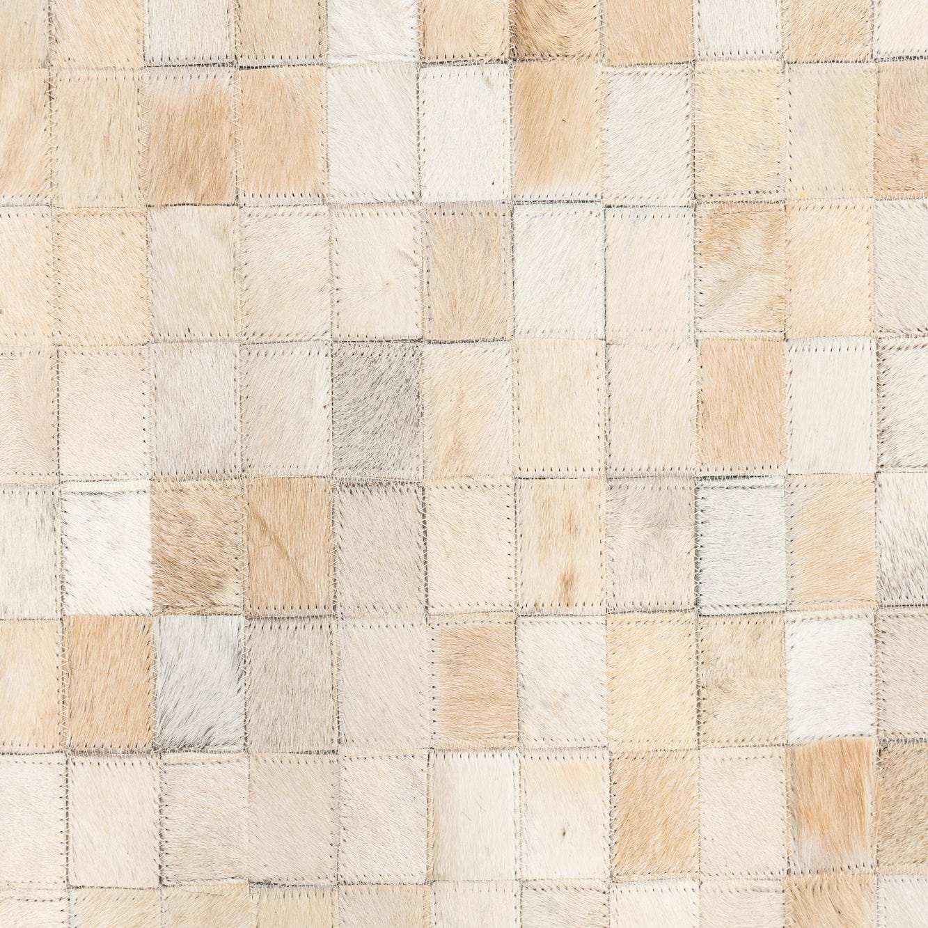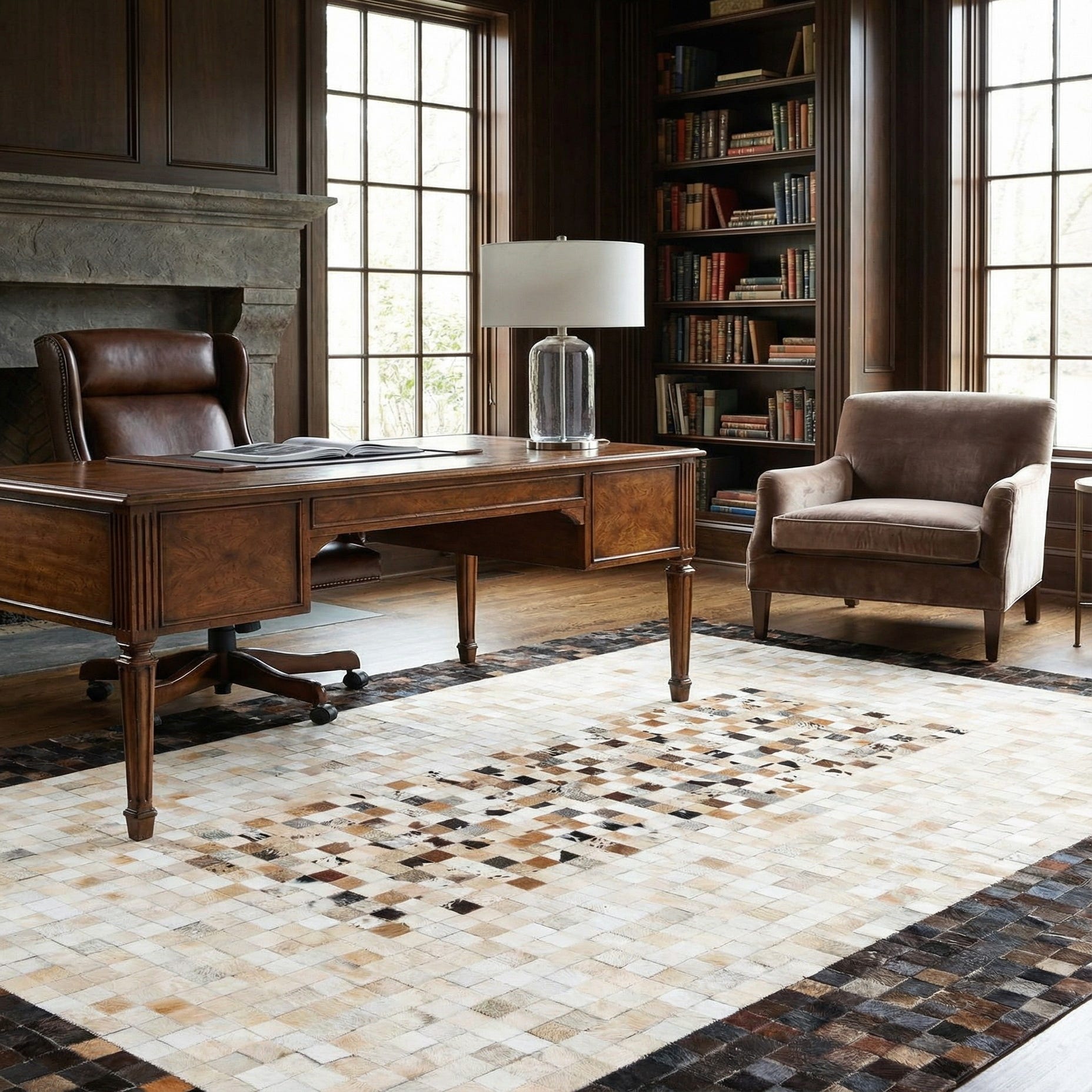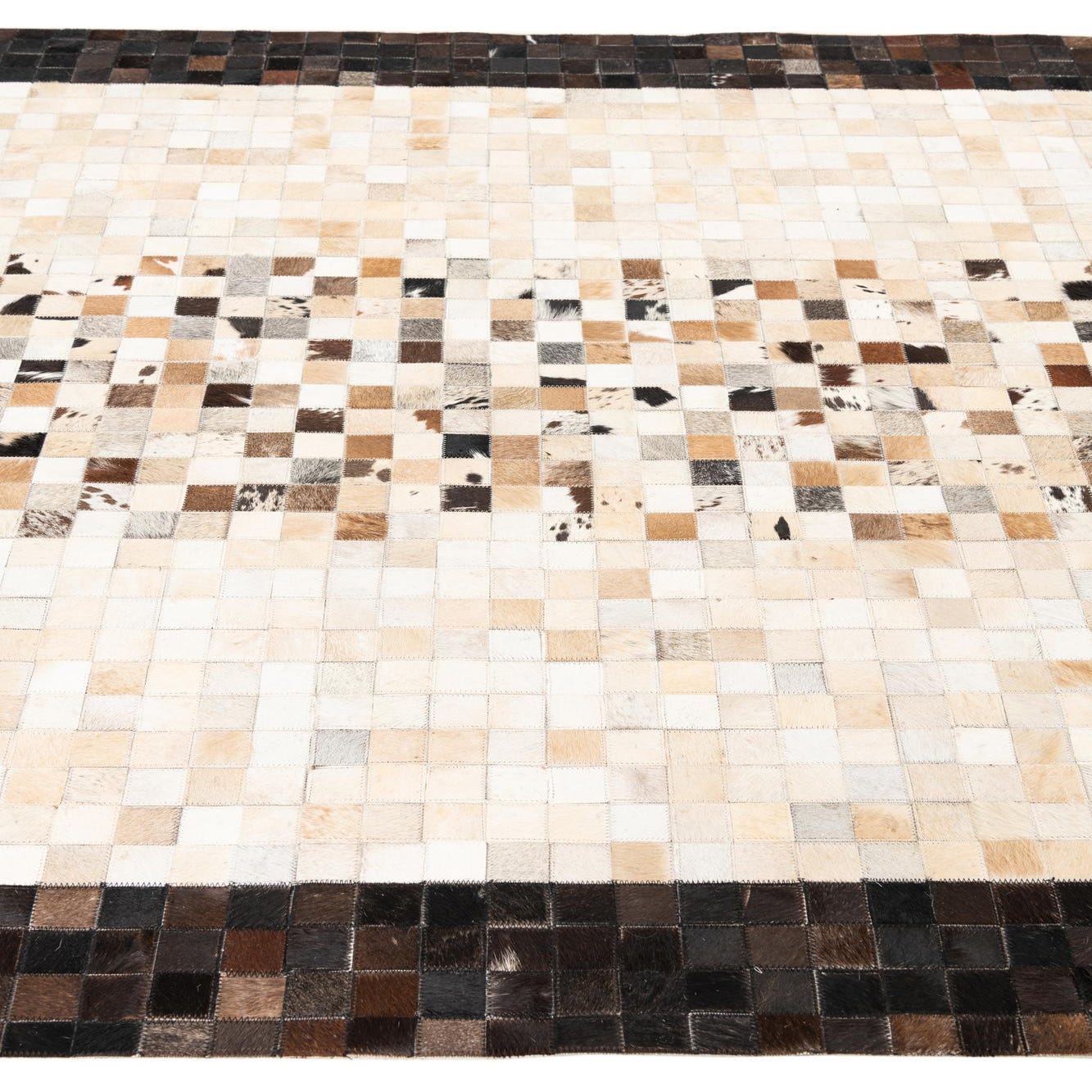 A 5x8 rectangular Cowhide Leather rug featuring a modern, abstract pattern of multi-colored square patches.