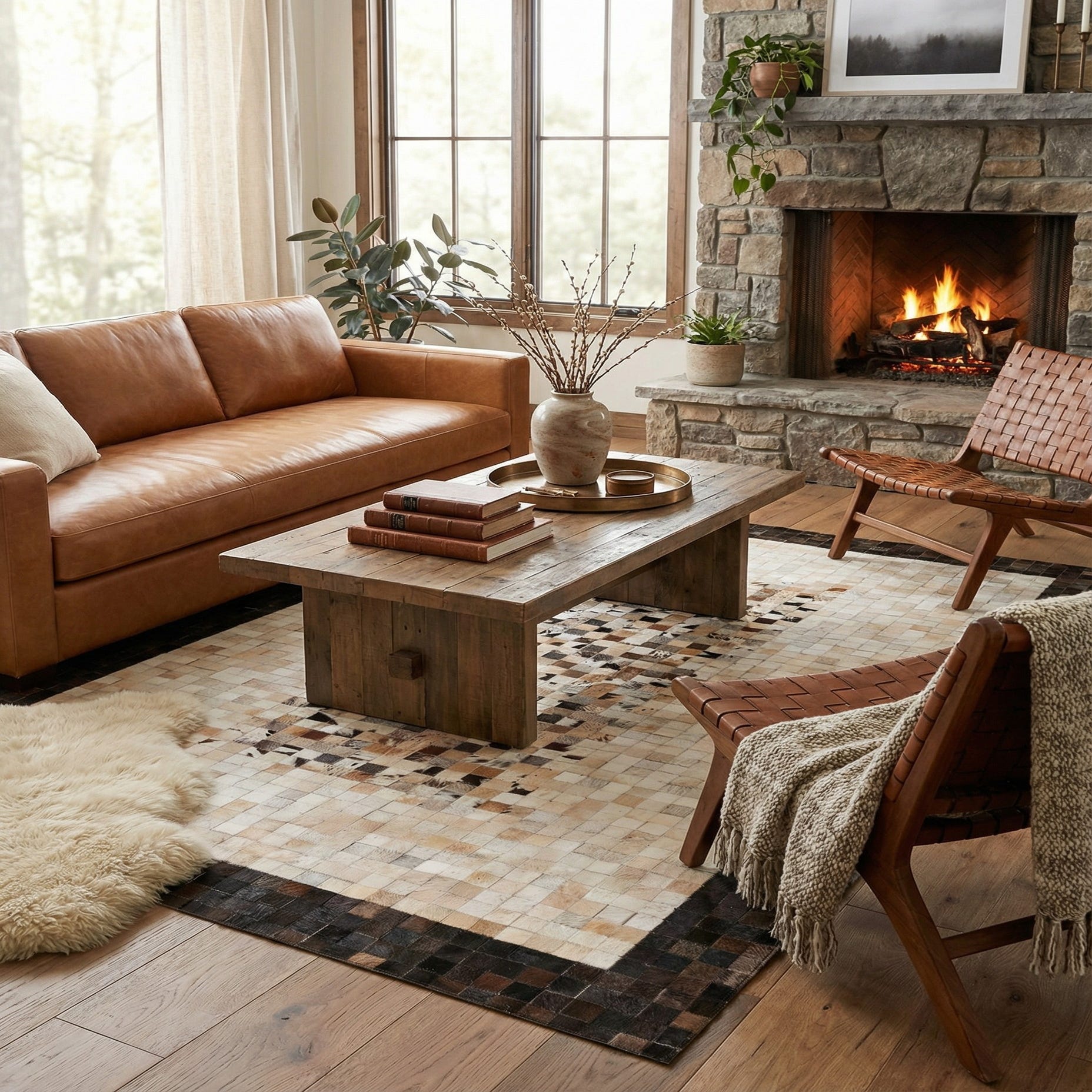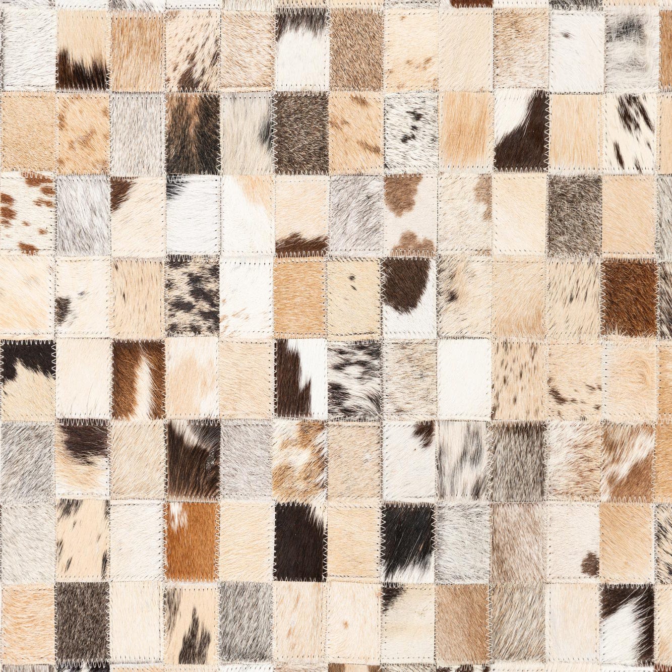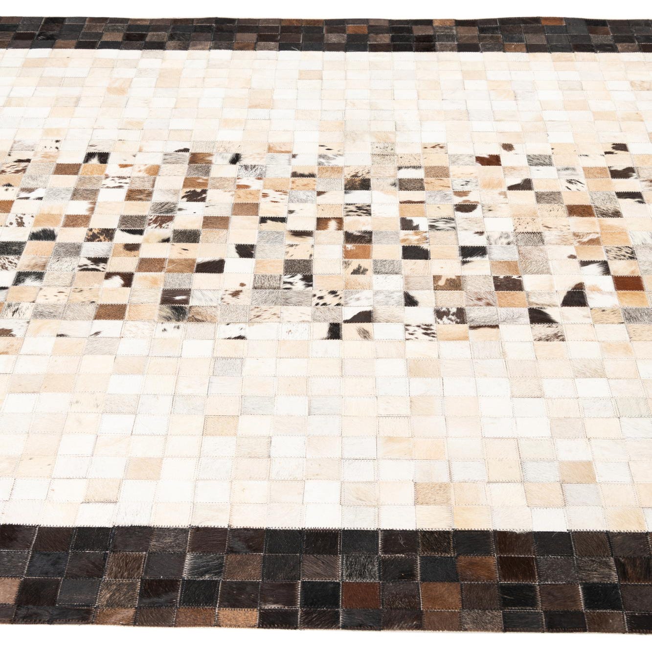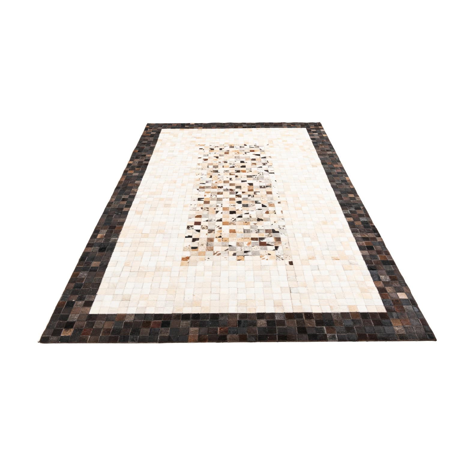 A 5x8 rectangular Cowhide Leather rug featuring a multi-colored modern abstract patchwork design with a dark brown border.