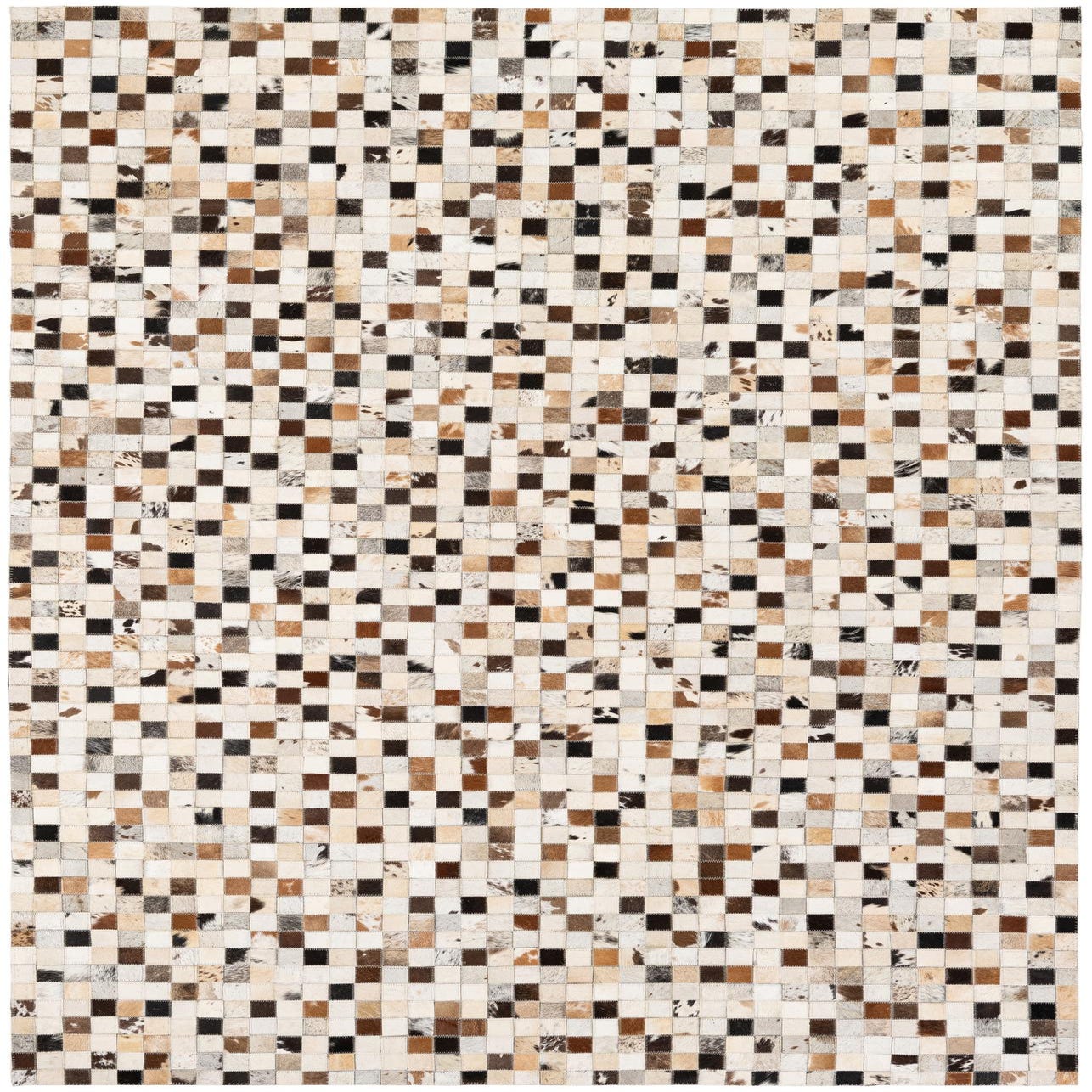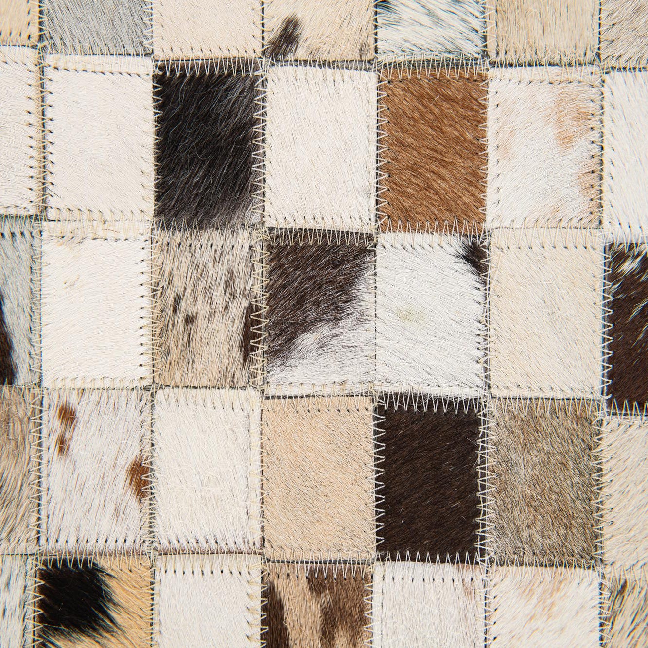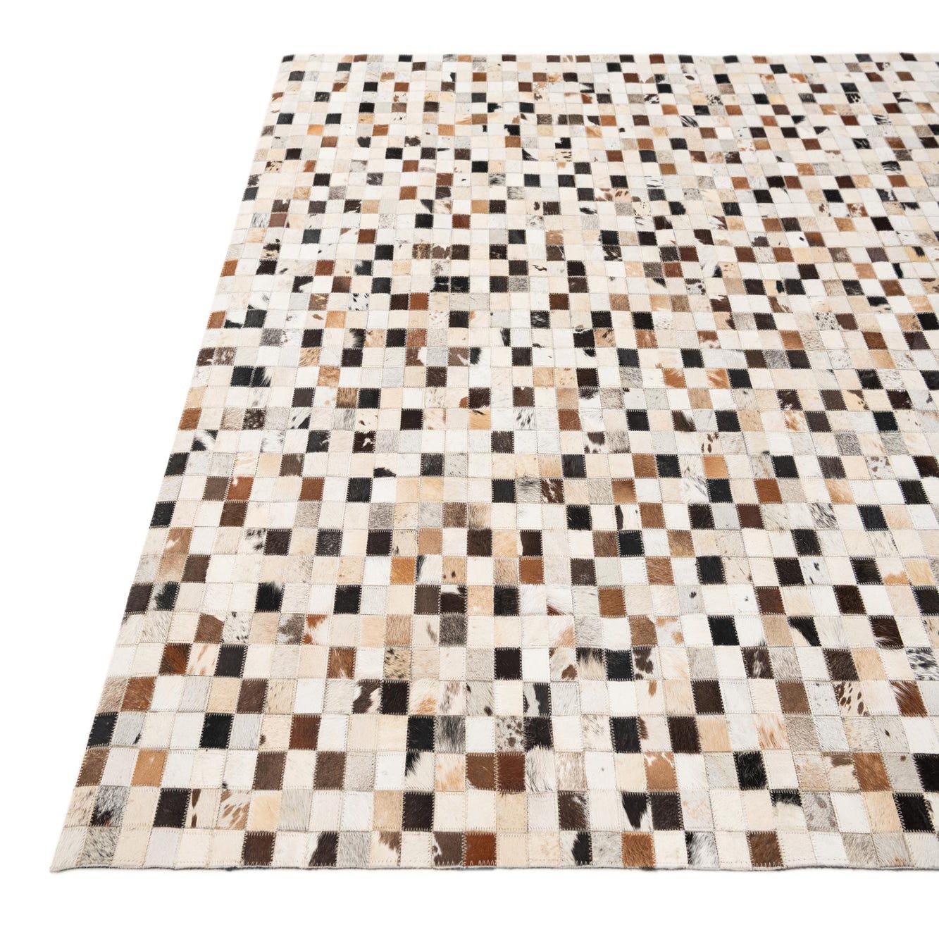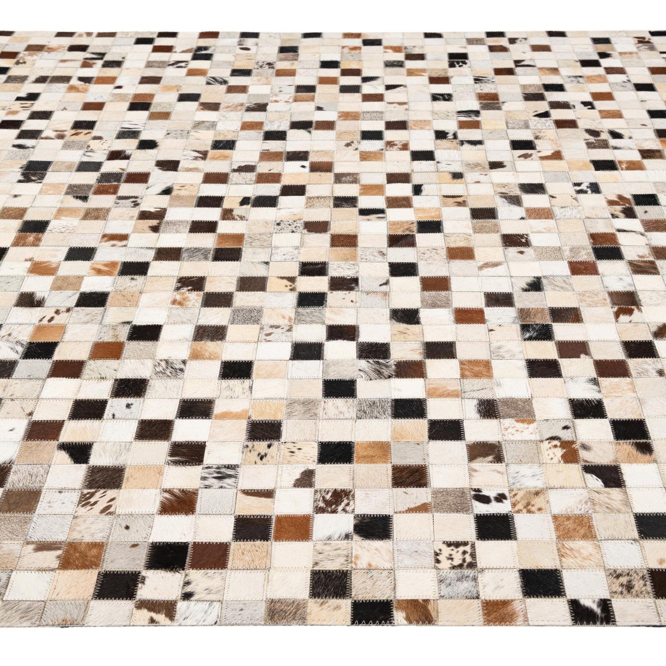 A 5x8 rectangular cowhide rug featuring a modern patchwork of multi-colored squares in shades of brown, black, and cream.
