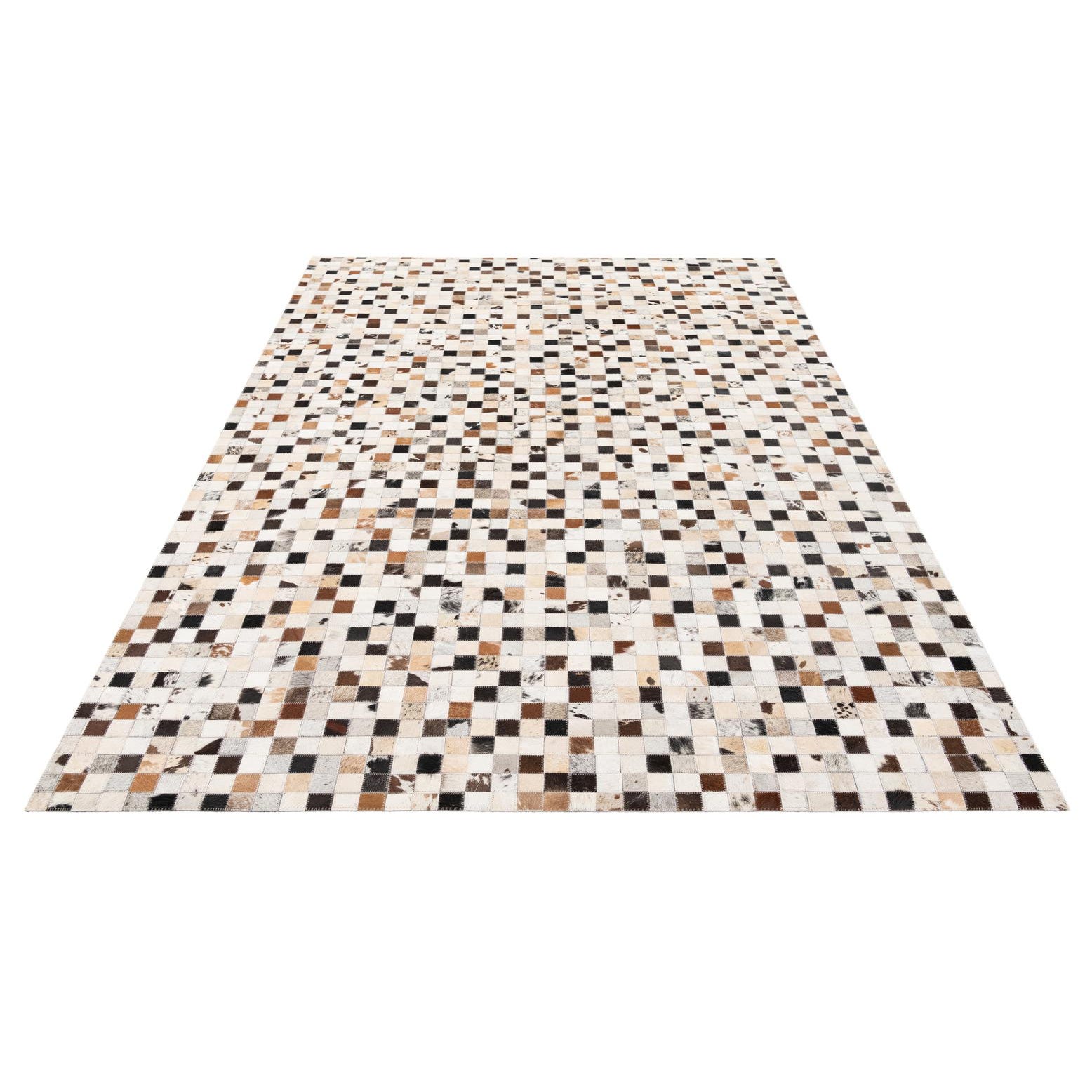 A 5x8 rectangular, multi-colored modern cowhide rug with a patchwork square pattern, ideal for a living room.