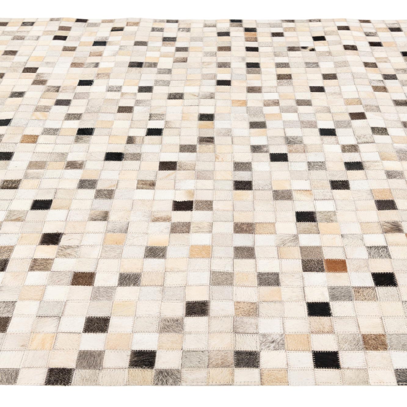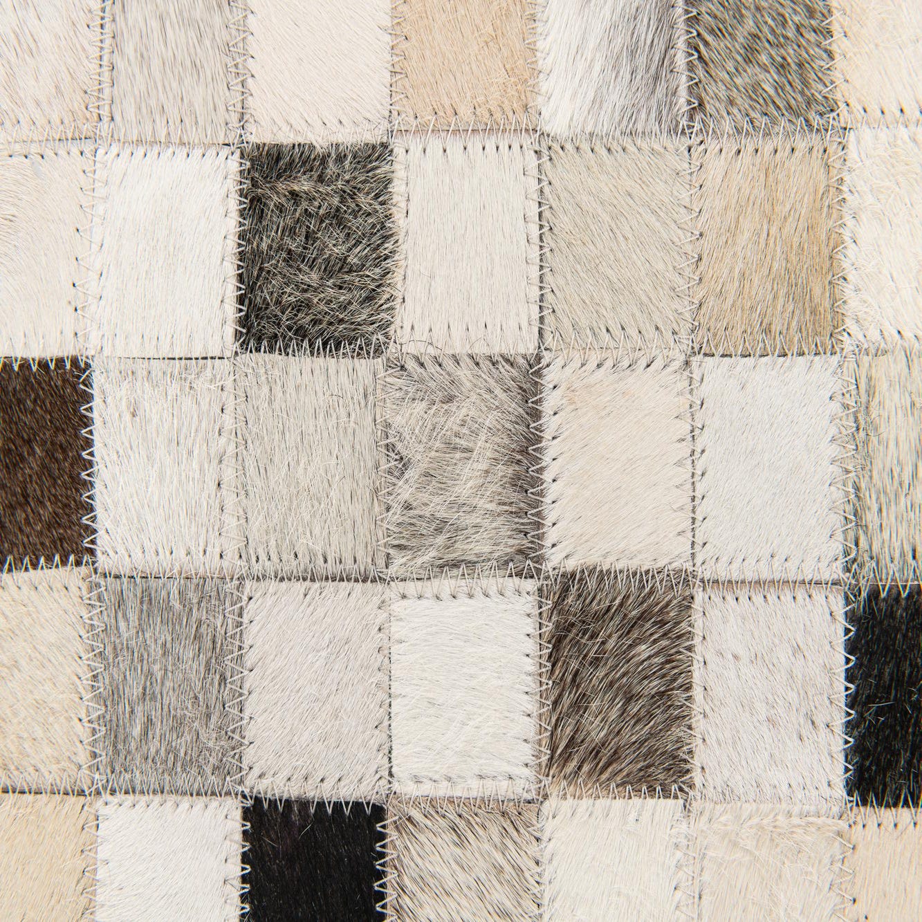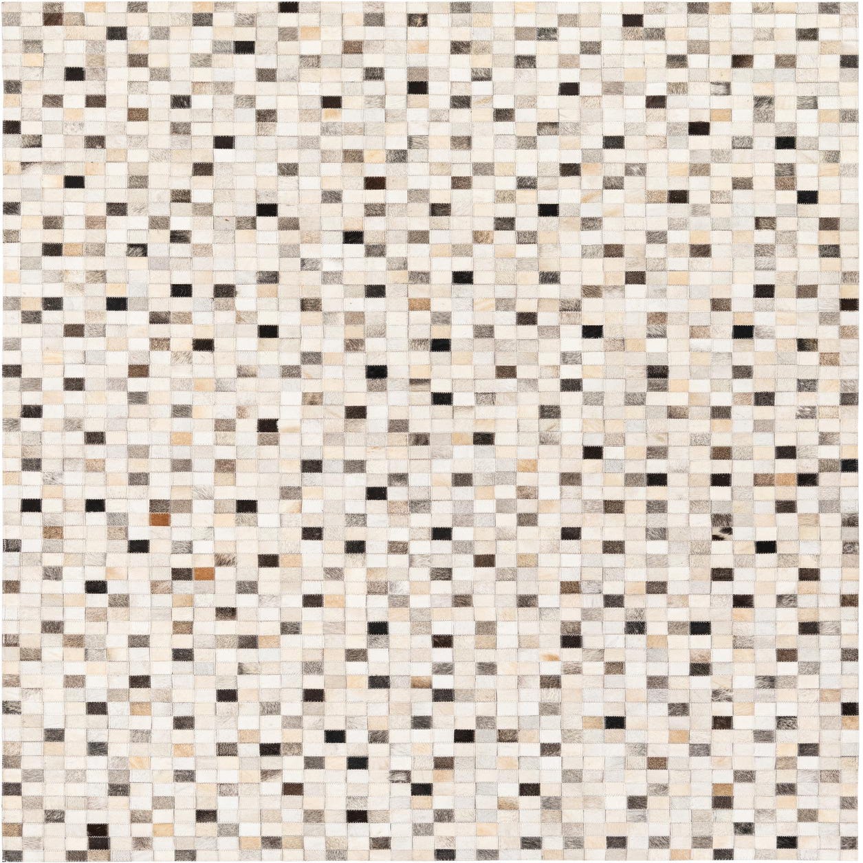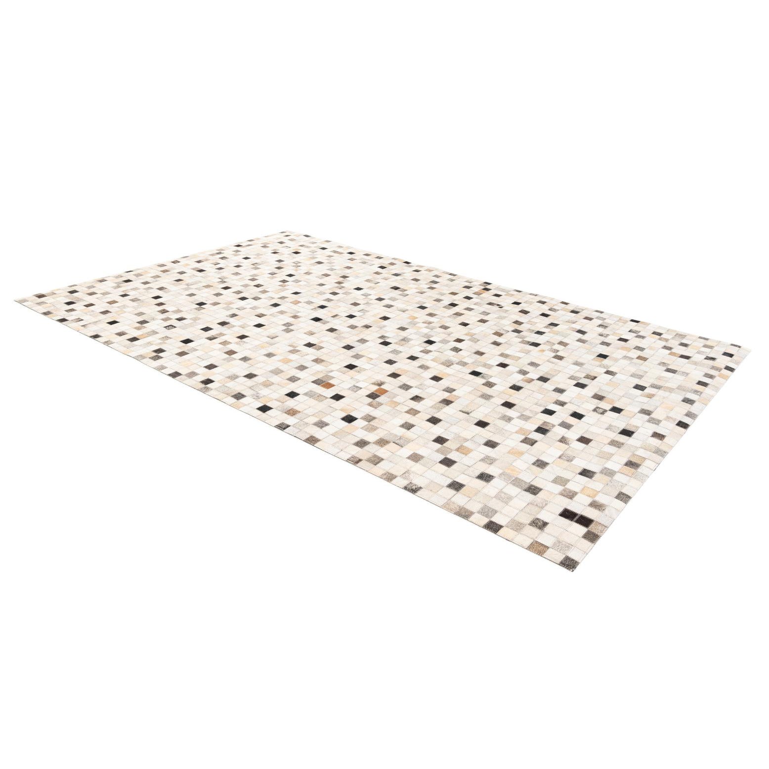 A 5x8 rectangular Cowhide Stocks rug featuring a modern patchwork of multi-colored cowhide squares in various natural tones.