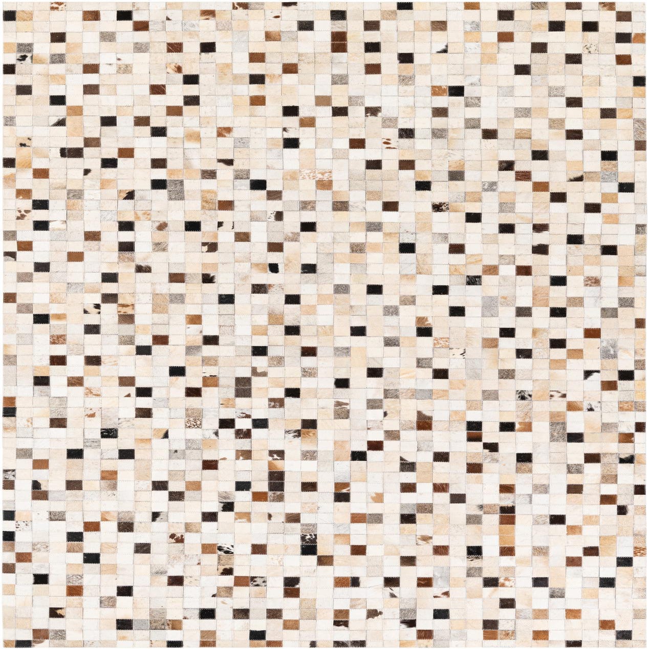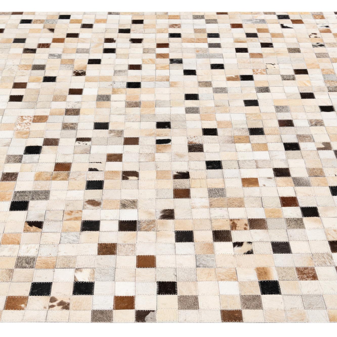 A tight mosaic of hand-stitched cowhide squares creates a refined patchwork pattern across a multi-tonal background. Neutral shades of ivory, beige, tan and light brown are punctuated by deeper browns and occasional black accents, producing a lively yet grounded surface. The individual hide tiles show natural variation in tone and subtle hair patterns, and the stitched leather seams provide a slight, tactile grid that catches light differently across the rug.