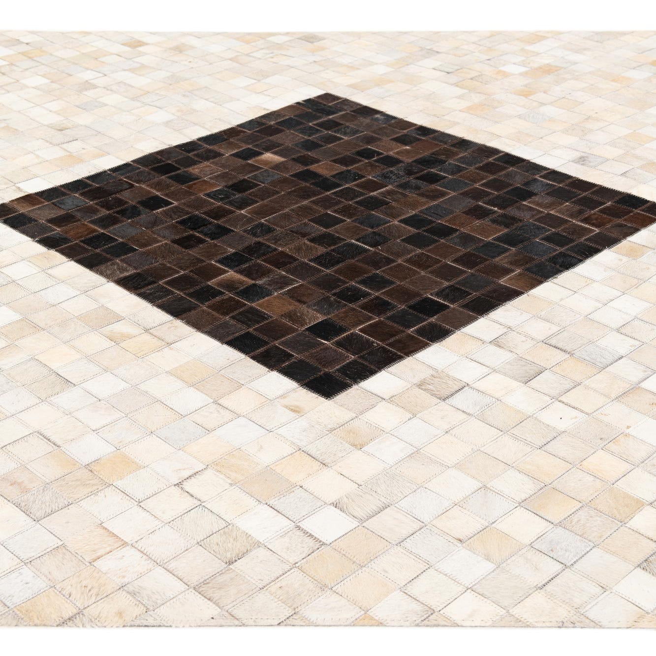 A 5x8 rectangular Cowhide Stocks rug featuring a modern pattern of multi-colored squares with a central column of dark diamond shapes.