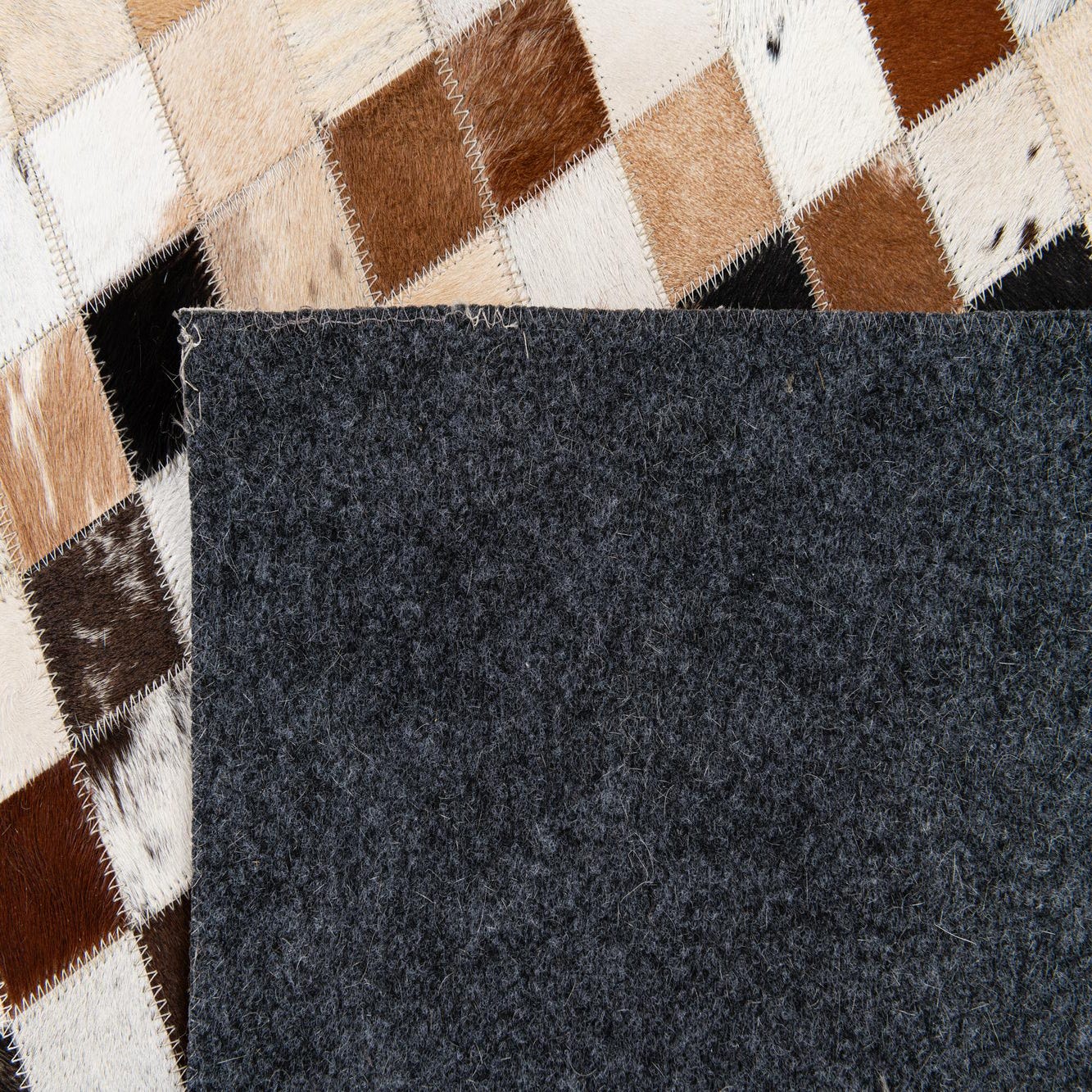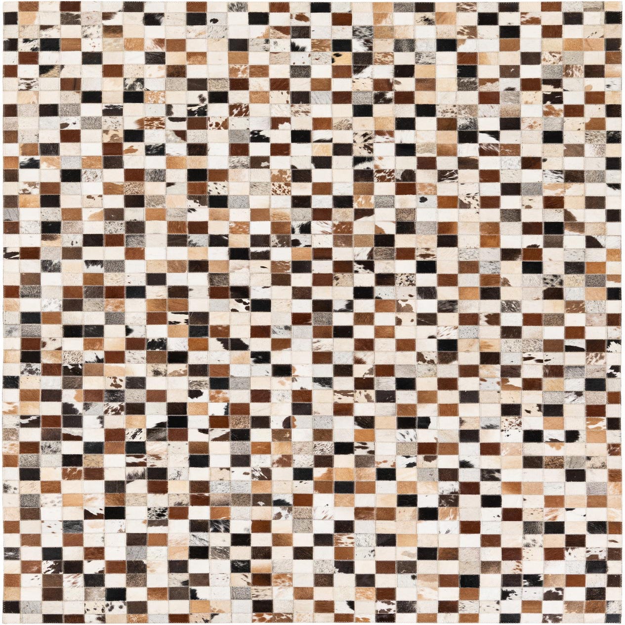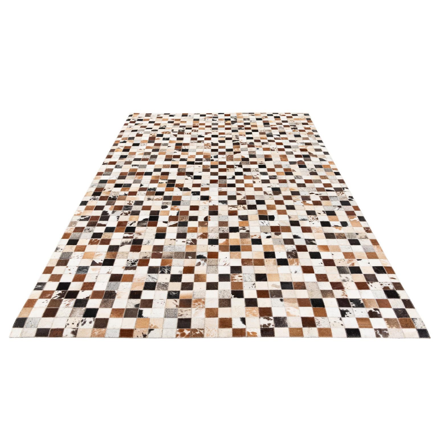 A rectangular 5x8 modern cowhide rug with a multi-colored checkered pattern in shades of brown, black, and white.