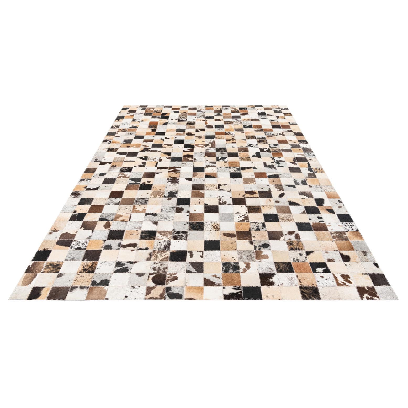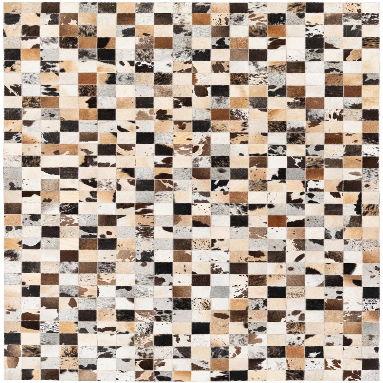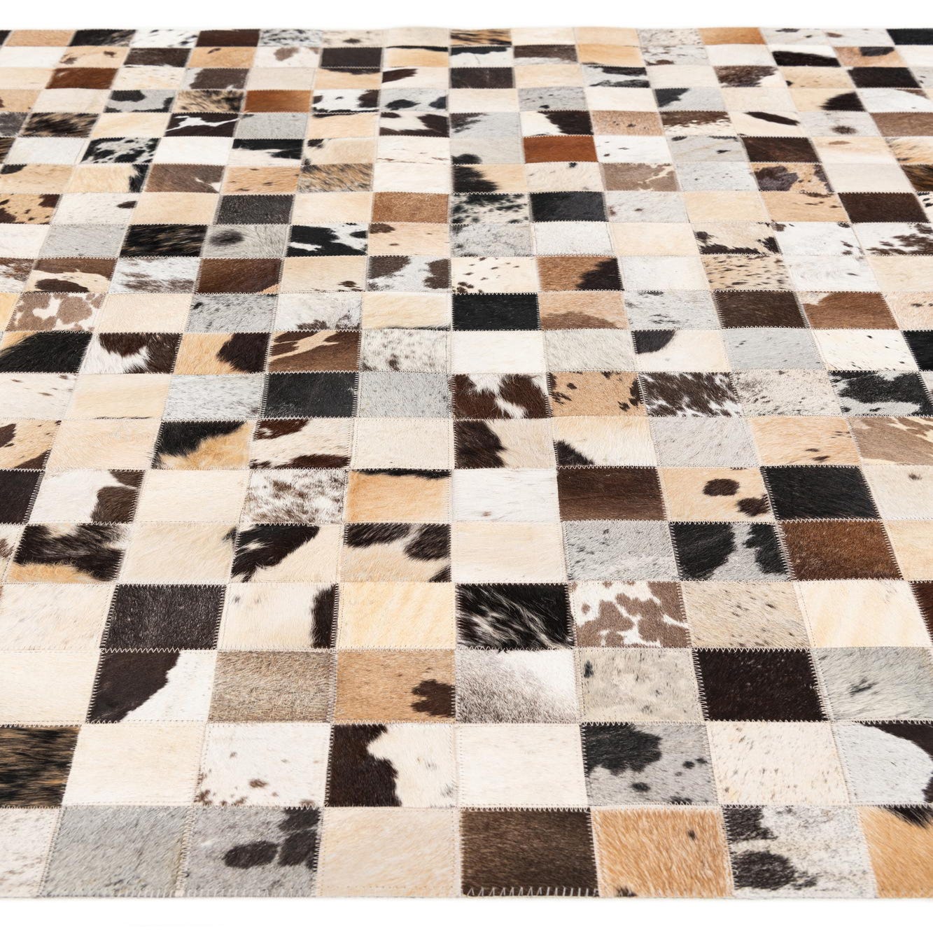 A 5x8 rectangular Cowhide Stocks rug featuring a modern patchwork of multi-colored cowhide squares in shades of brown, black, white, and tan.