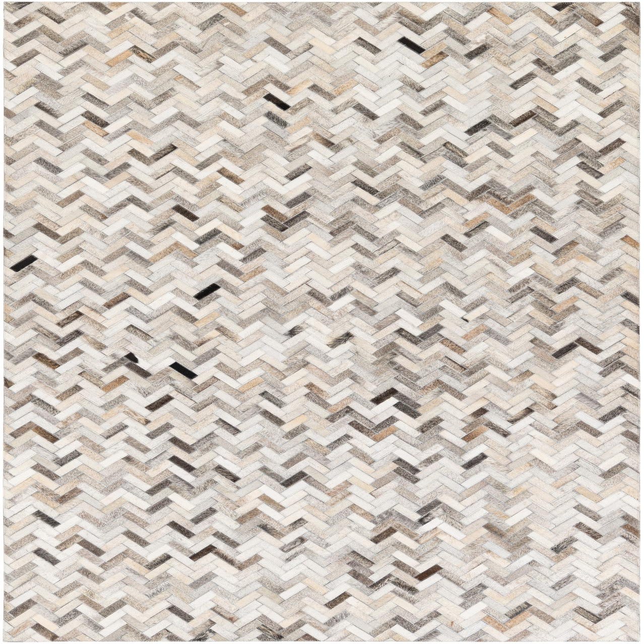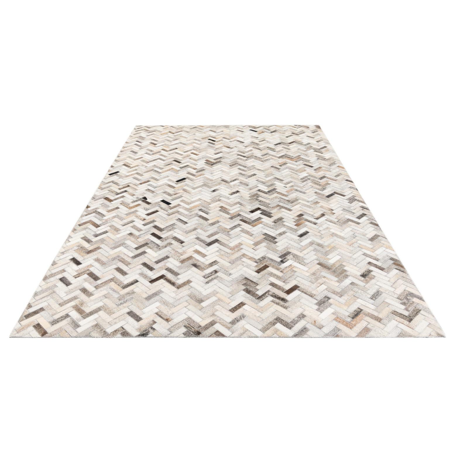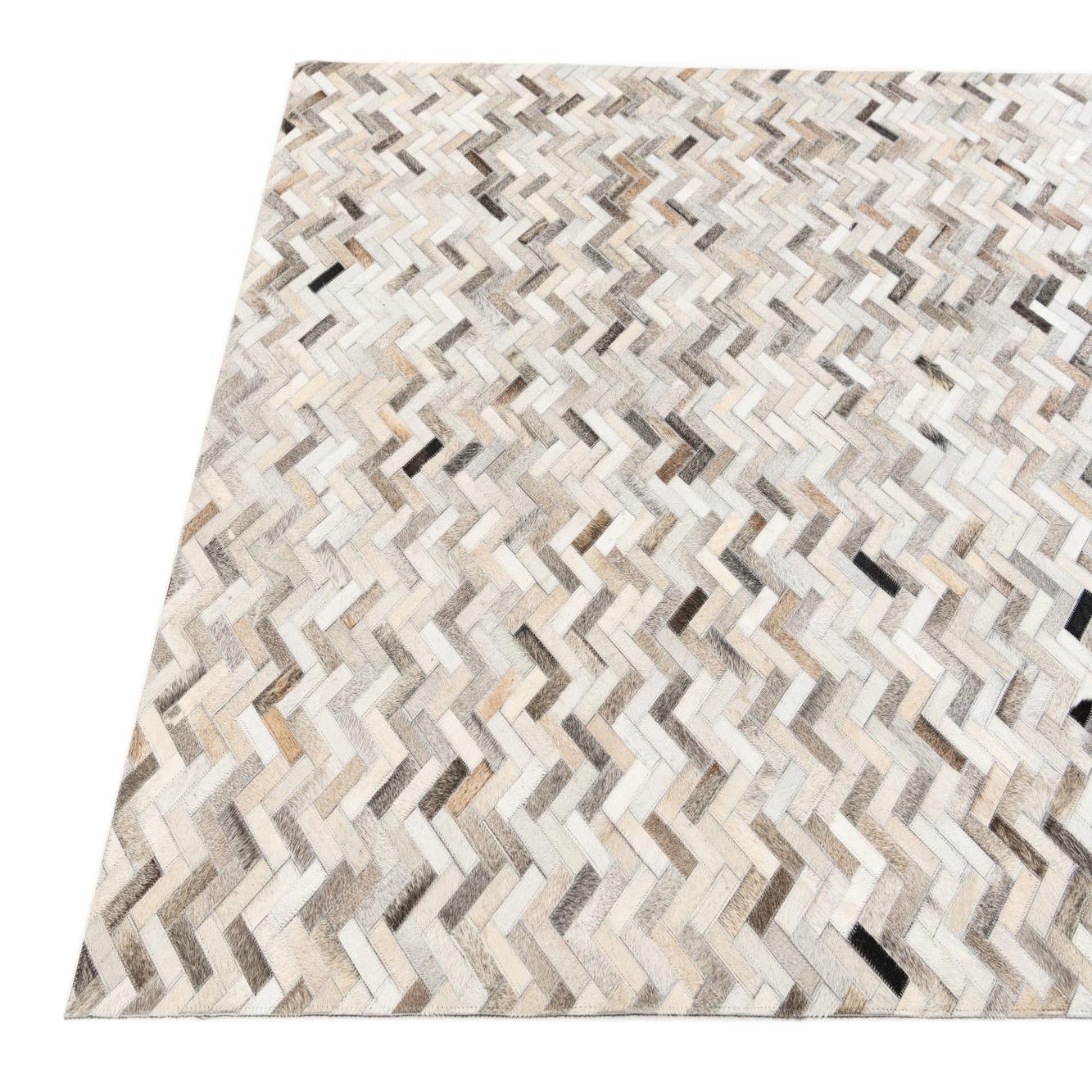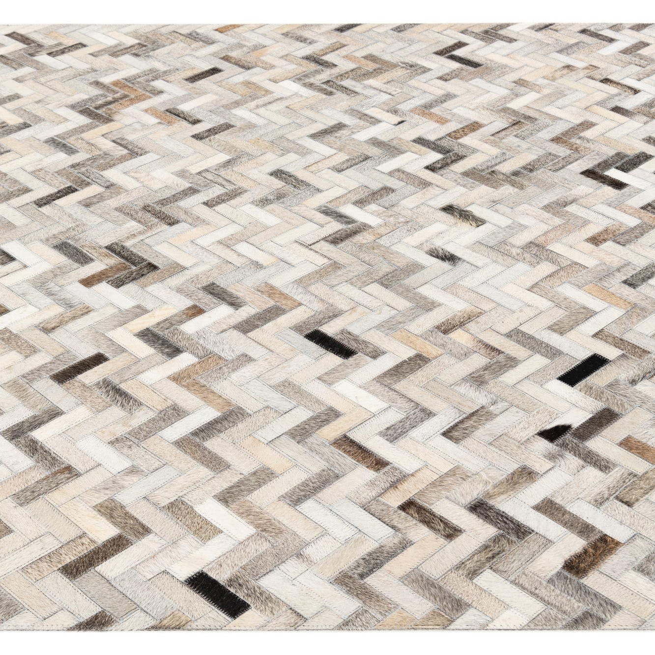 Hand made of cowhide and leather, this rug is constructed from narrow, stitched panels arranged in a tight herringbone that produces a subtle chevron effect. The multi background brings together ivory, beige, light brown, gray and deeper brown tones, with small darker accents that add depth and movement. The hair-on cowhide surface is soft to the touch with a slight natural nap and gentle sheen, offering a tactile, layered texture underfoot.