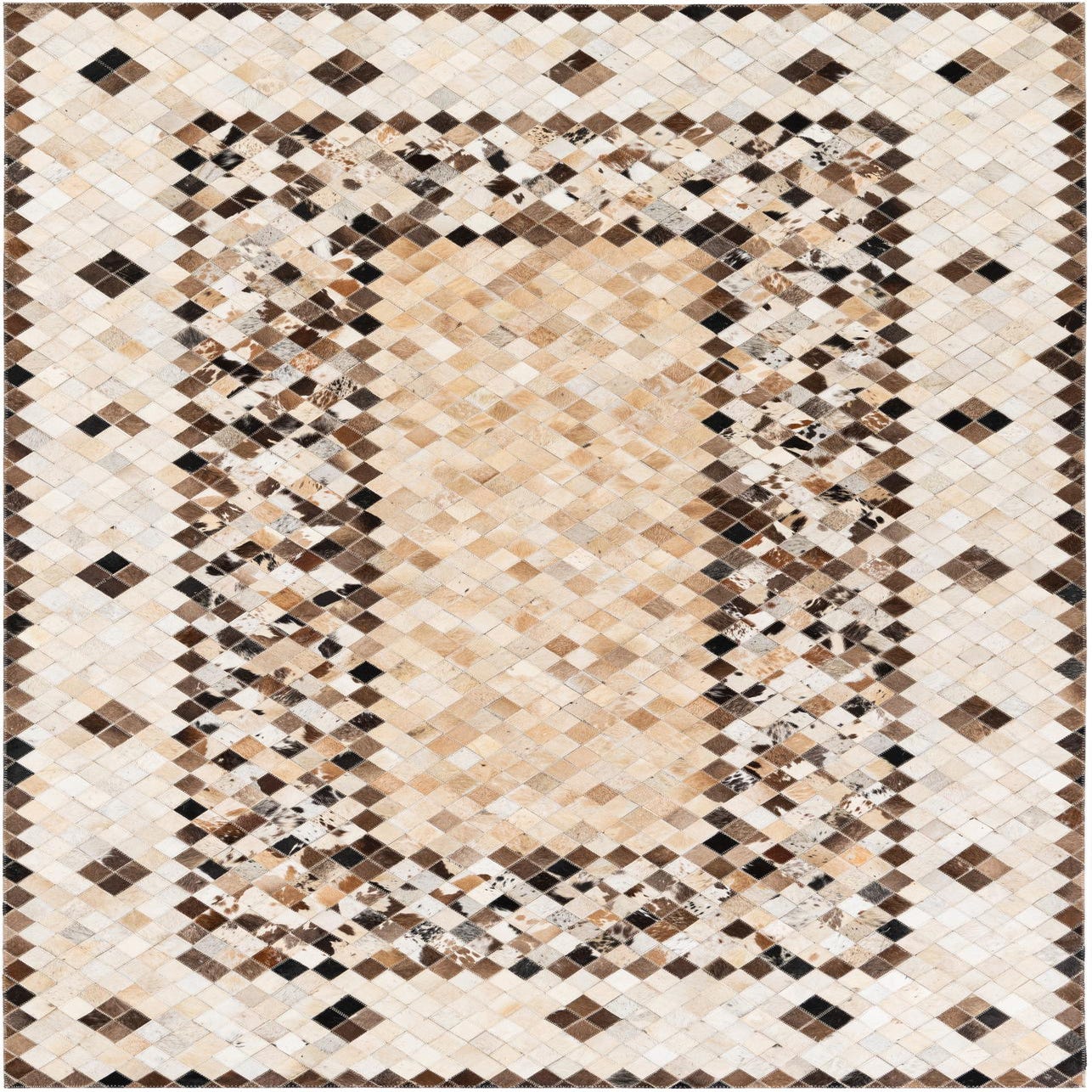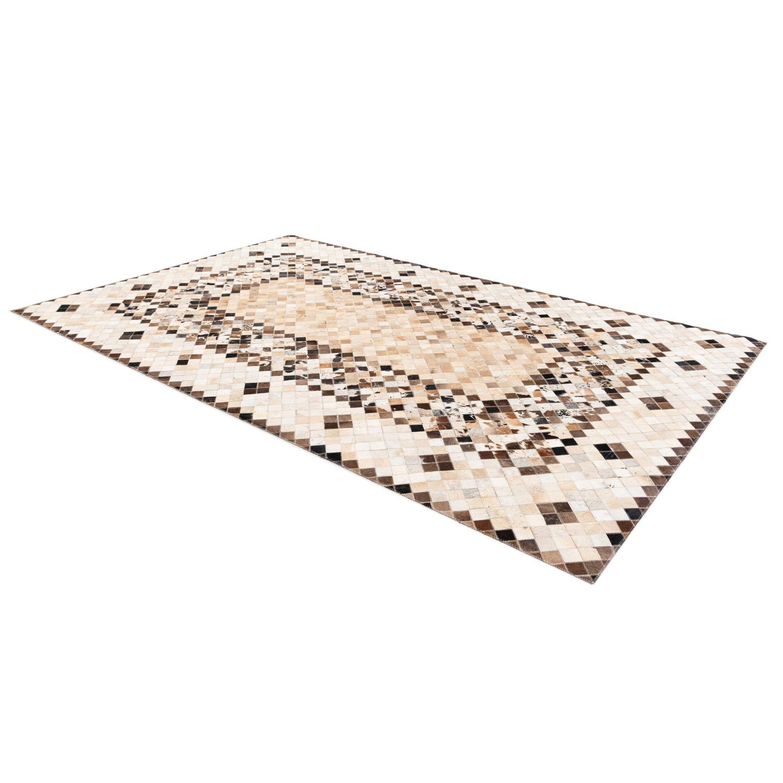 A rectangular 5x8 modern cowhide rug with a multi-colored patchwork pattern in shades of brown, beige, and white.