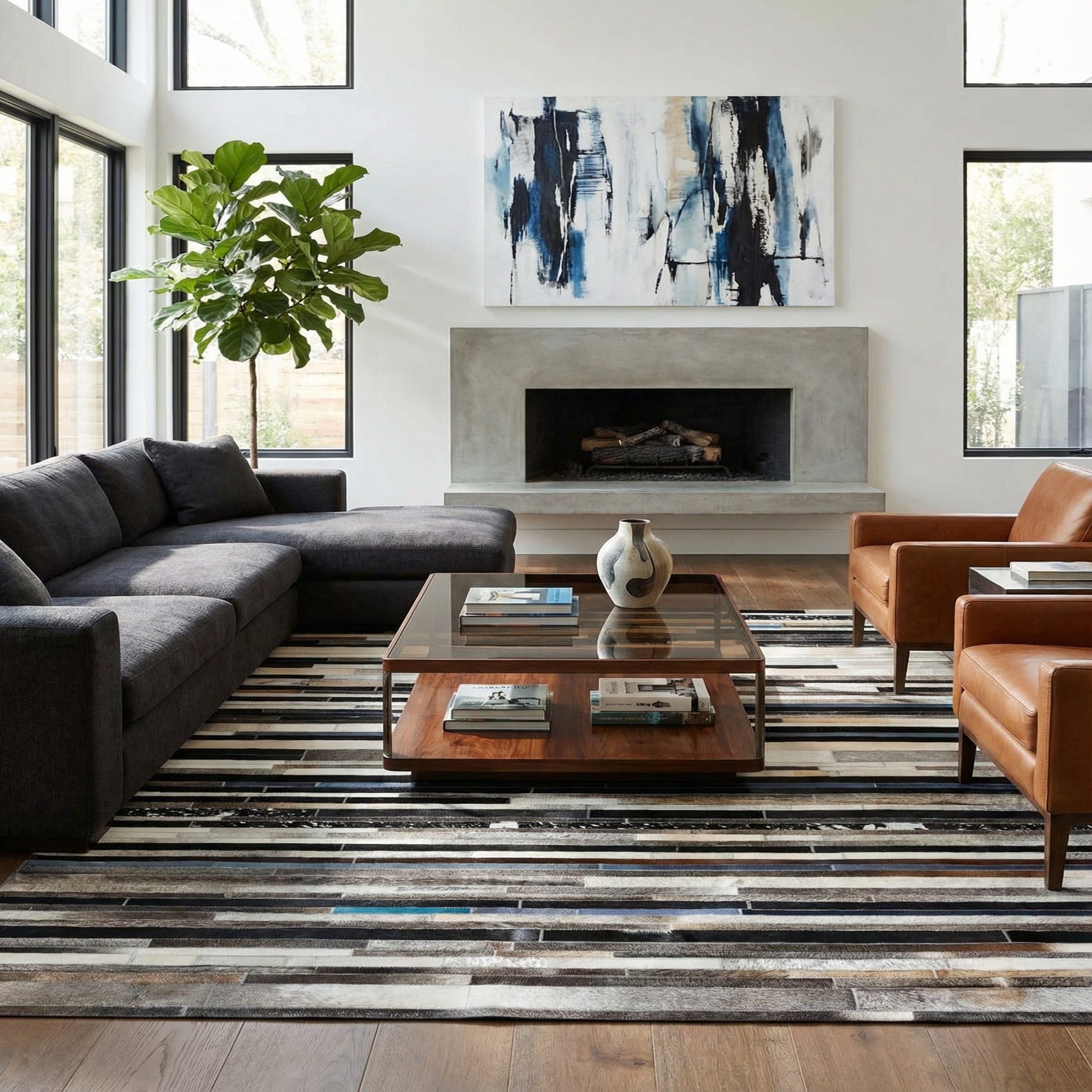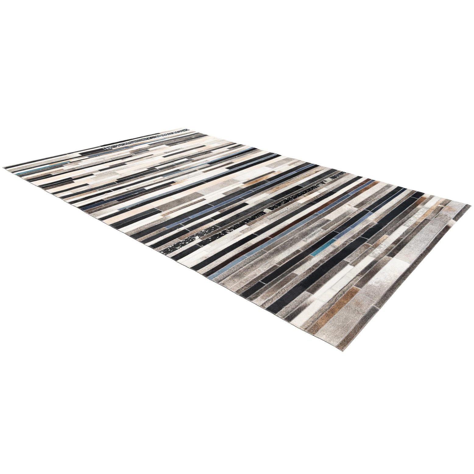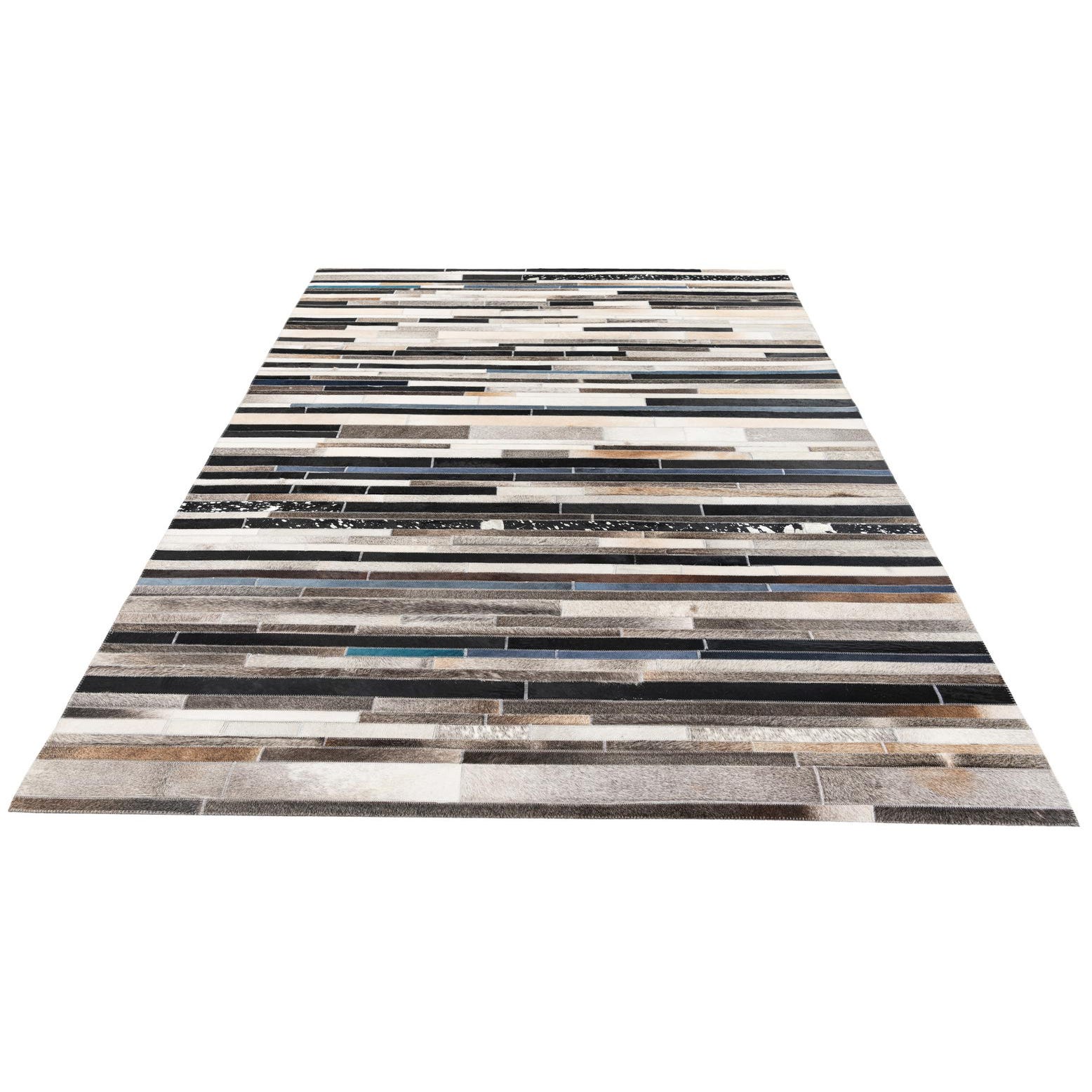 A rectangular 5x8 modern cowhide rug with a multi-colored stripe pattern in black, white, brown, gray, and blue tones.