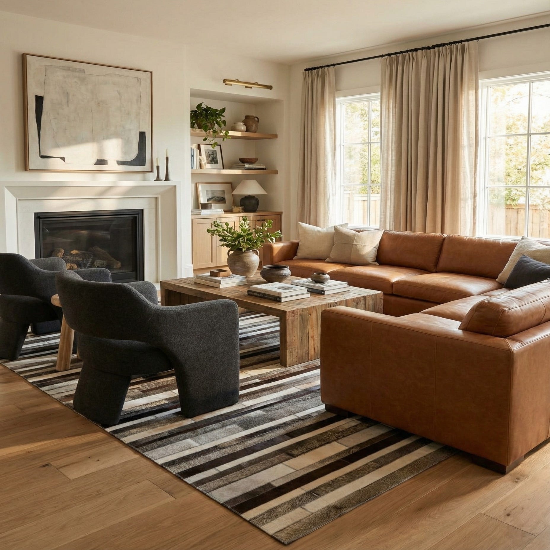This rug works well as an anchor for contemporary or transitional rooms—place it under a coffee table to ground a neutral seating area, layer it in a home office beneath a desk and chair, or set it in an entryway to introduce textural interest. It pairs nicely with warm wood tones, leather furniture and matte metal accents, and complements both minimalist and rustic interiors that favor natural materials.